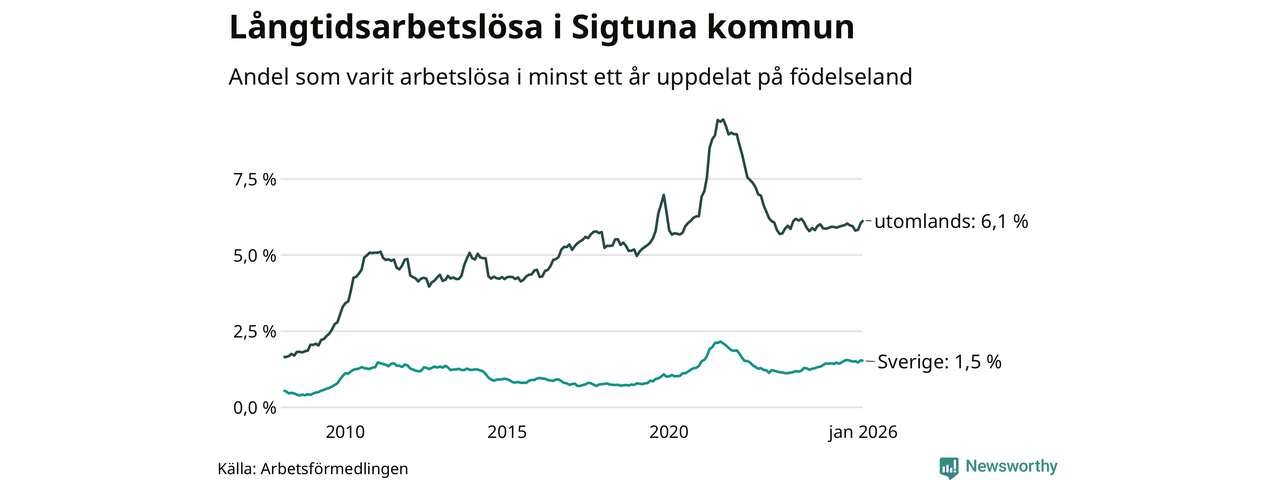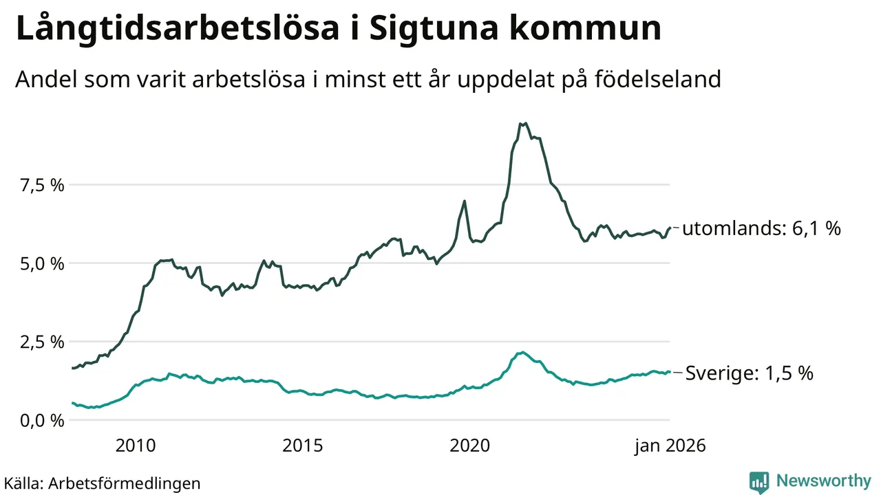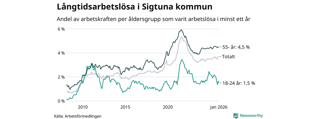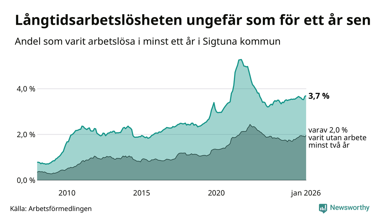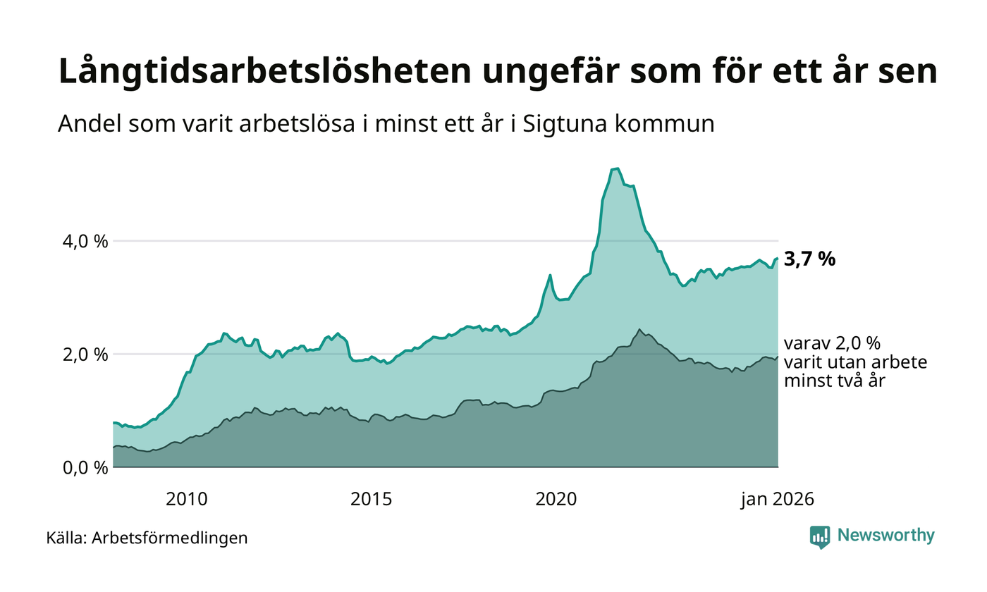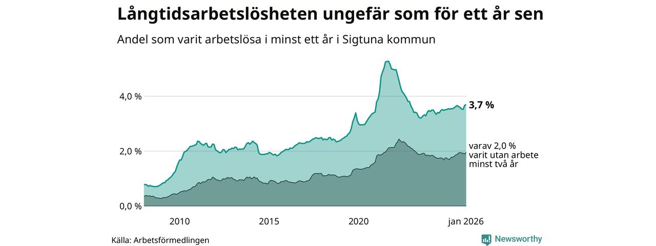 I januari hade 1 000 Sigtunabor varit arbetslösa i minst ett år, vilket är 15 fler än månaden innan. 1 000 personer motsvarar 3,7 procent av arbetskraften i kommunen – andelen långtidsarbetslösa är ungefär på samma nivå som för ett år sedan.