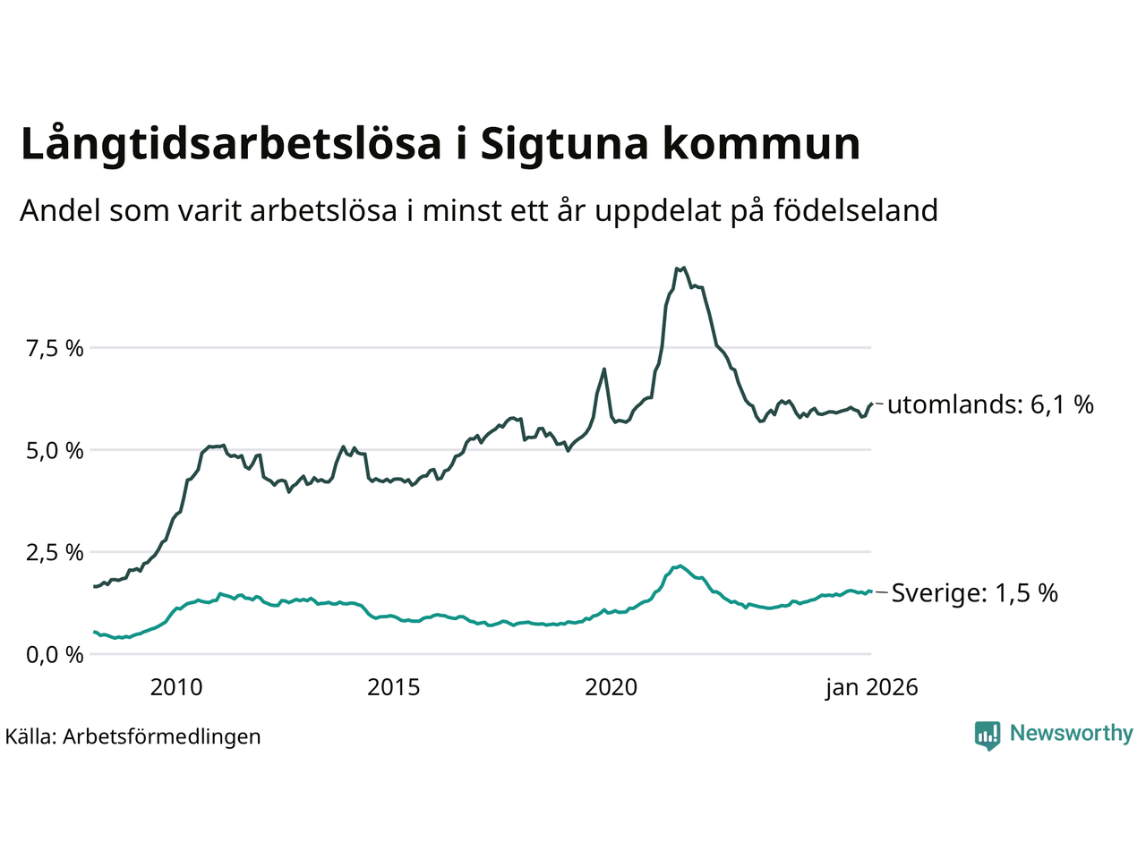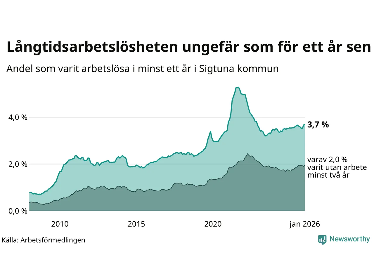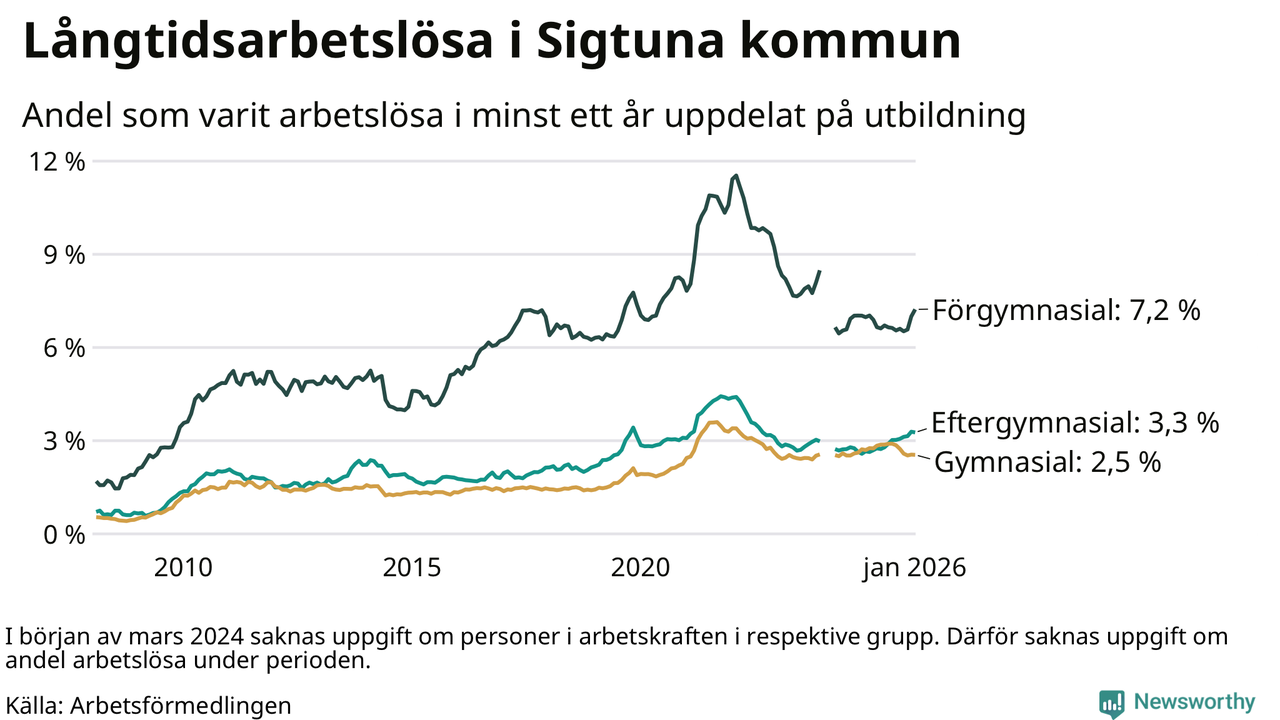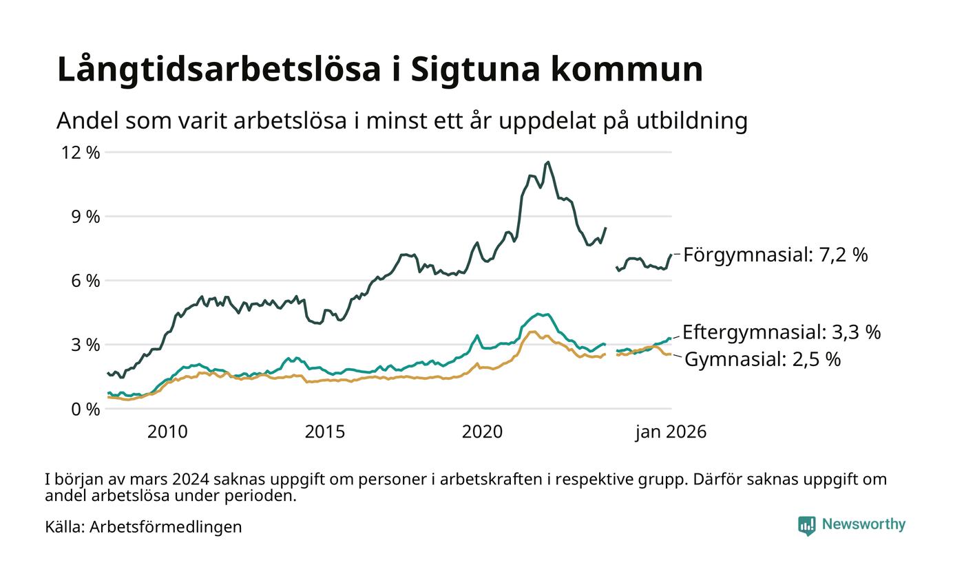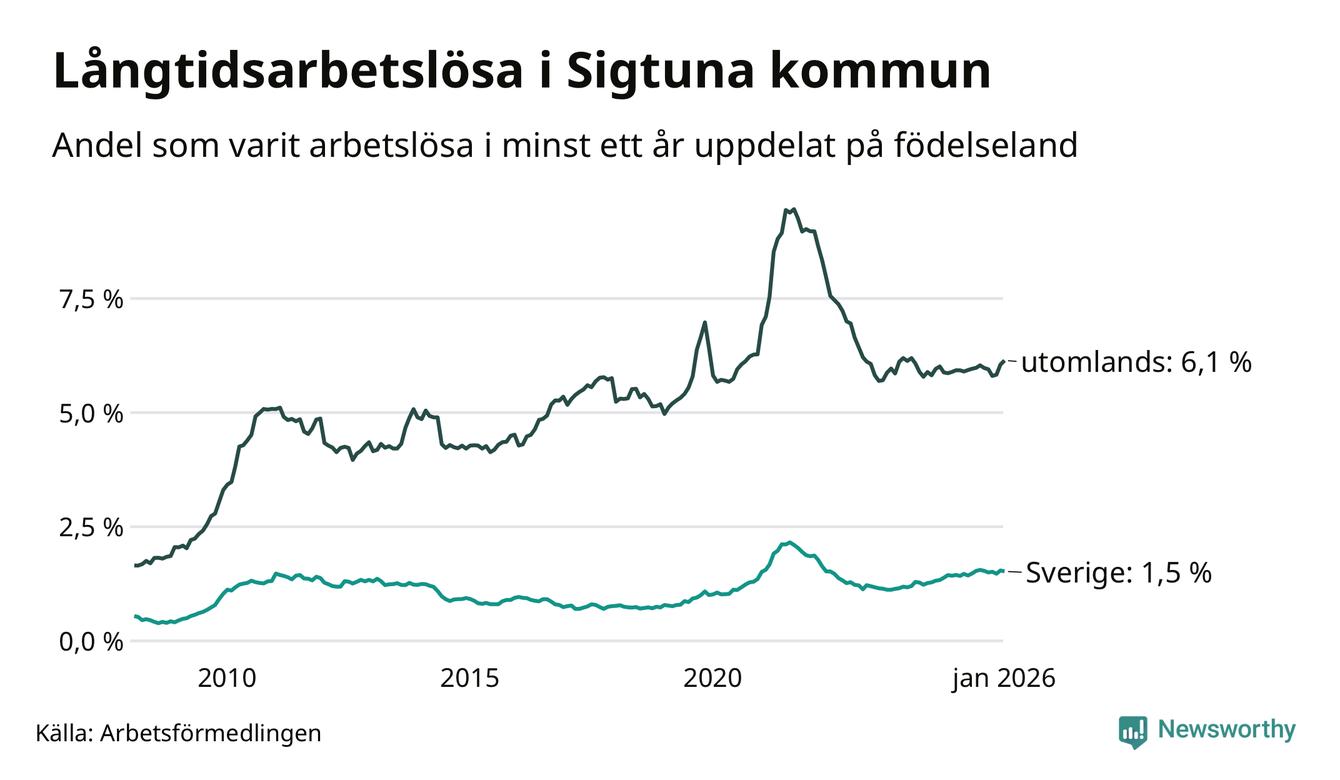 I januari hade 1 000 Sigtunabor varit arbetslösa i minst ett år, vilket är 15 fler än månaden innan. 1 000 personer motsvarar 3,7 procent av arbetskraften i kommunen – andelen långtidsarbetslösa är ungefär på samma nivå som för ett år sedan.