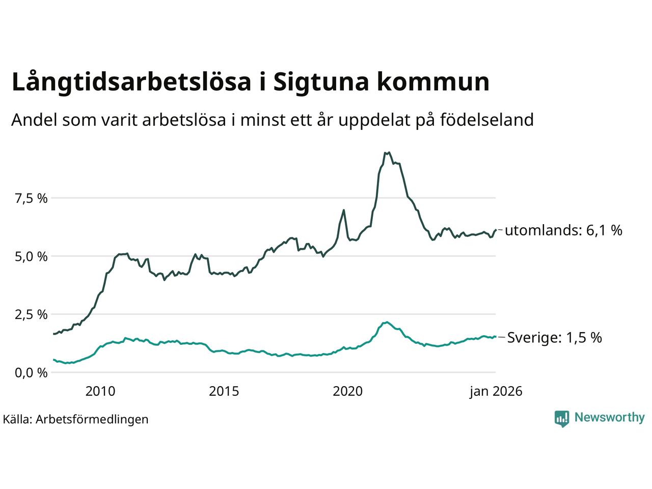 218 av de långtidsarbetslösa i Sigtuna är födda i Sverige, medan 782 är födda utomlands. Det innebär att långtidsarbetslösheten bland Sverigefödda är 1,5 procent, medan den är fyra gånger så hög – 6,1 procent – bland födda utomlands. Även i riket som helhet är arbetslösheten högre bland utrikesfödda.
