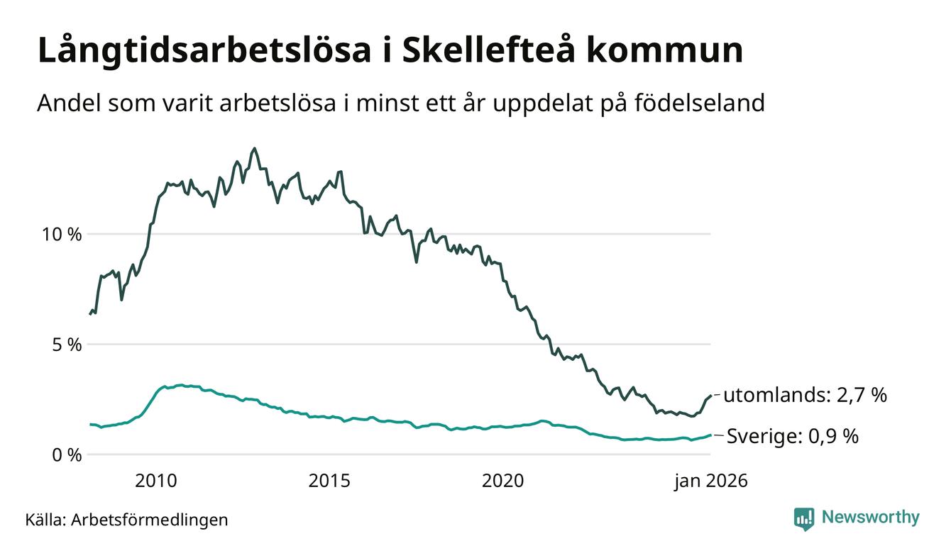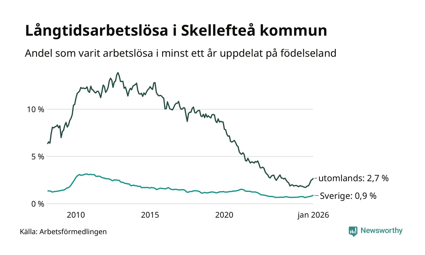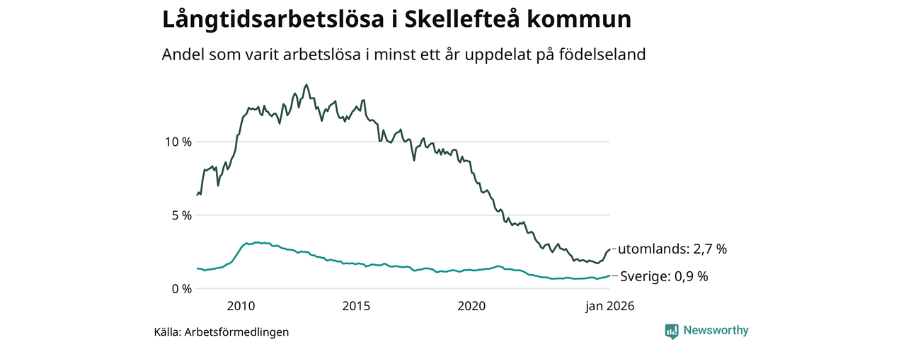 I januari hade 472 Skellefteåbor varit arbetslösa i minst ett år, vilket är 17 fler än månaden innan. Det är den sjunde månaden i rad med ökande antal långtidsarbetslösa. 472 personer motsvarar 1,2 procent av arbetskraften i kommunen – andelen långtidsarbetslösa är 0,3 procentenheter högre än samma månad för ett år sedan. Skellefteå tillhör de kommuner som har lägst andel långtidsarbetslösa i hela landet just nu.