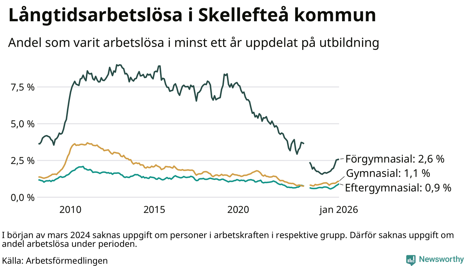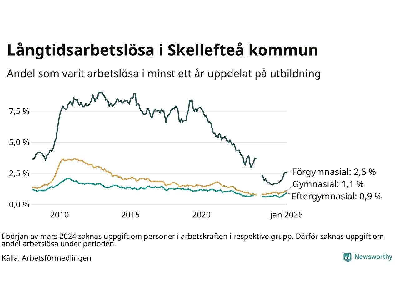 Inte sedan september 2022 har andelen långtidsarbetslösa varit så hög i Skellefteå. Det visar Arbetsförmedlingens senaste månadsstatistik.