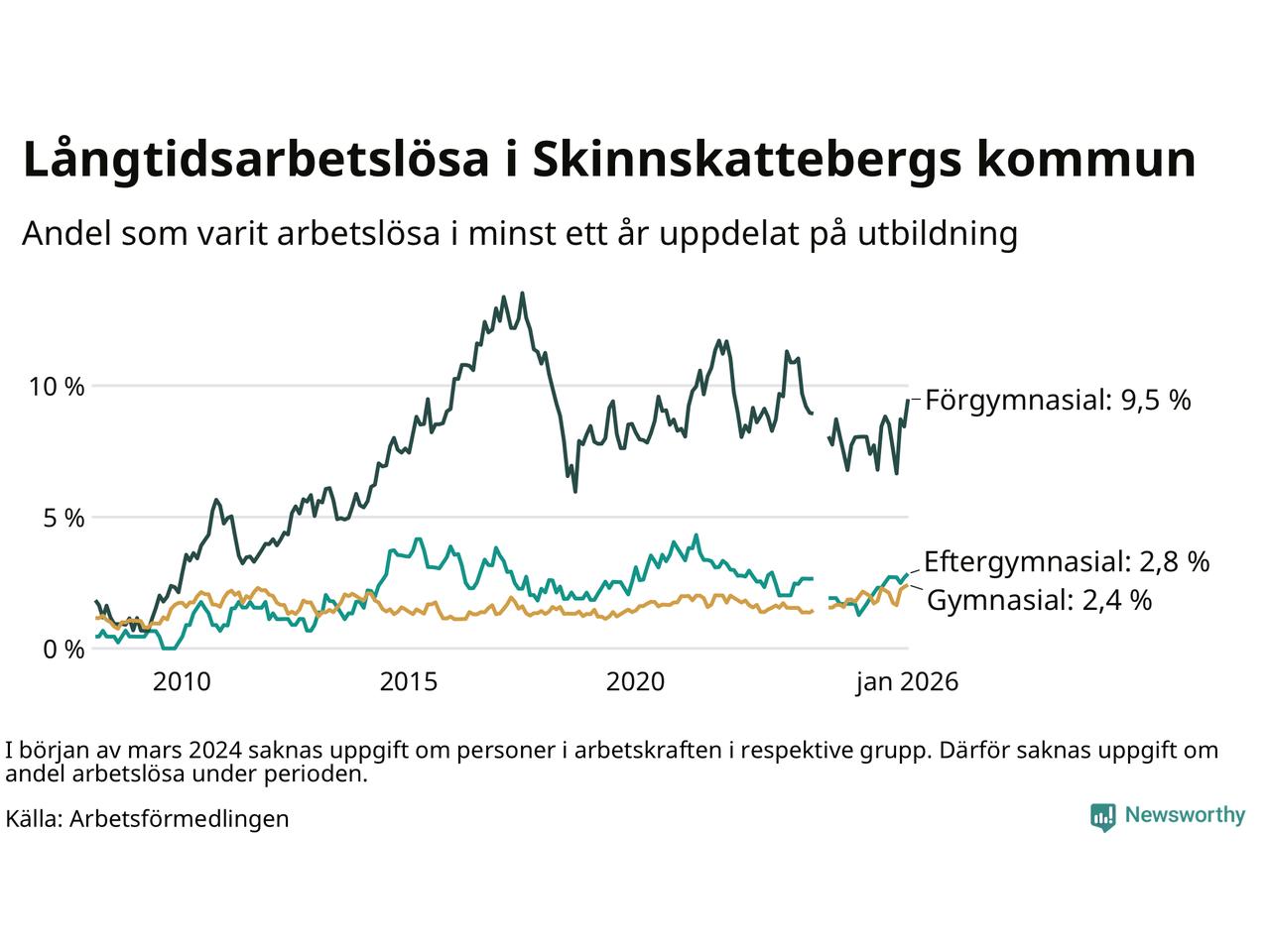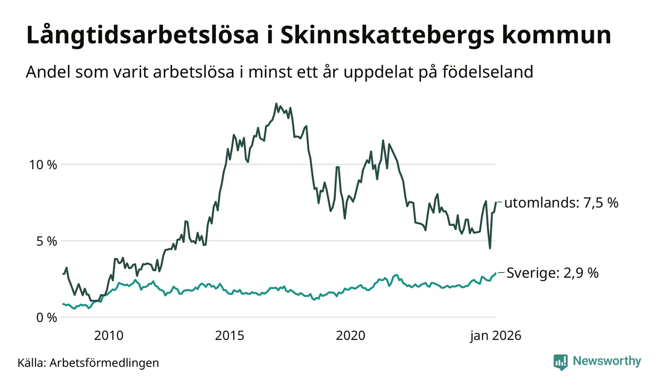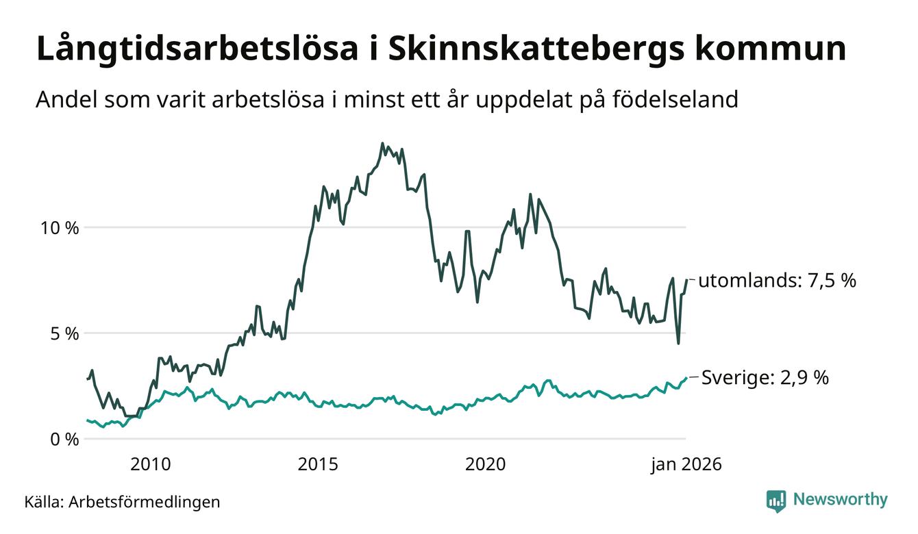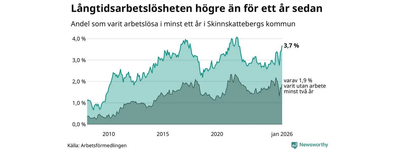 Inte sedan december 2021 har andelen långtidsarbetslösa varit så hög i Skinnskatteberg. Det visar Arbetsförmedlingens senaste månadsstatistik.