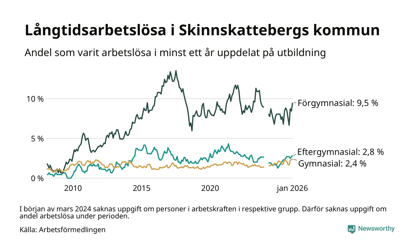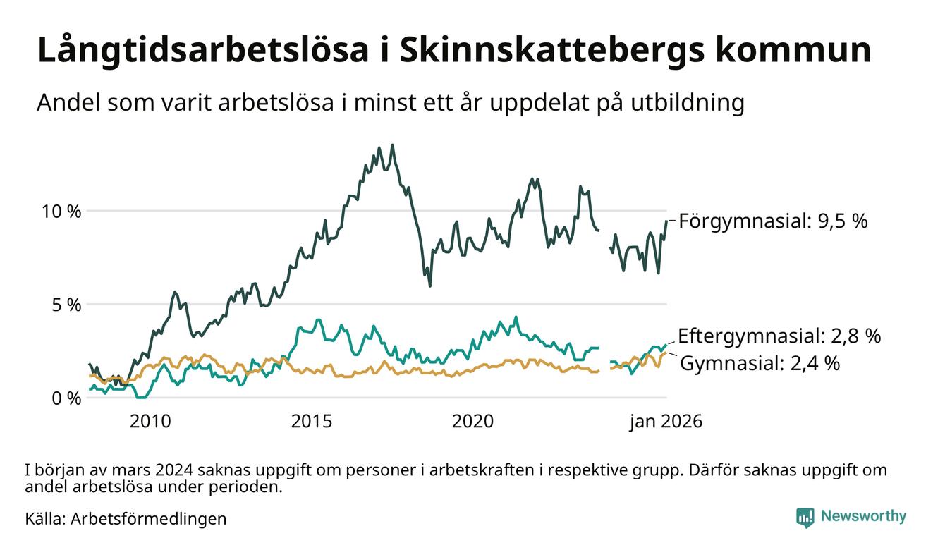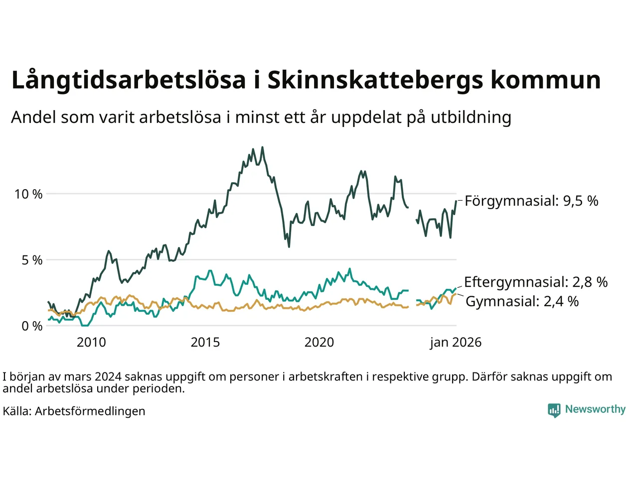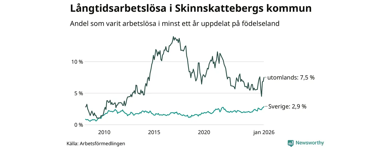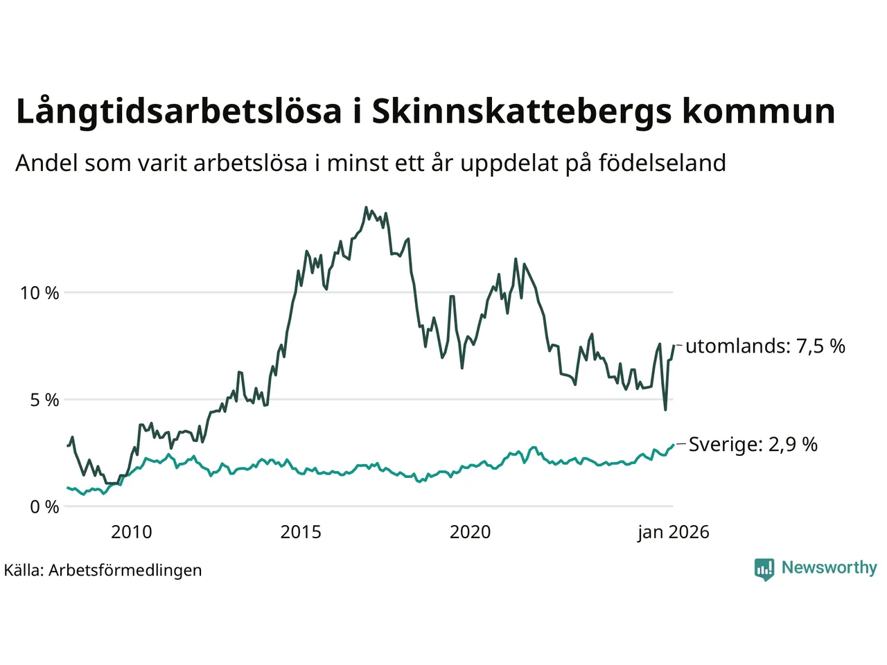 Inte sedan december 2021 har andelen långtidsarbetslösa varit så hög i Skinnskatteberg. Det visar Arbetsförmedlingens senaste månadsstatistik.