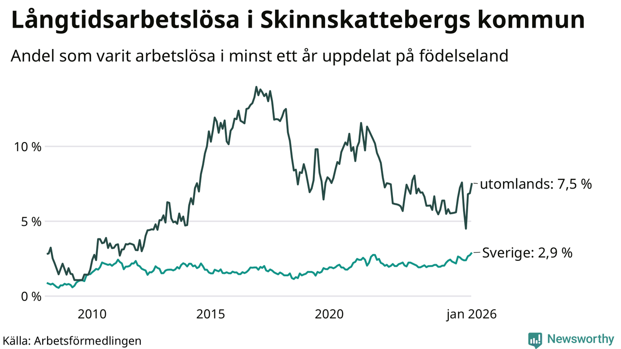 44 av de långtidsarbetslösa i Skinnskatteberg är födda i Sverige, medan 23 är födda utomlands. Det innebär att långtidsarbetslösheten bland Sverigefödda är 2,9 procent, medan den är tre gånger så hög – 7,5 procent – bland födda utomlands. Även i riket som helhet är arbetslösheten högre bland utrikesfödda.