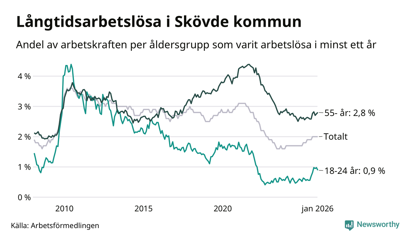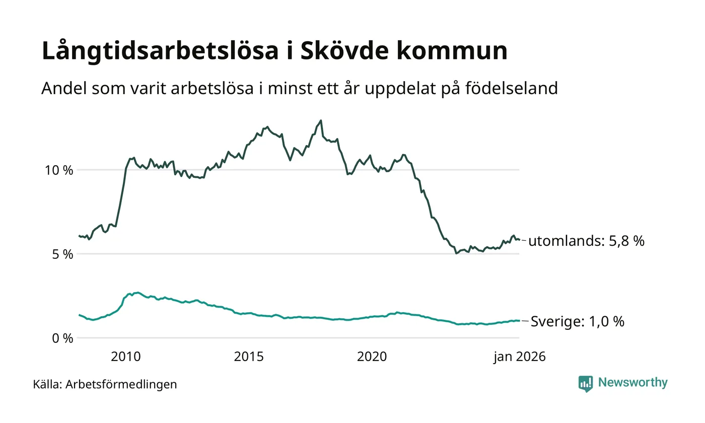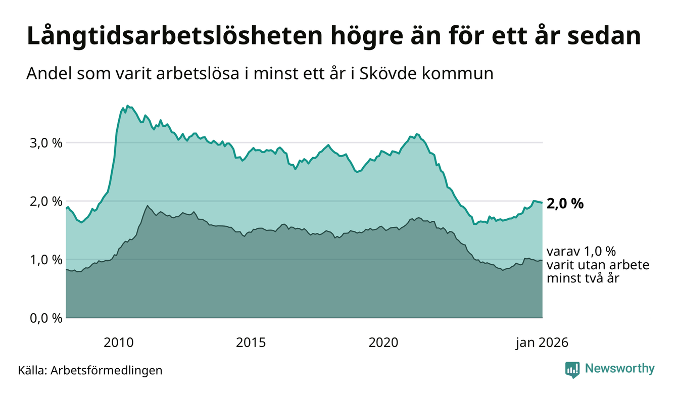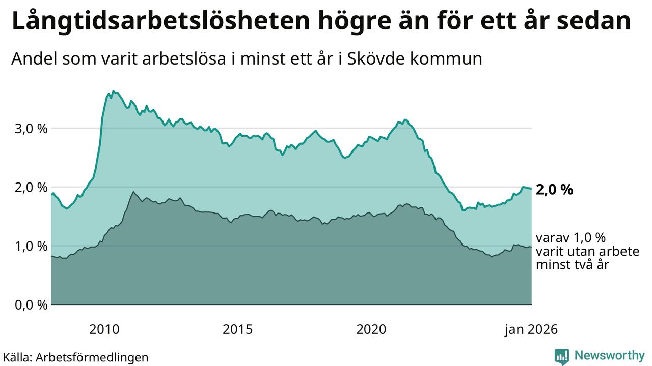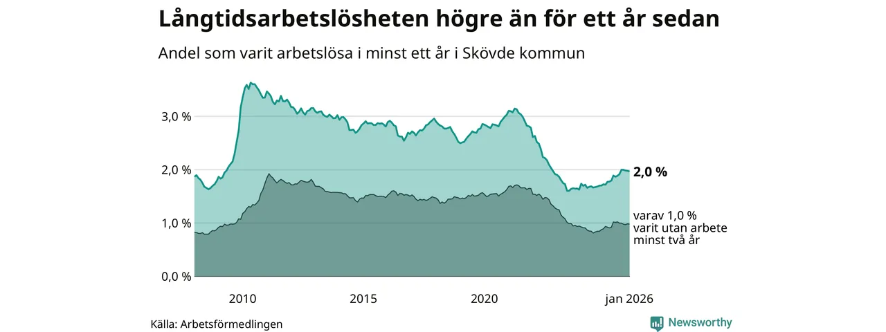 I januari hade 591 Skövdebor varit arbetslösa i minst ett år, vilket är en fler än månaden innan. 591 personer motsvarar 2,0 procent av arbetskraften i kommunen – andelen långtidsarbetslösa är 0,3 procentenheter högre än samma månad för ett år sedan.