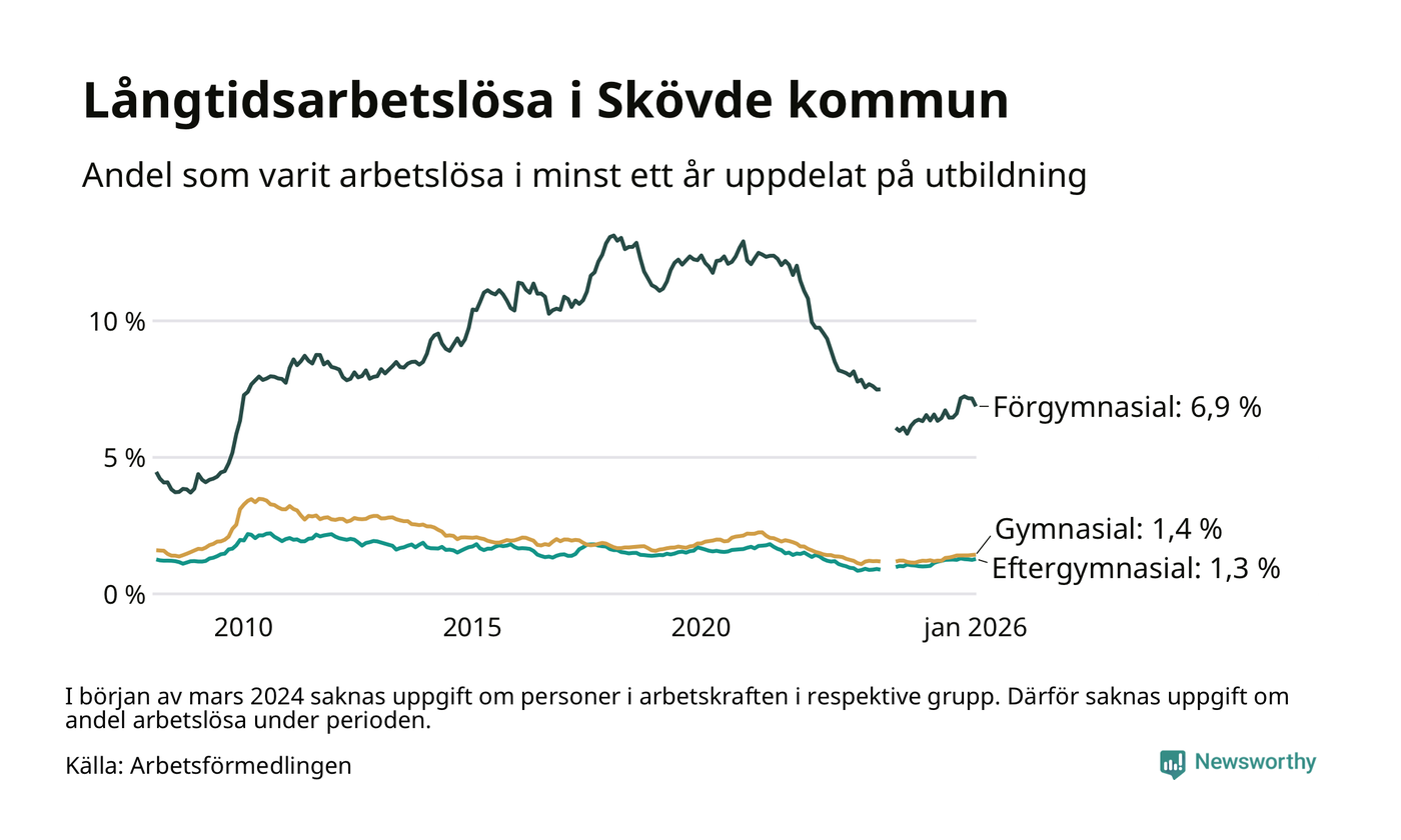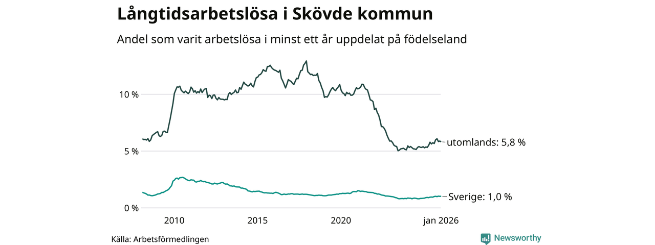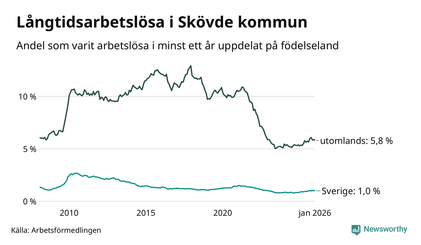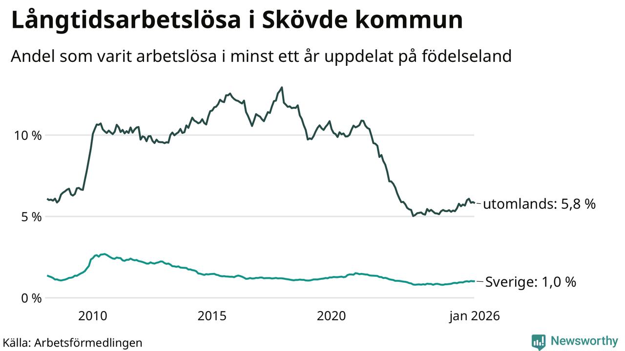 I januari hade 591 Skövdebor varit arbetslösa i minst ett år, vilket är en fler än månaden innan. 591 personer motsvarar 2,0 procent av arbetskraften i kommunen – andelen långtidsarbetslösa är 0,3 procentenheter högre än samma månad för ett år sedan.