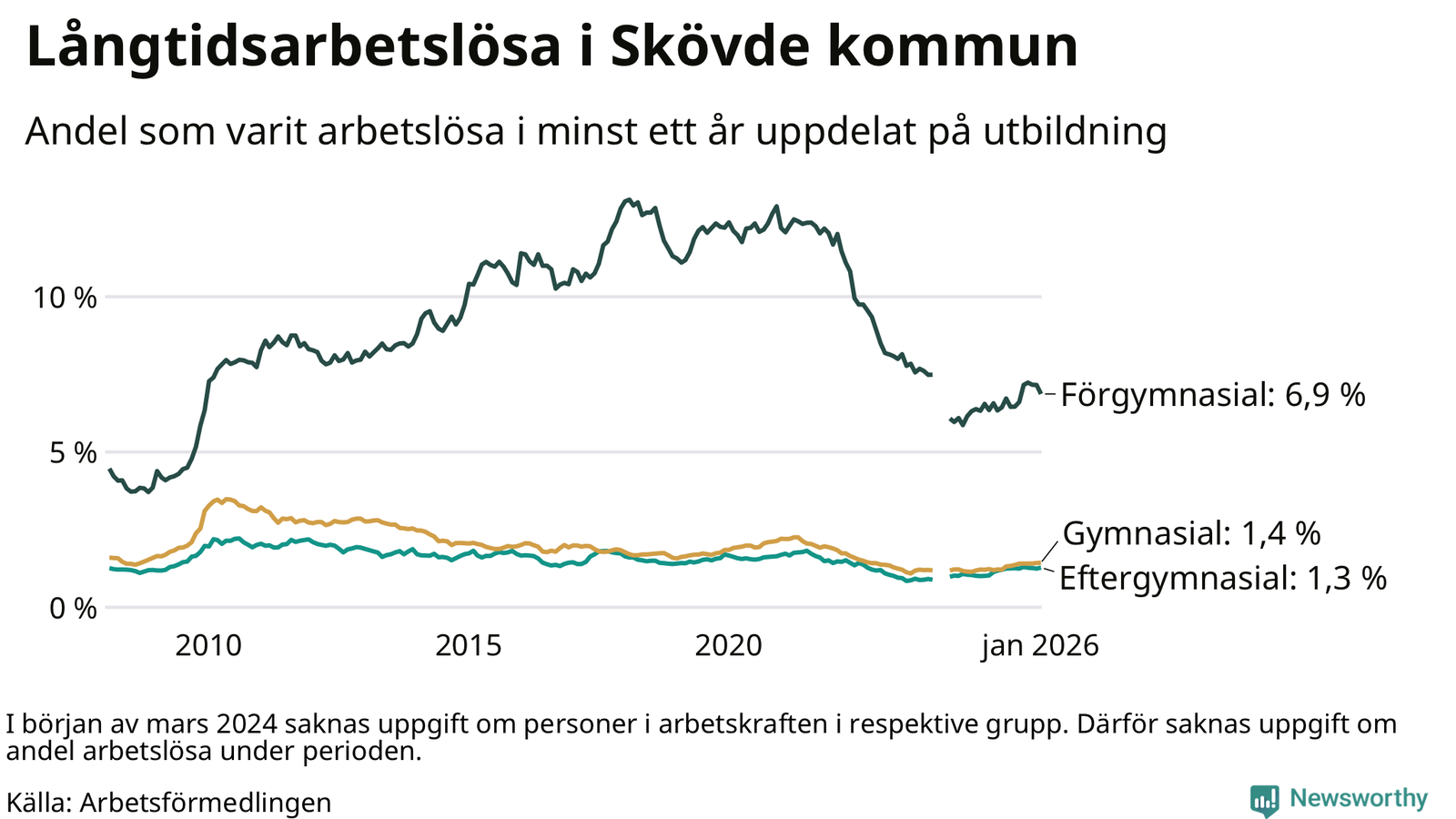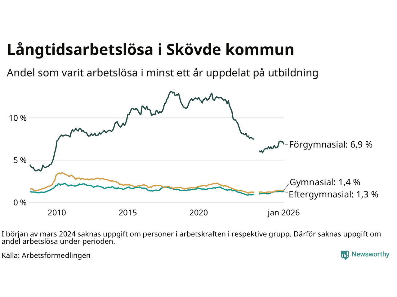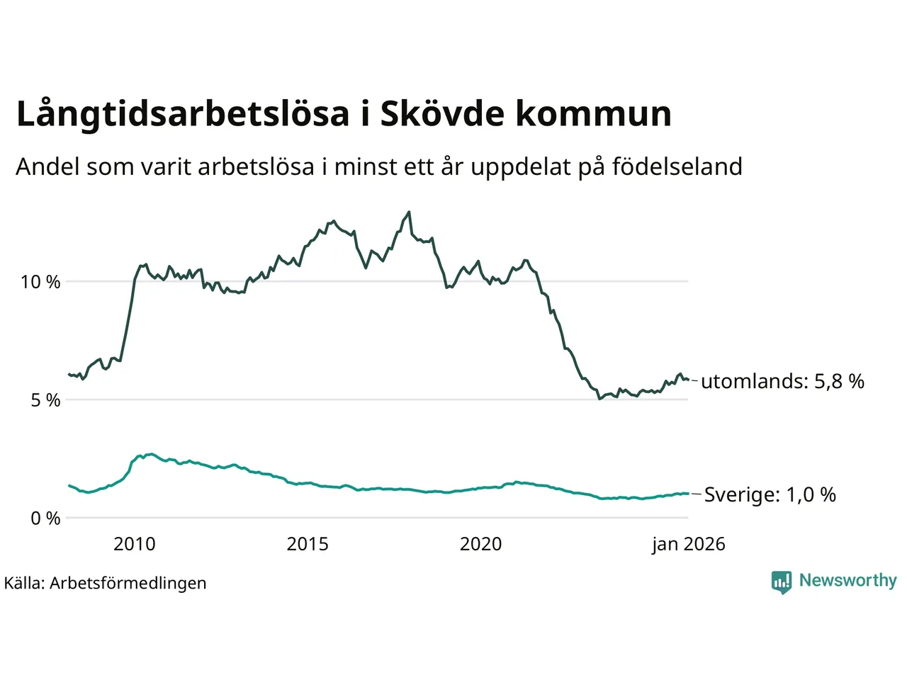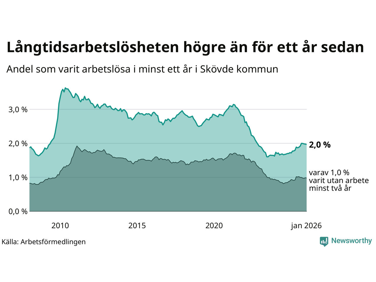 I januari hade 591 Skövdebor varit arbetslösa i minst ett år, vilket är en fler än månaden innan. 591 personer motsvarar 2,0 procent av arbetskraften i kommunen – andelen långtidsarbetslösa är 0,3 procentenheter högre än samma månad för ett år sedan.