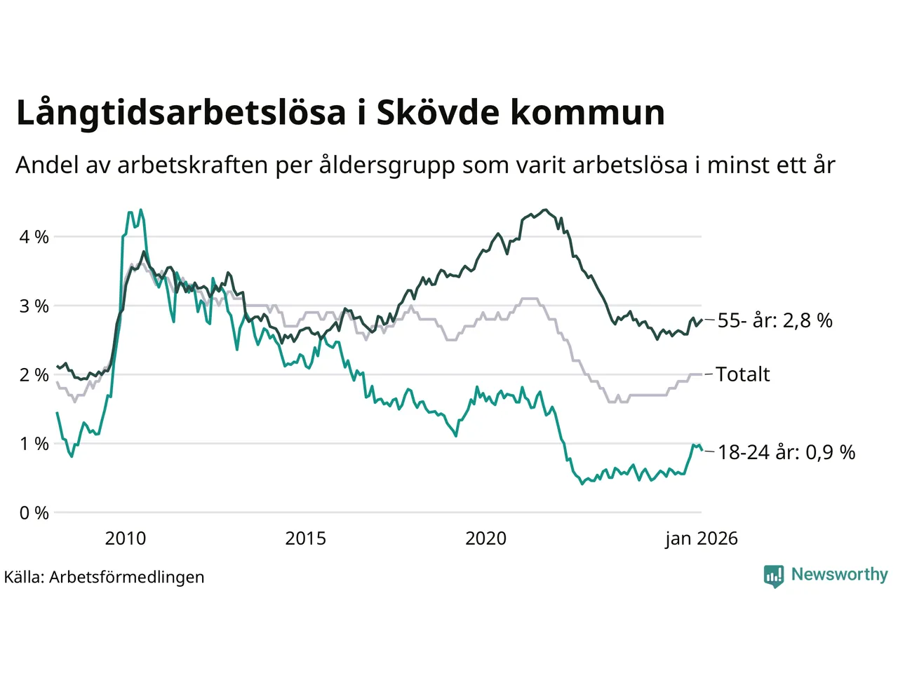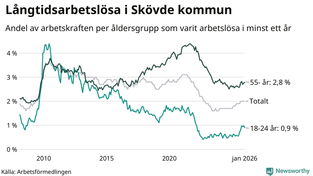 Av de 591 personerna som varit arbetslösa i mer än ett år i Skövde kommun är 167 personer mellan 55 och 661 år och 32 är mellan 18 och 24 år. För den äldre gruppen är andelen arbetslösa 2,8 procent medan den i den yngre gruppen är 0,9 procent. Även i riket som helhet är långtidsarbetslösheten högre i gruppen äldre.