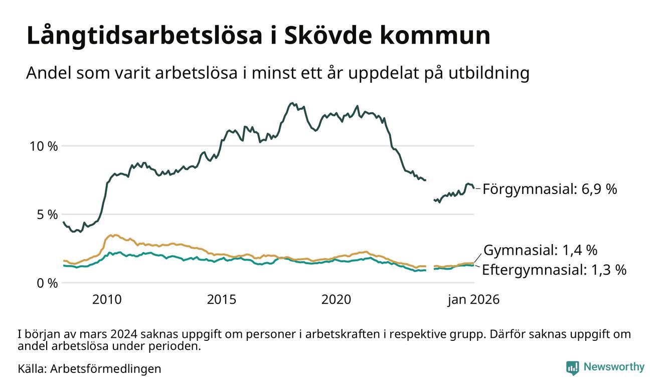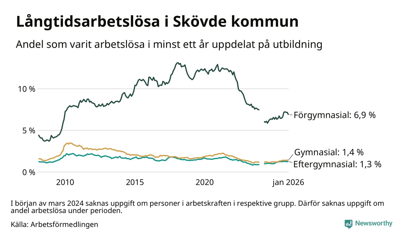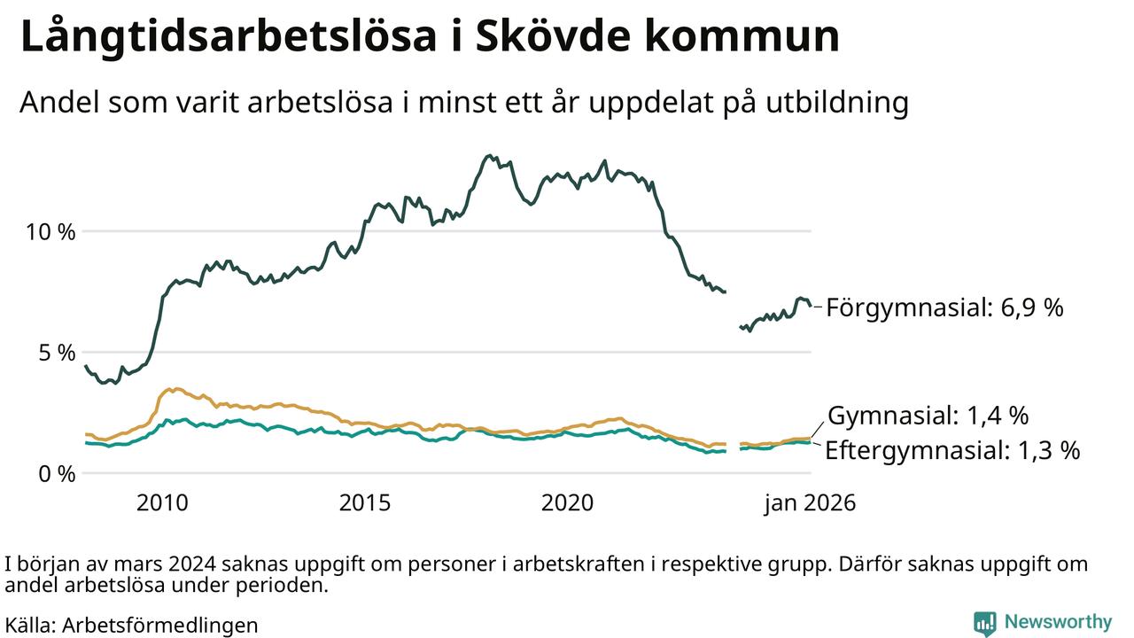 Andelen som varit utan arbete i minst ett år i Skövde var högre i januari jämfört med samma månad för ett år sedan. Det visar Arbetsfömedlingens senaste månadsstatistik.