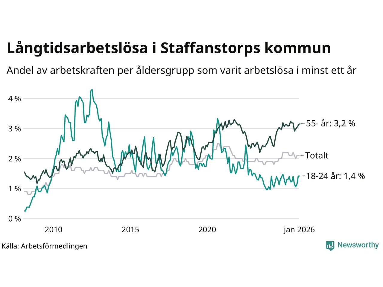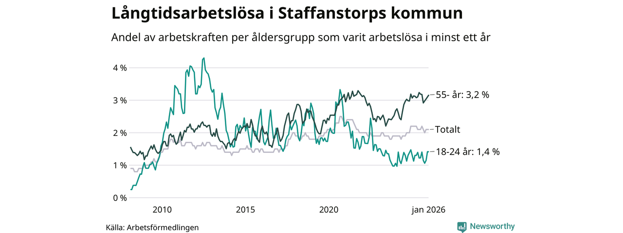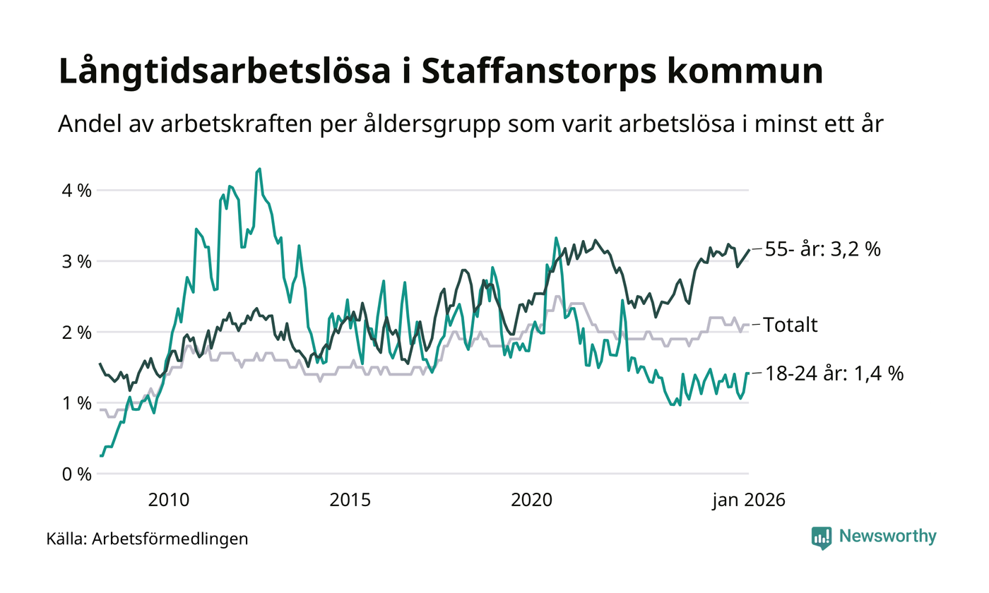 Av de 290 personerna som varit arbetslösa i mer än ett år i Staffanstorps kommun är 90 personer mellan 55 och 661 år och 16 är mellan 18 och 24 år. För den äldre gruppen är andelen arbetslösa 3,2 procent medan den i den yngre gruppen är 1,4 procent. Även i riket som helhet är långtidsarbetslösheten högre i gruppen äldre.