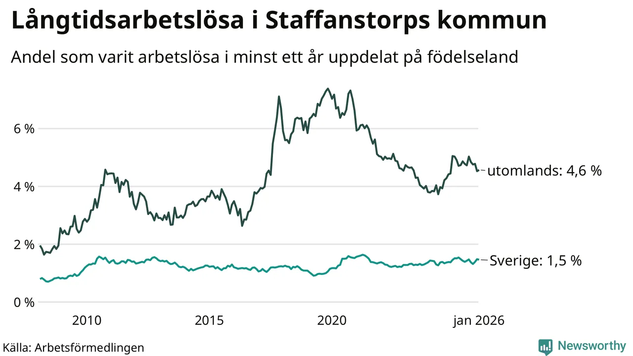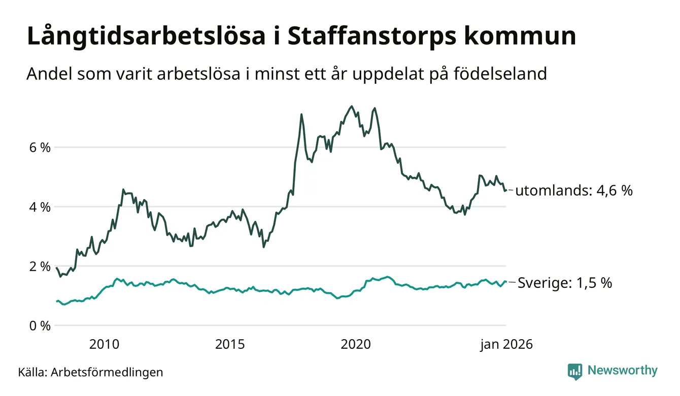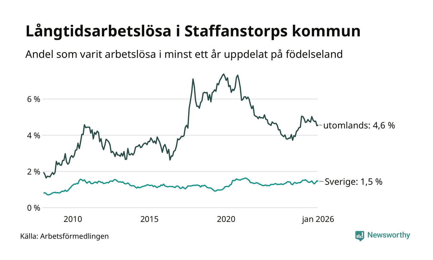 159 av de långtidsarbetslösa i Staffanstorp är födda i Sverige, medan 131 är födda utomlands. Det innebär att långtidsarbetslösheten bland Sverigefödda är 1,5 procent, medan den är tre gånger så hög – 4,6 procent – bland födda utomlands. Även i riket som helhet är arbetslösheten högre bland utrikesfödda.