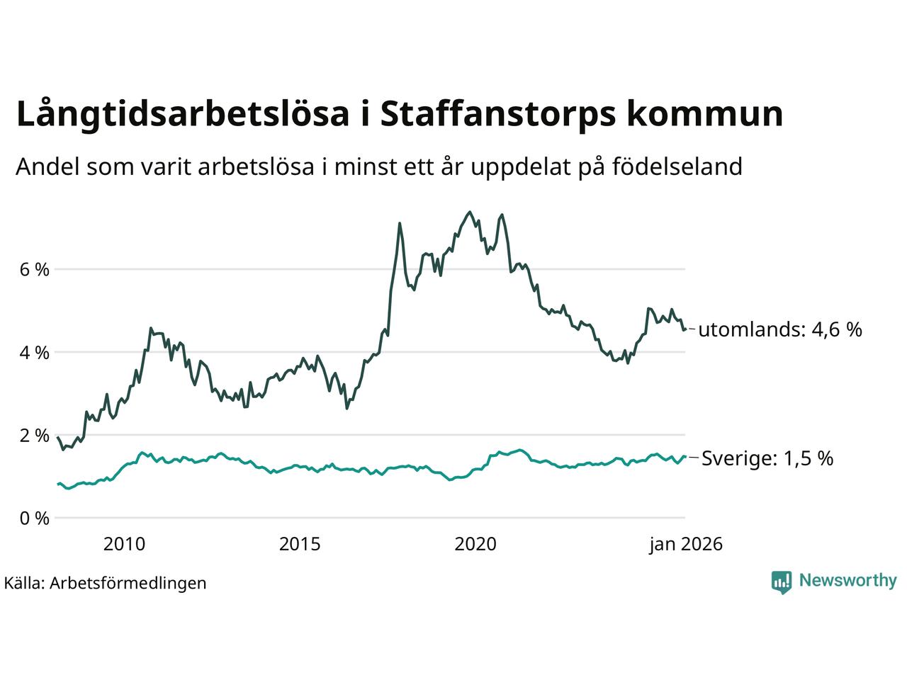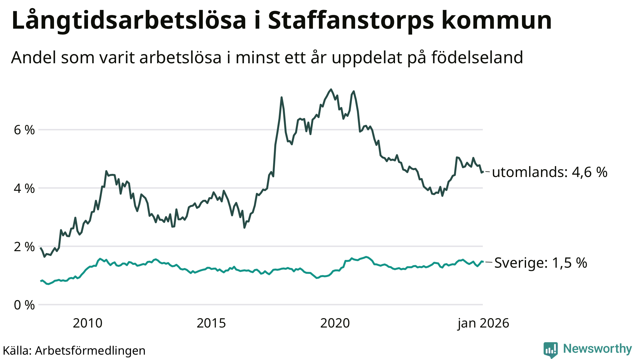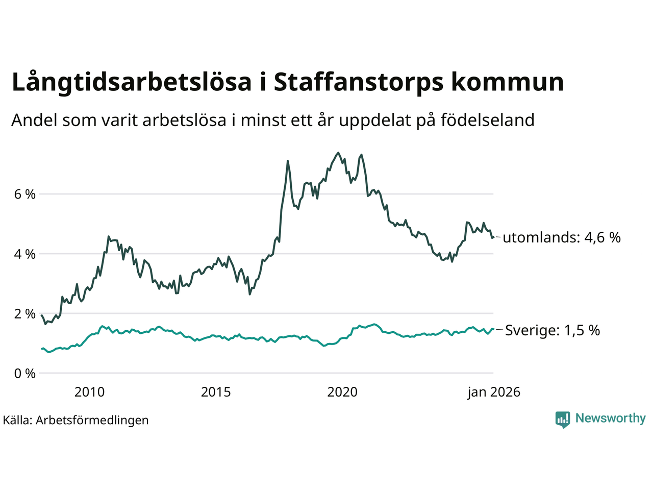 159 av de långtidsarbetslösa i Staffanstorp är födda i Sverige, medan 131 är födda utomlands. Det innebär att långtidsarbetslösheten bland Sverigefödda är 1,5 procent, medan den är tre gånger så hög – 4,6 procent – bland födda utomlands. Även i riket som helhet är arbetslösheten högre bland utrikesfödda.