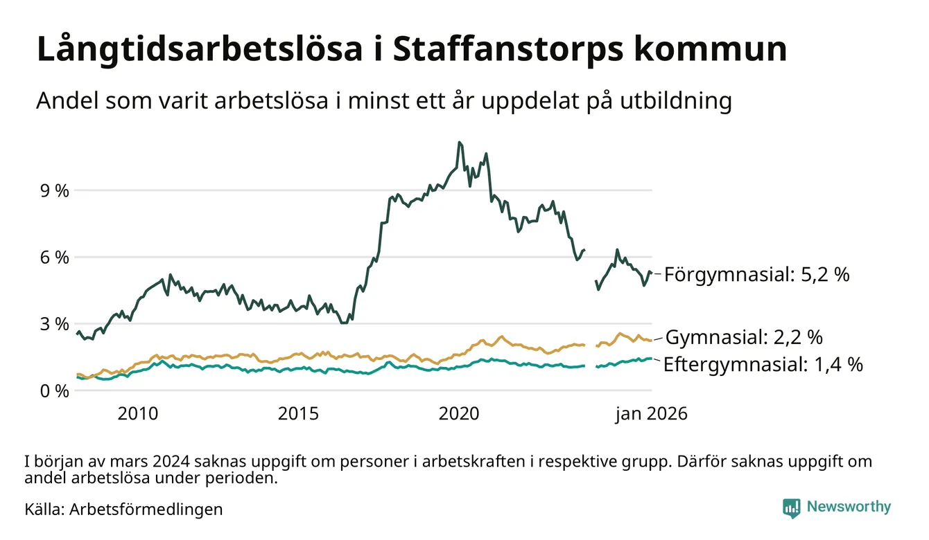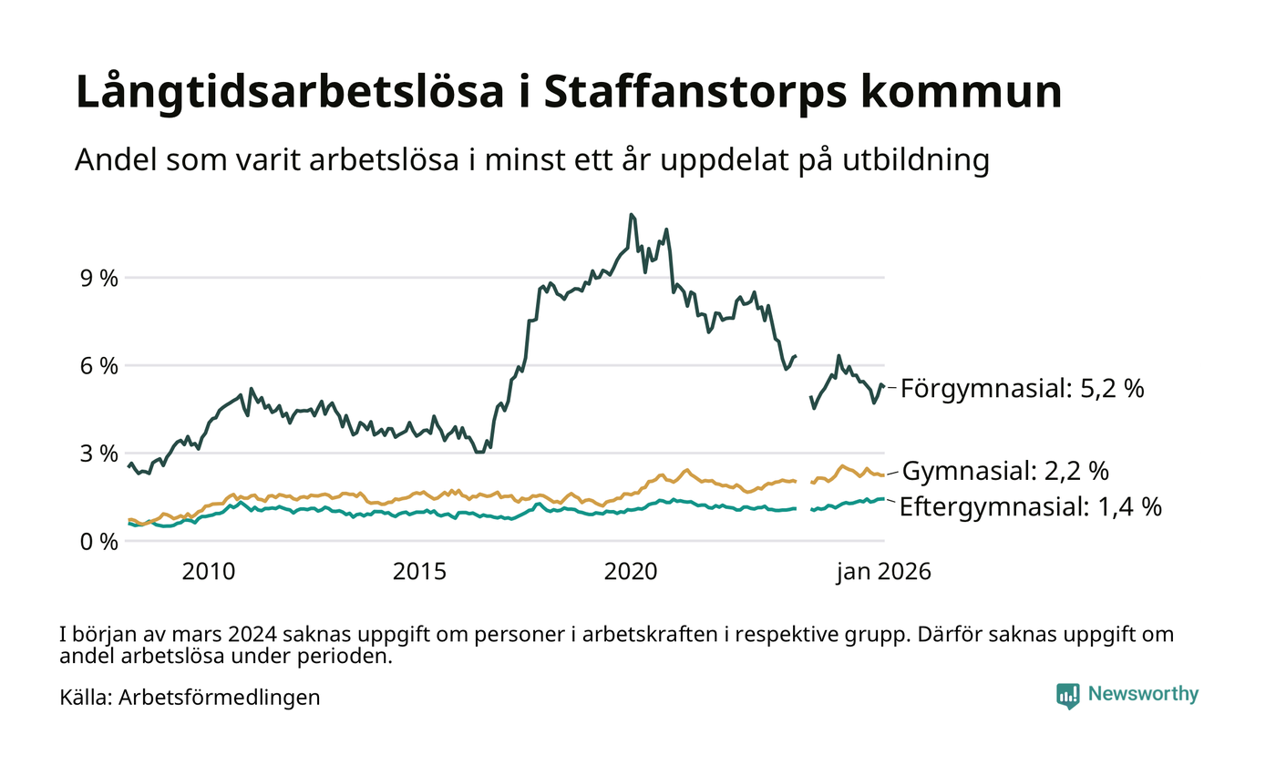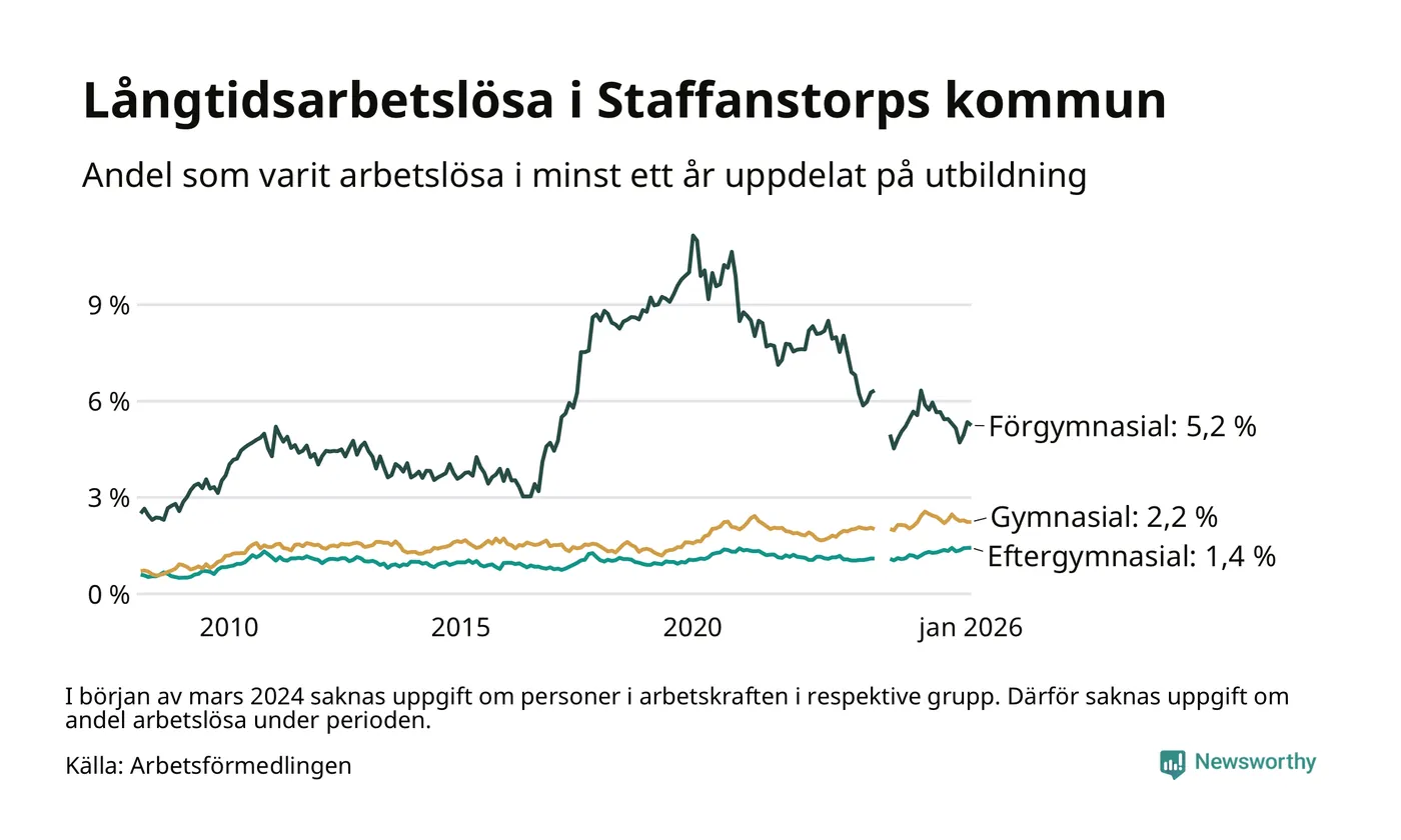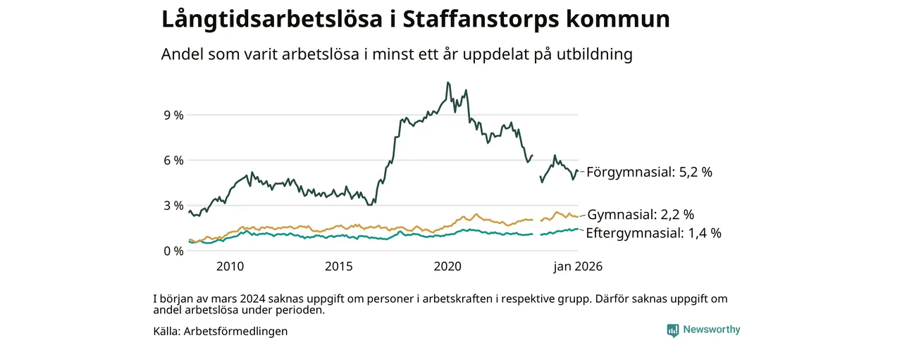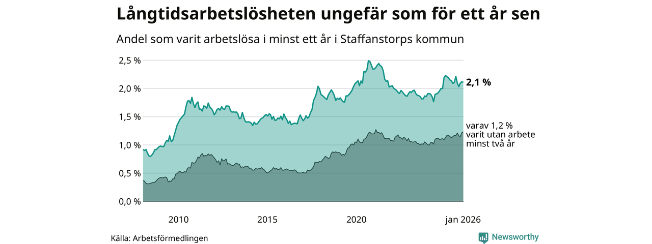 Andelen som varit utan arbete i minst ett år i Staffanstorp var ungefär lika stor i januari jämfört med samma månad för ett år sedan. Det visar Arbetsfömedlingens senaste månadsstatistik.