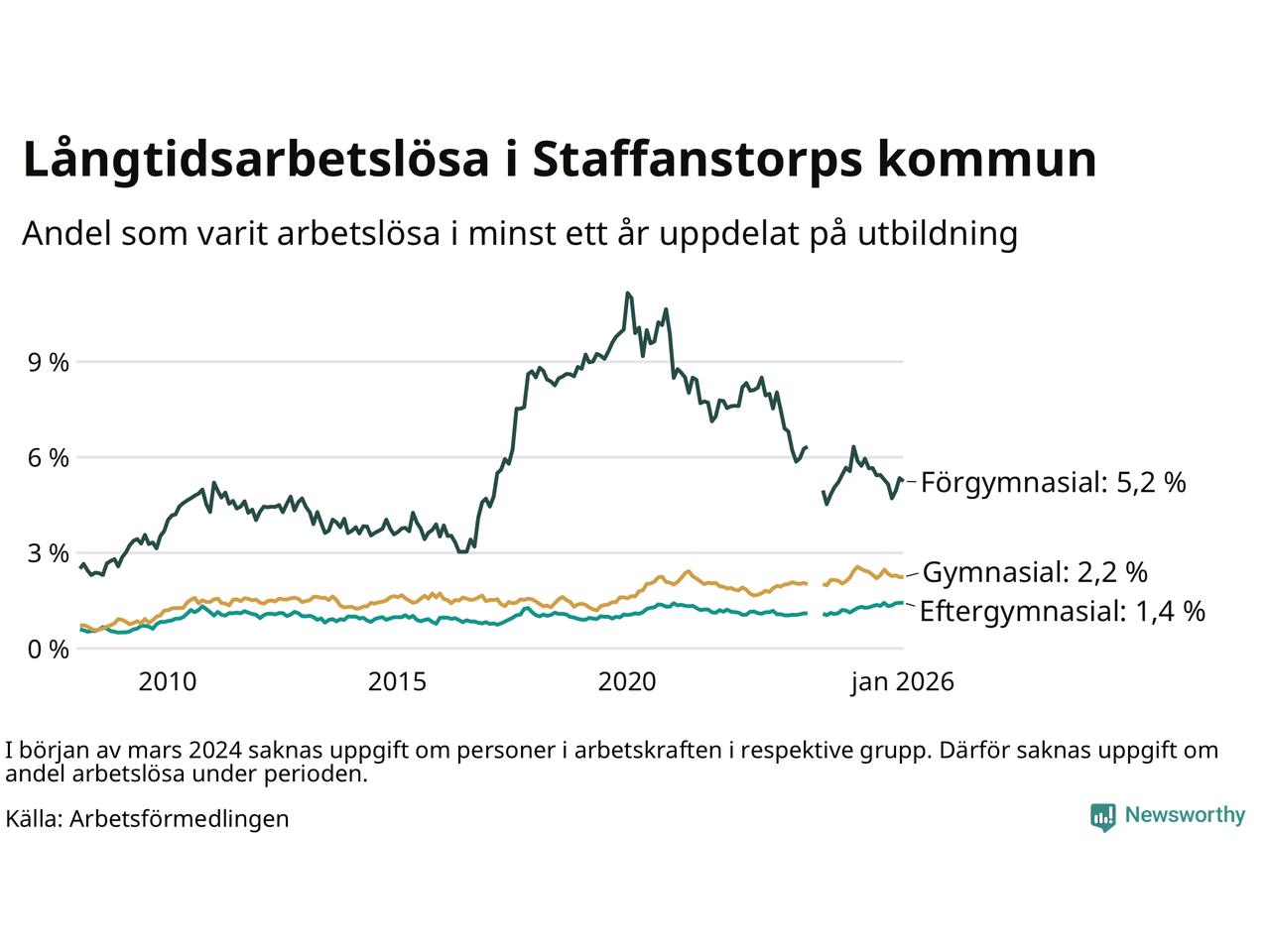 | Andel arbetslösa i minst två år | 1,2 % | 2,2 % | 1,6 % |