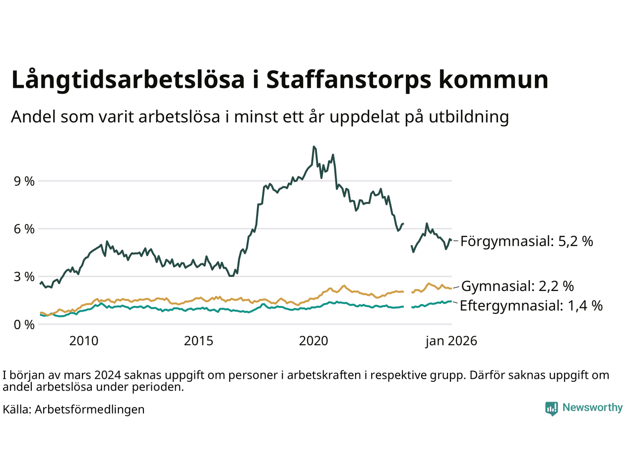 | Andel arbetslösa i minst ett år | 2,1 % | 4,0 % | 2,9 % |