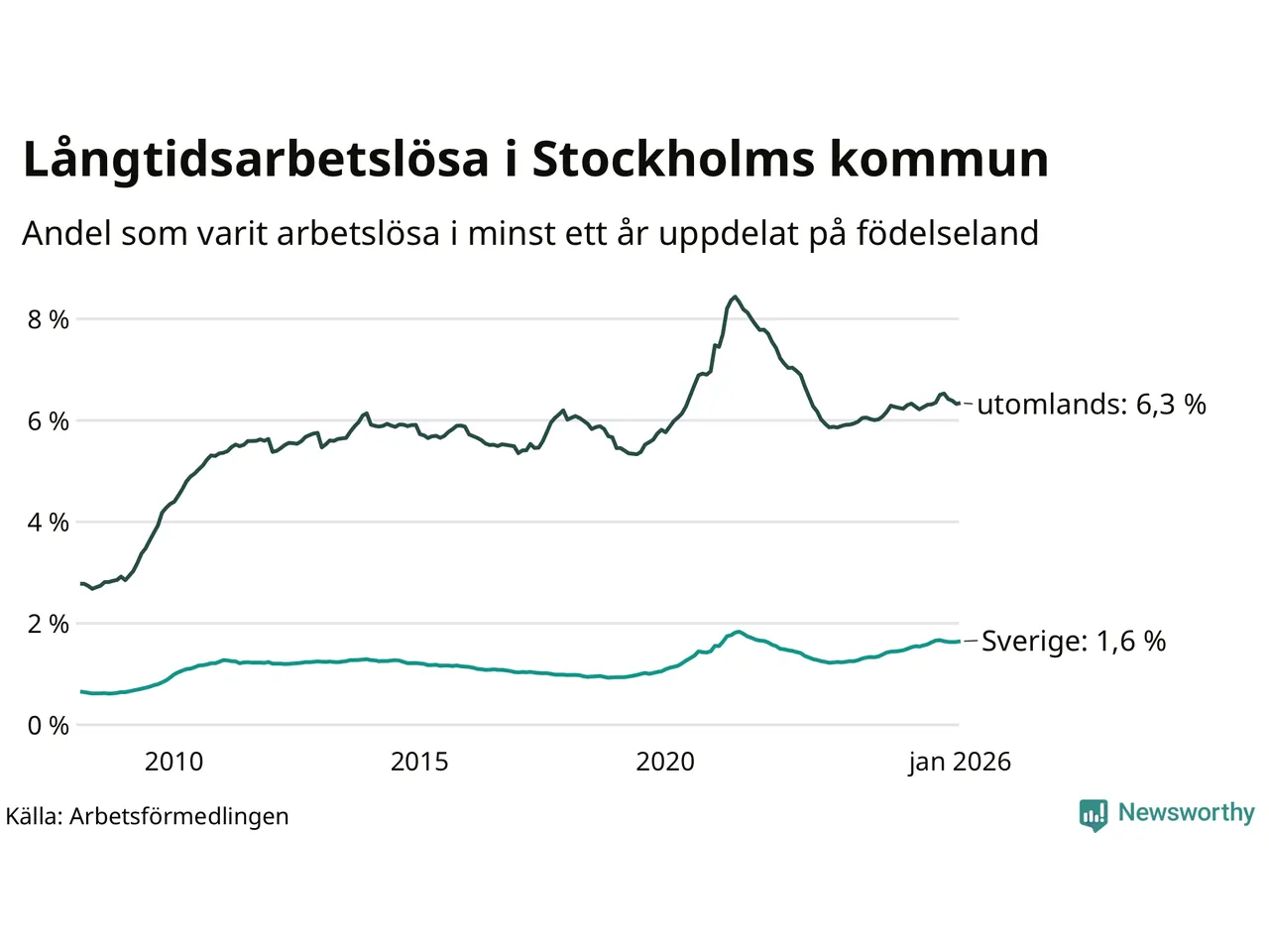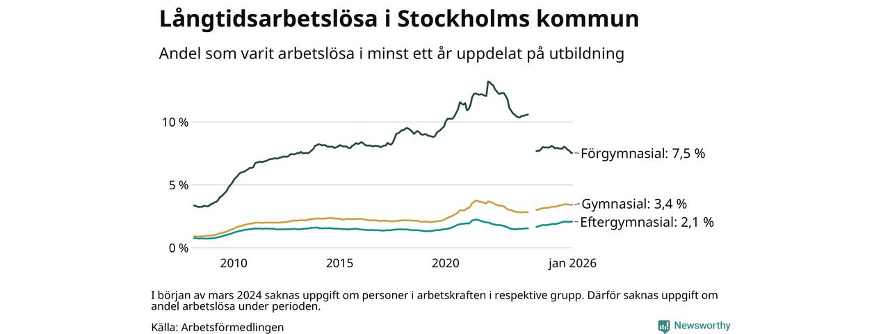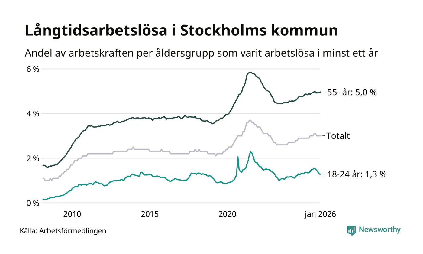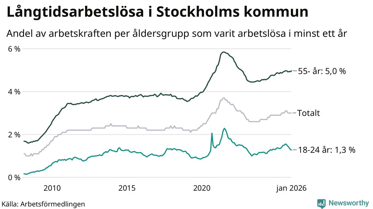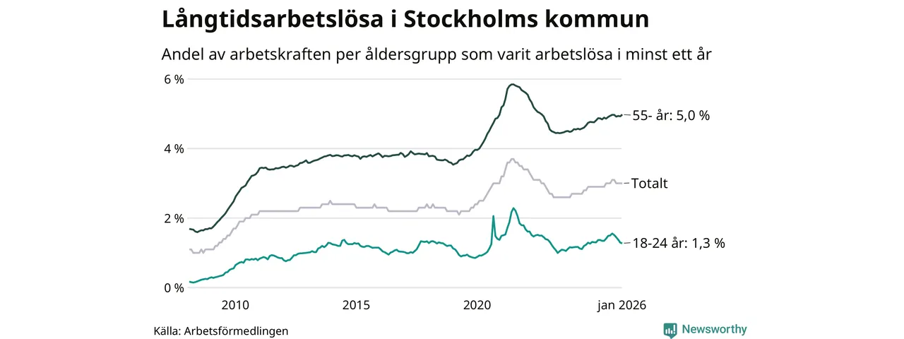 I januari hade 16 463 Stockholmsbor varit arbetslösa i minst ett år, vilket är 191 fler än månaden innan. Det är den första månaden sedan augusti 2025 som antalet arbetslösa ökar. 16 463 personer motsvarar 3,0 procent av arbetskraften i kommunen – andelen långtidsarbetslösa är ungefär på samma nivå som för ett år sedan.