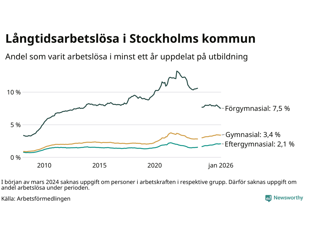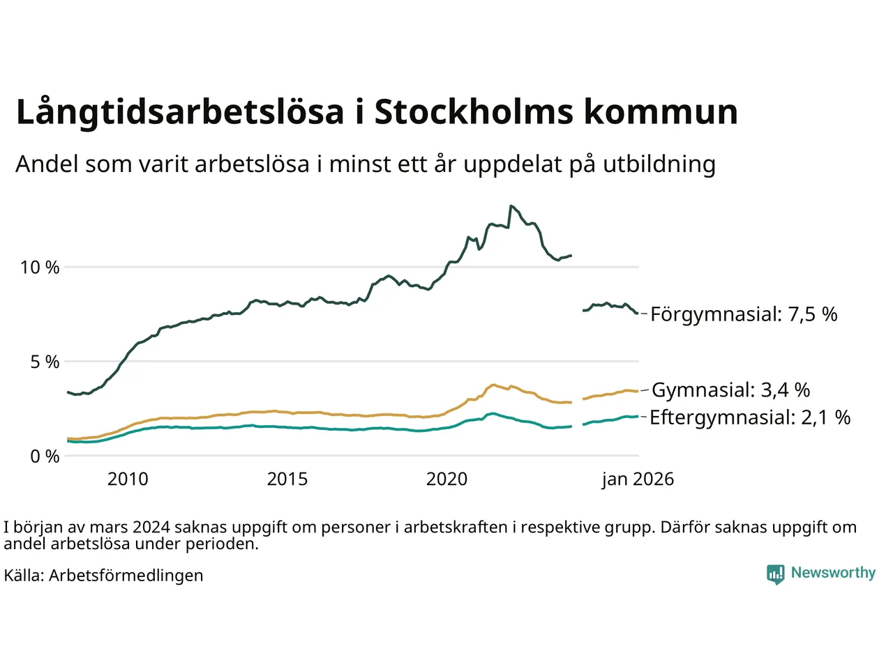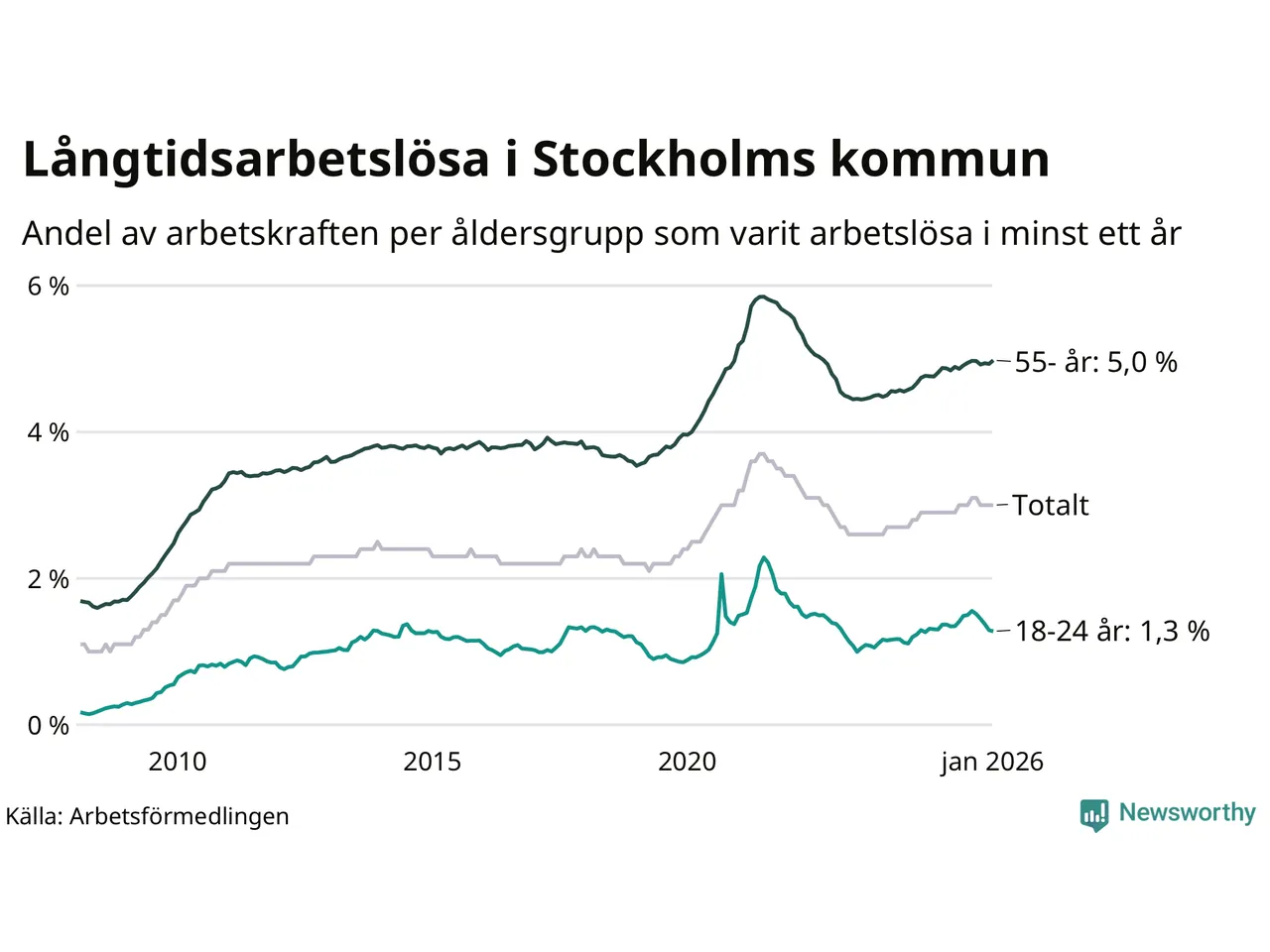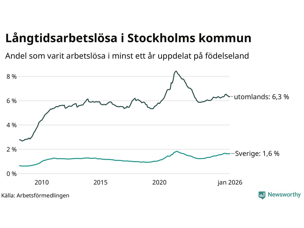 I januari hade 16 463 Stockholmsbor varit arbetslösa i minst ett år, vilket är 191 fler än månaden innan. Det är den första månaden sedan augusti 2025 som antalet arbetslösa ökar. 16 463 personer motsvarar 3,0 procent av arbetskraften i kommunen – andelen långtidsarbetslösa är ungefär på samma nivå som för ett år sedan.