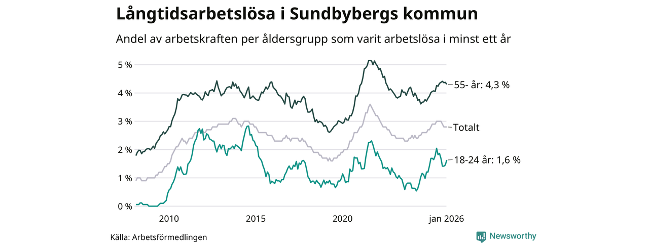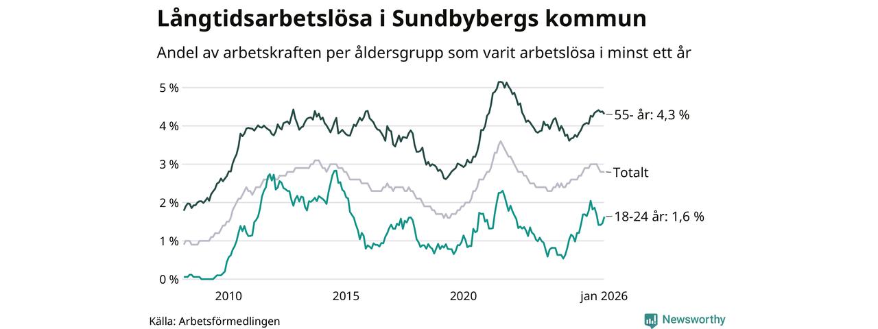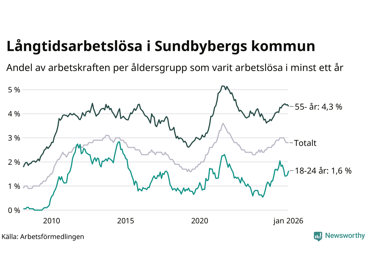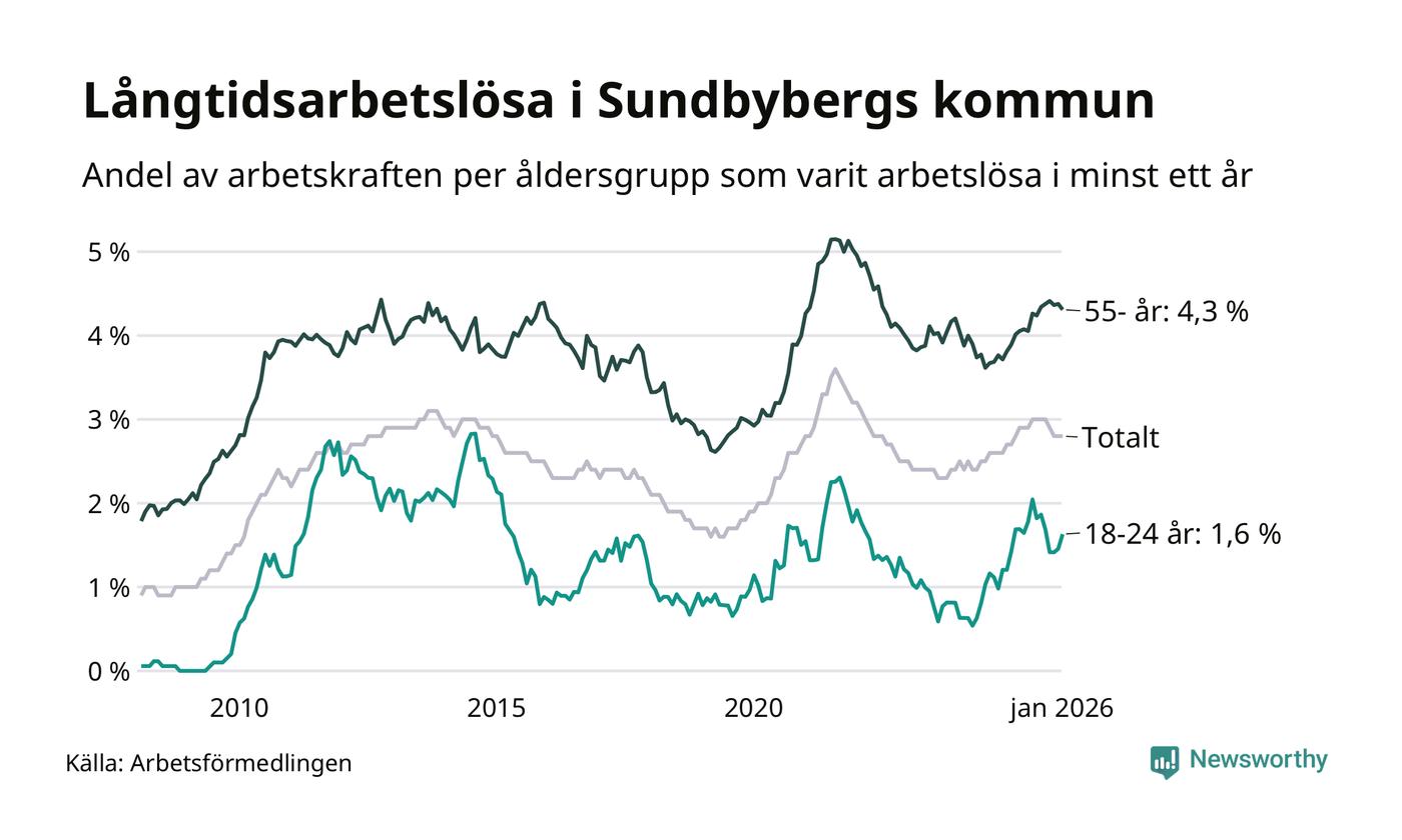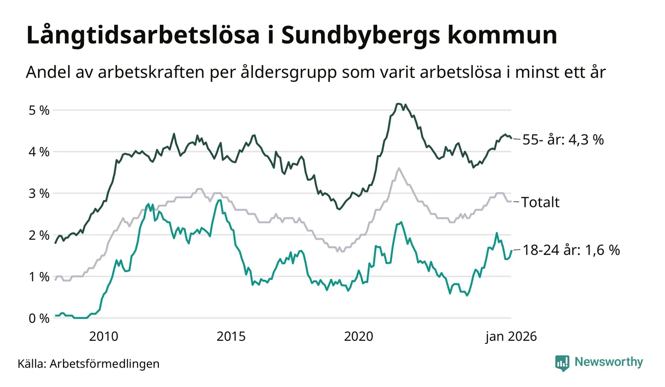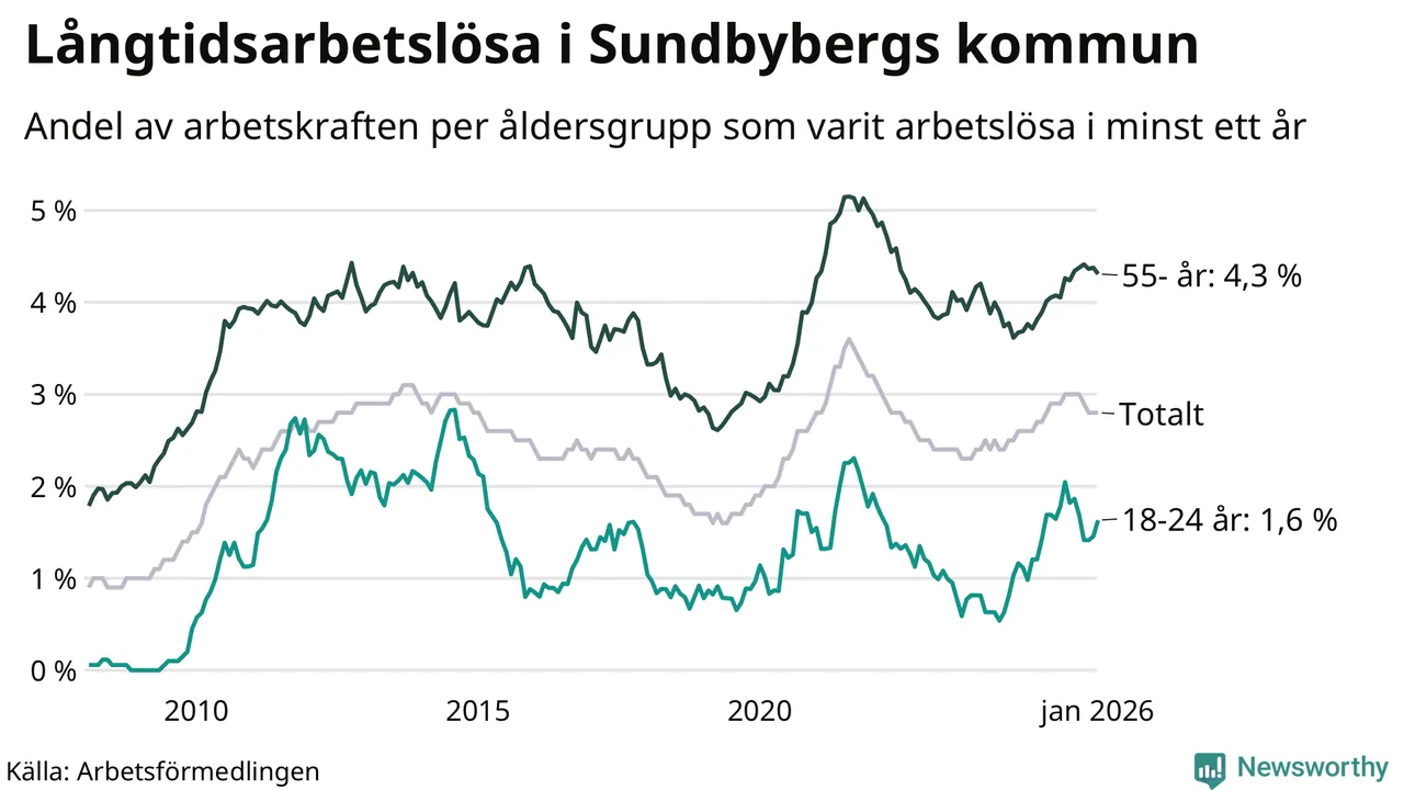 Av de 913 personerna som varit arbetslösa i mer än ett år i Sundbybergs kommun är 207 personer mellan 55 och 661 år och 37 är mellan 18 och 24 år. För den äldre gruppen är andelen arbetslösa 4,3 procent medan den i den yngre gruppen är 1,6 procent. Även i riket som helhet är långtidsarbetslösheten högre i gruppen äldre.