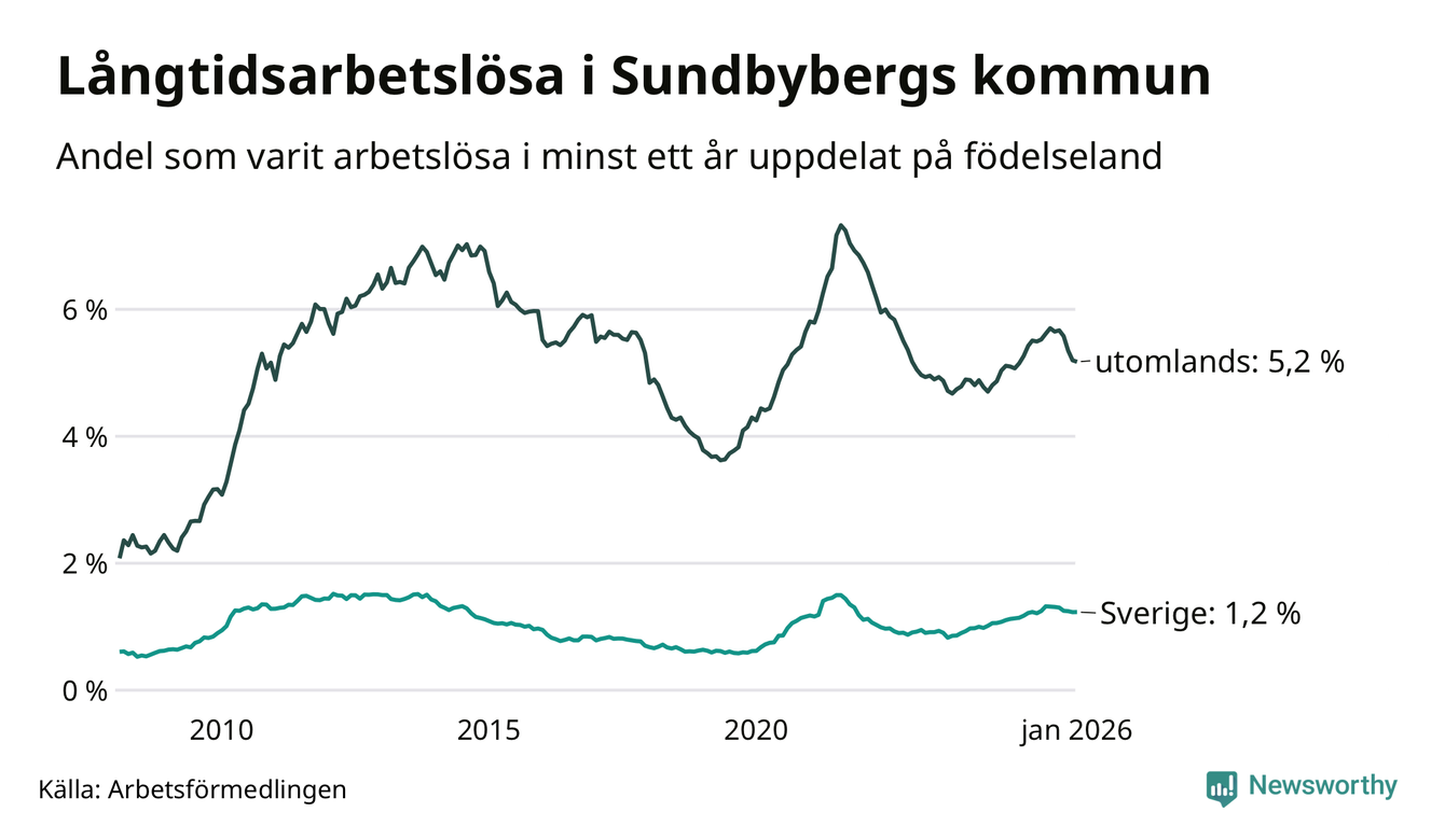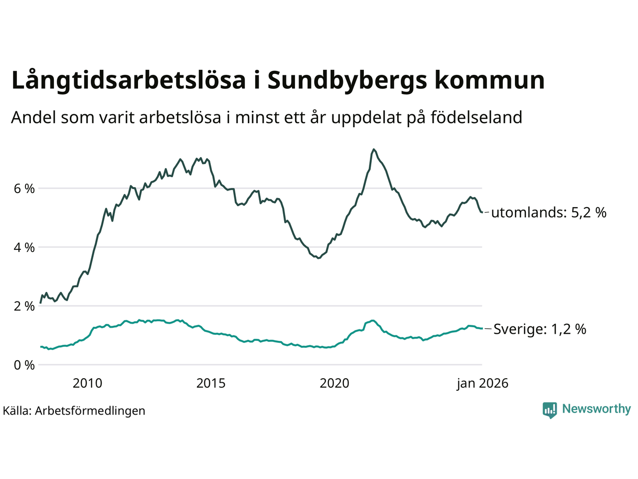 250 av de långtidsarbetslösa i Sundbyberg är födda i Sverige, medan 663 är födda utomlands. Det innebär att långtidsarbetslösheten bland Sverigefödda är 1,2 procent, medan den är fyra gånger så hög – 5,2 procent – bland födda utomlands. Även i riket som helhet är arbetslösheten högre bland utrikesfödda.