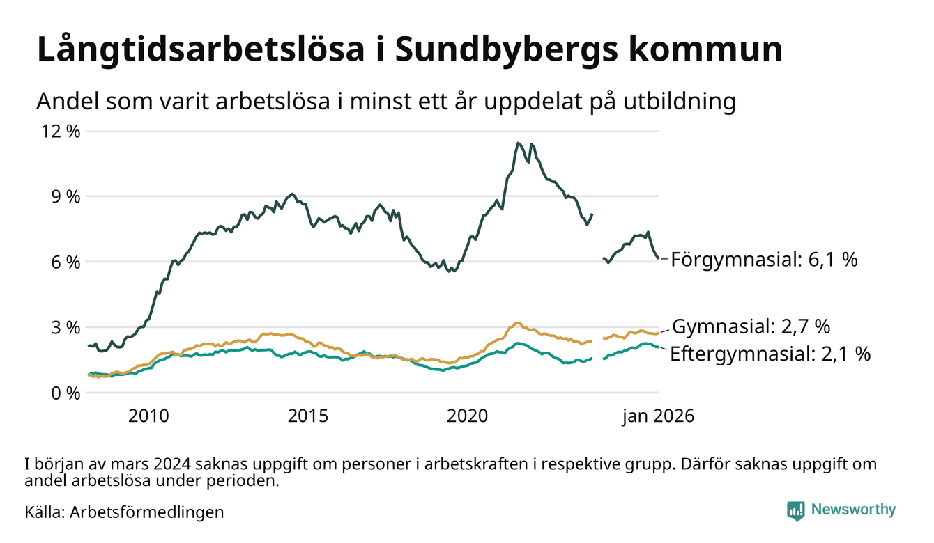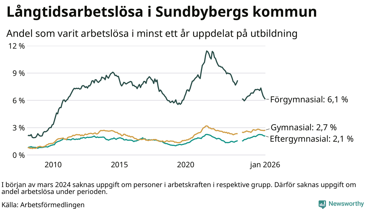 Graf: Andel arbetslösa i Sundbyberg som varit utan arbete i minst 12 månader