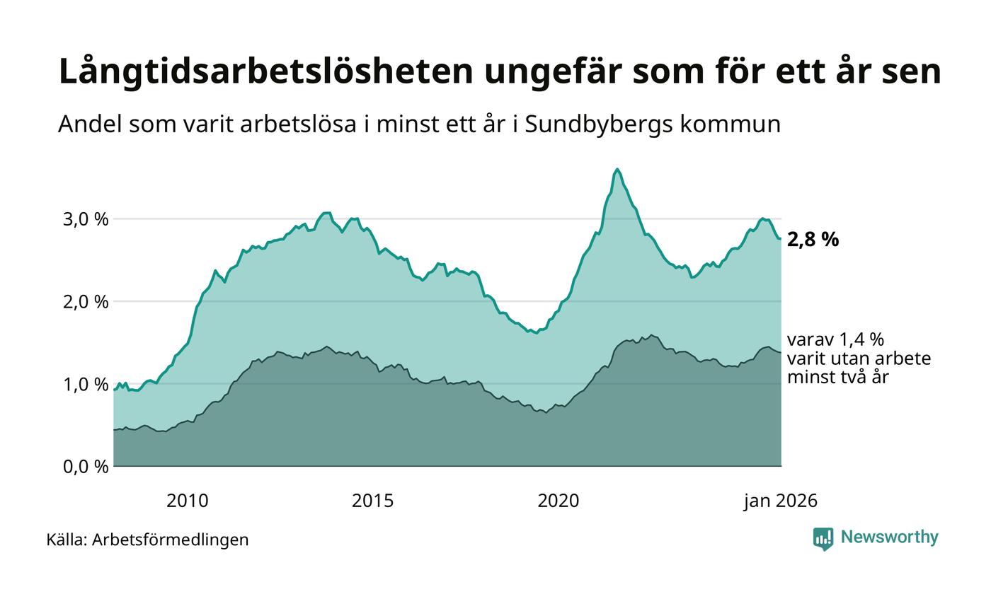 I januari hade 913 Sundbybergsbor varit arbetslösa i minst ett år, vilket är fyra fler än månaden innan. 913 personer motsvarar 2,8 procent av arbetskraften i kommunen – andelen långtidsarbetslösa är ungefär på samma nivå som för ett år sedan.