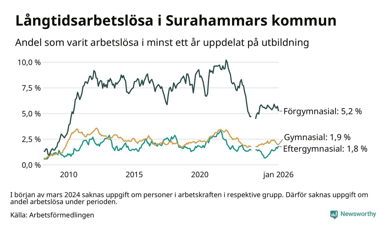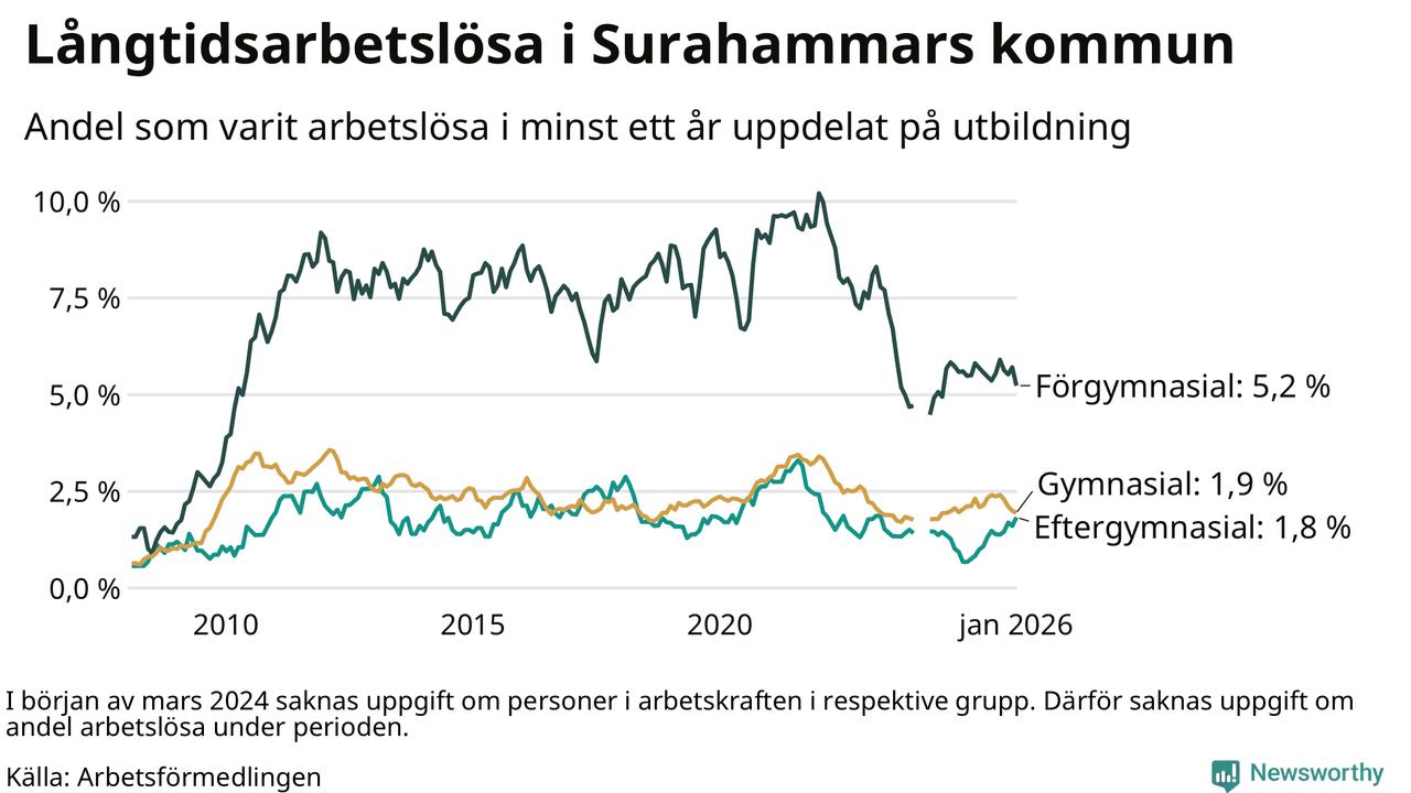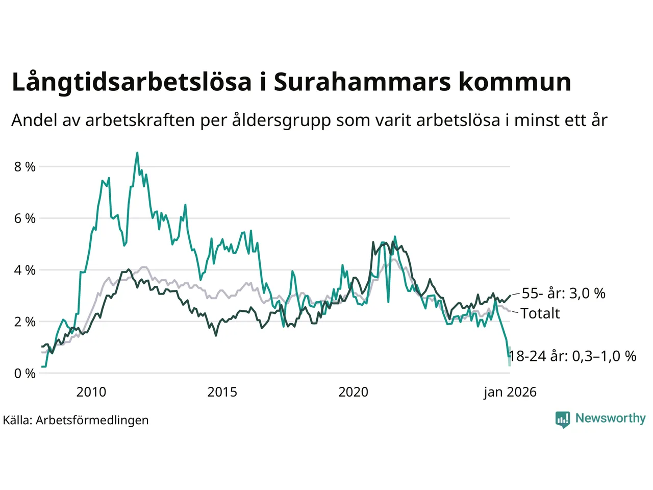 Av de 109 personerna som varit arbetslösa i mer än ett år i Surahammars kommun är 34 personer mellan 55 och 661 år och mellan en och fyra är mellan 18 och 24 år. För den äldre gruppen är andelen arbetslösa 3,0 procent medan den i den yngre gruppen är mellan 0,3 och 1,0 procent. Även i riket som helhet är långtidsarbetslösheten högre i gruppen äldre.