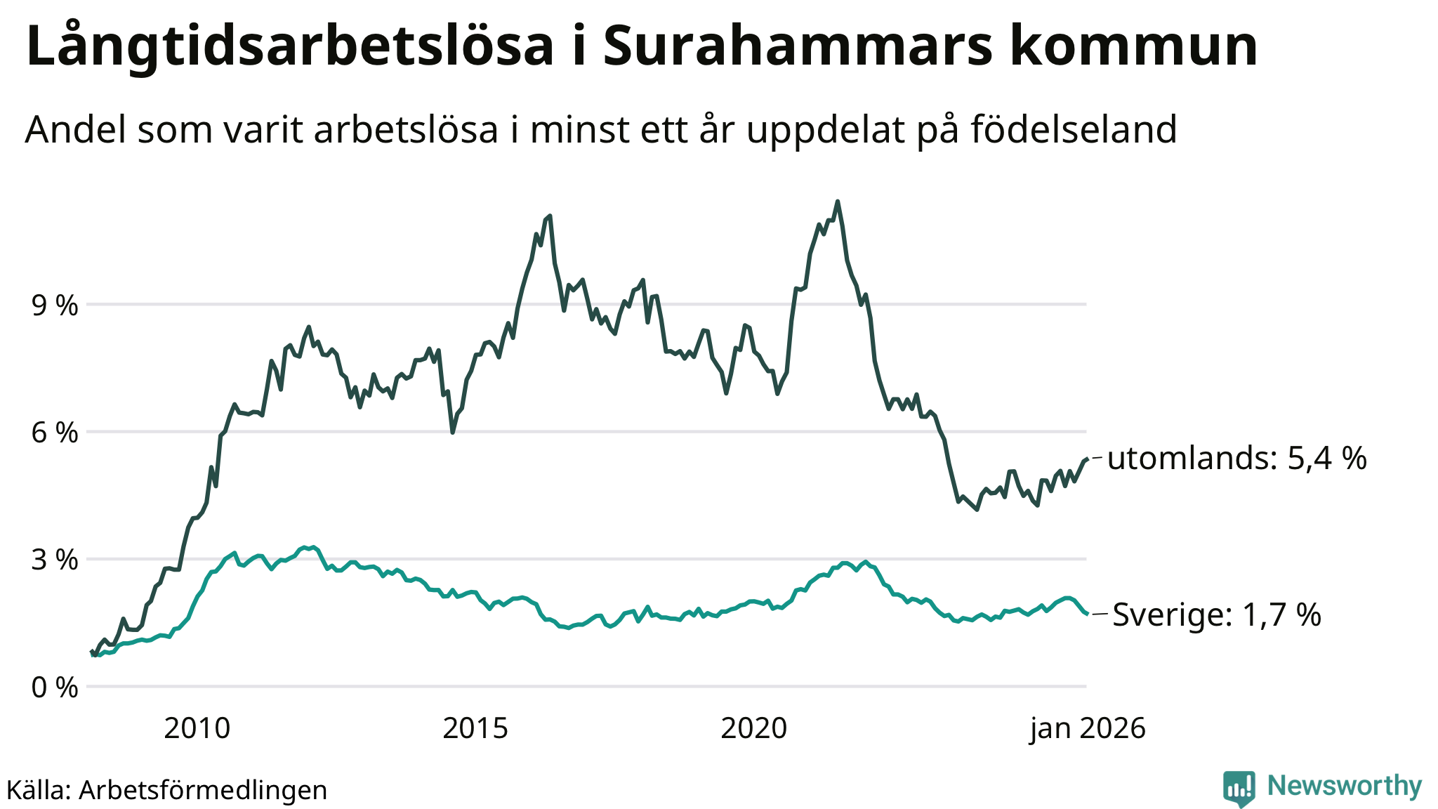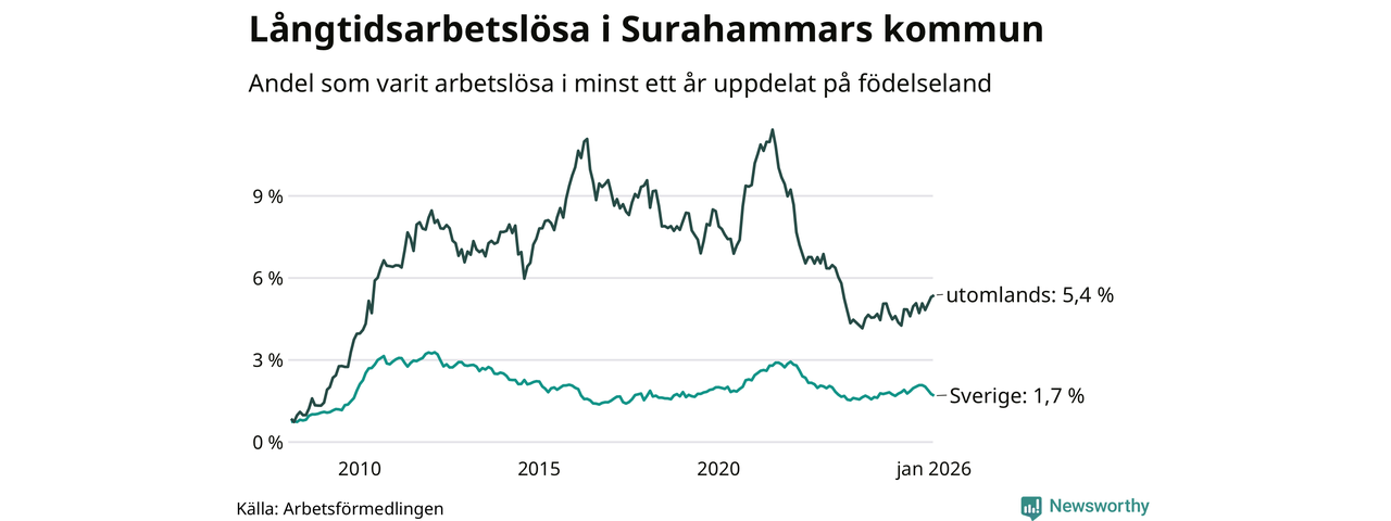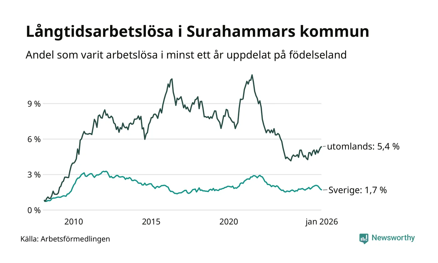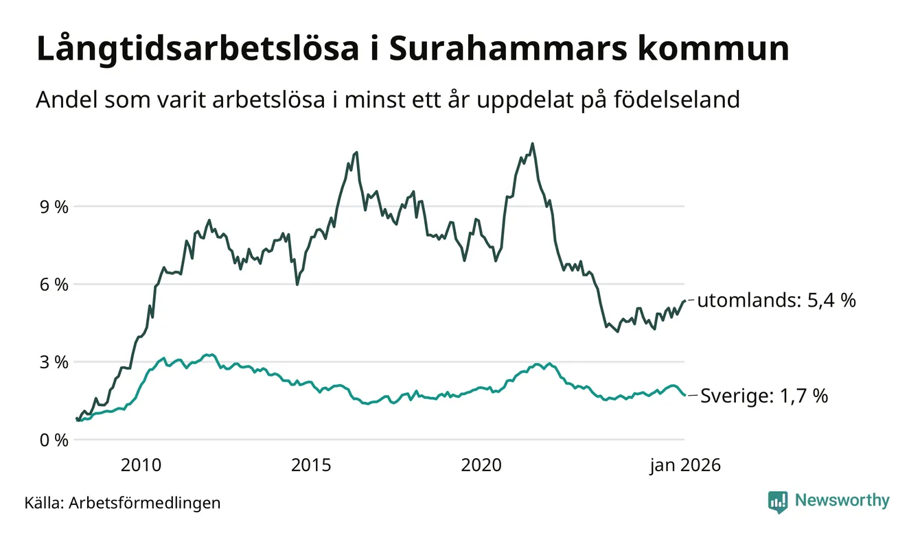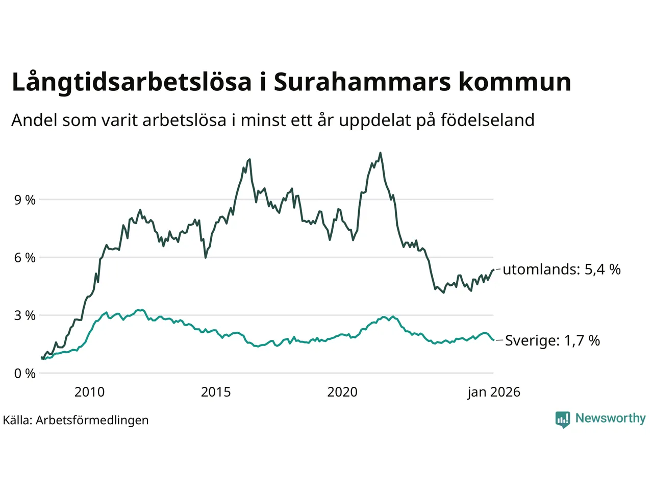 63 av de långtidsarbetslösa i Surahammar är födda i Sverige, medan 46 är födda utomlands. Det innebär att långtidsarbetslösheten bland Sverigefödda är 1,7 procent, medan den är tre gånger så hög – 5,4 procent – bland födda utomlands. Även i riket som helhet är arbetslösheten högre bland utrikesfödda.