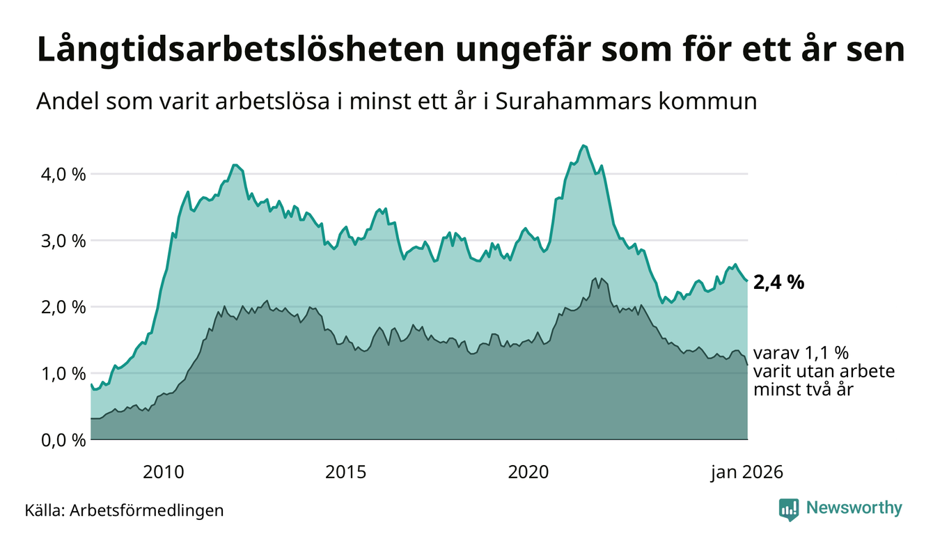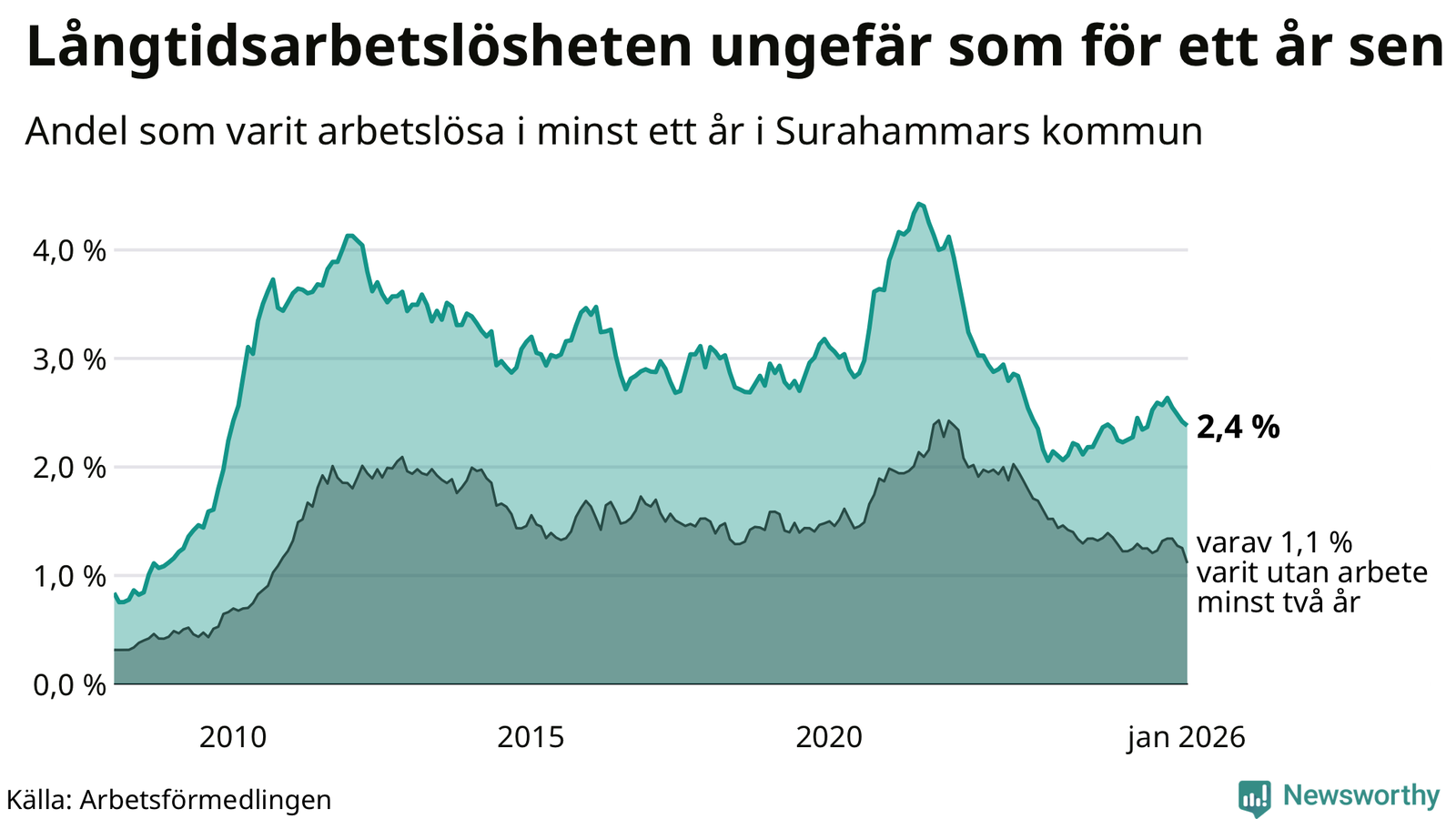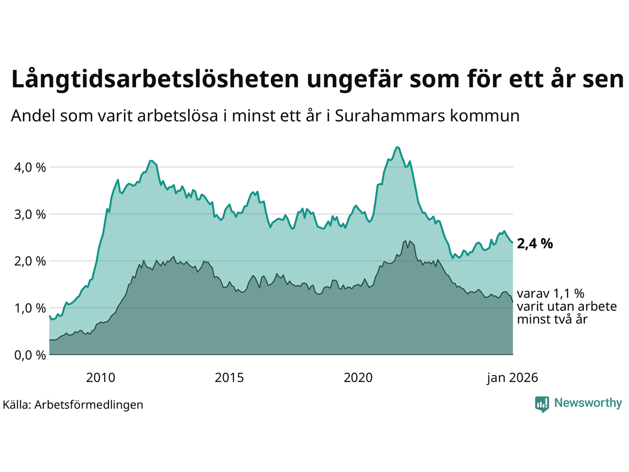 I januari hade 109 Surahammarsbor varit arbetslösa i minst ett år, vilket är en färre än månaden innan. Det är den fjärde månaden i rad med minskande antal långtidsarbetslösa. 109 personer motsvarar 2,4 procent av arbetskraften i kommunen – andelen långtidsarbetslösa är ungefär på samma nivå som för ett år sedan.