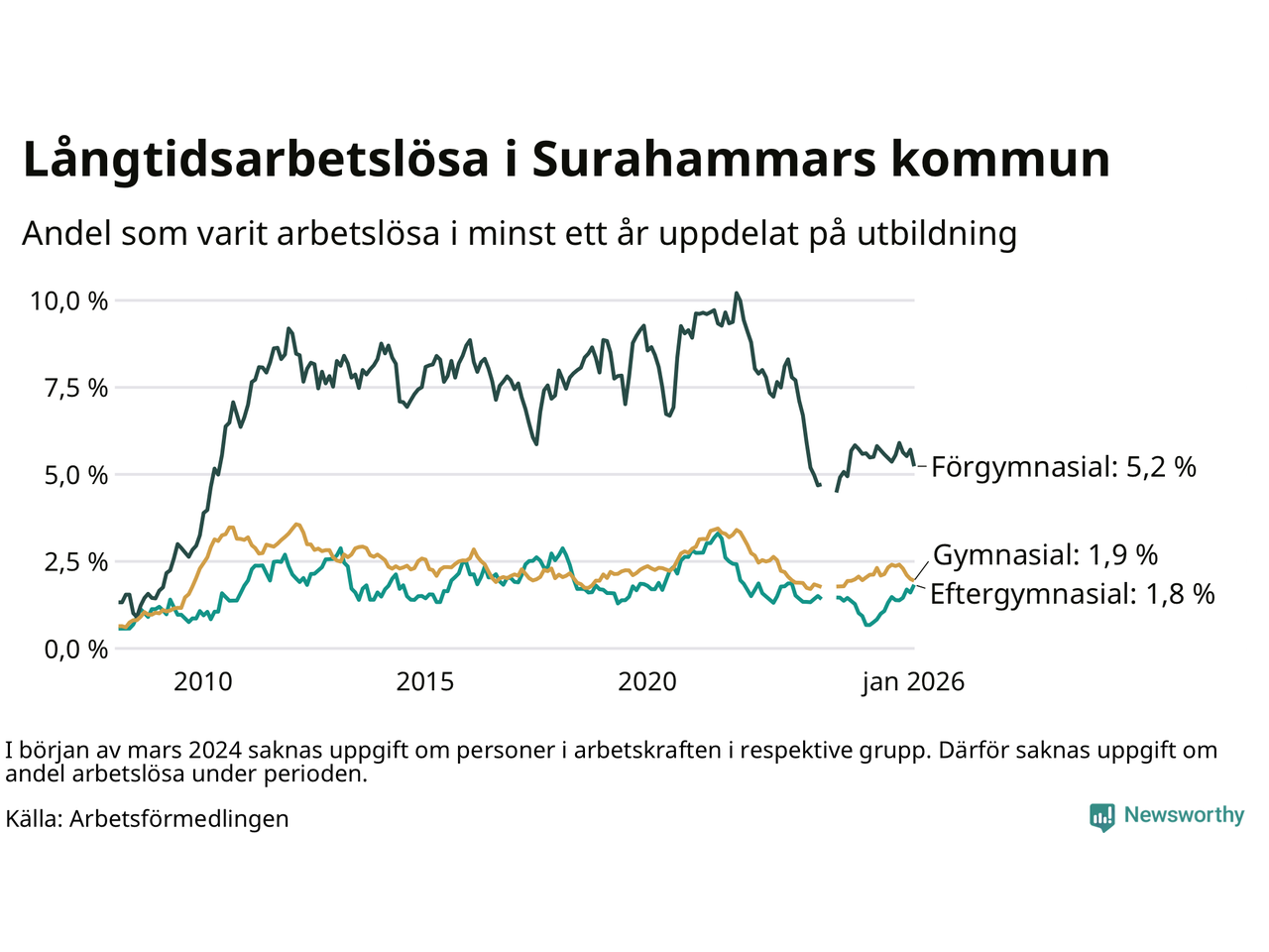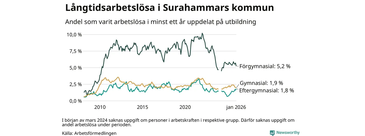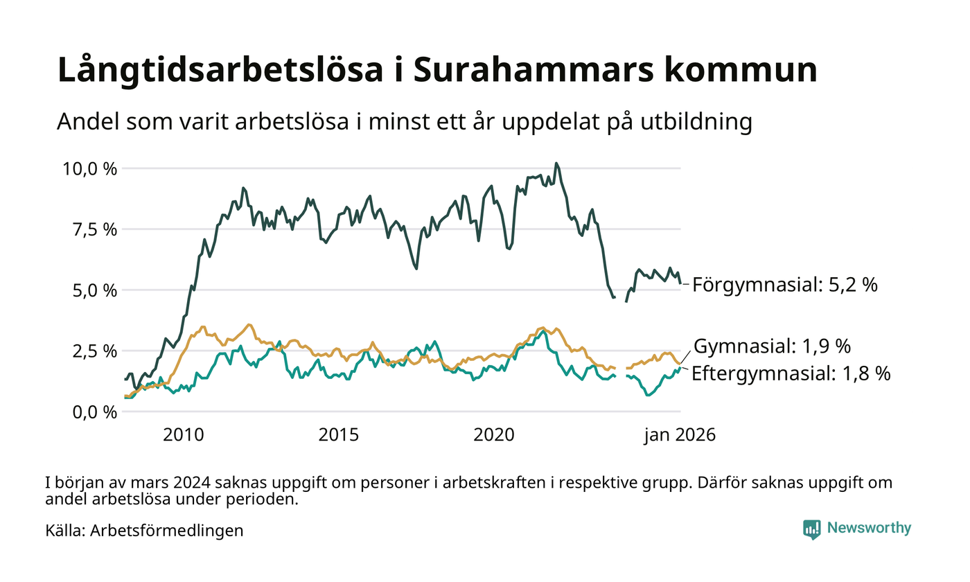 I januari hade 109 Surahammarsbor varit arbetslösa i minst ett år, vilket är en färre än månaden innan. Det är den fjärde månaden i rad med minskande antal långtidsarbetslösa. 109 personer motsvarar 2,4 procent av arbetskraften i kommunen – andelen långtidsarbetslösa är ungefär på samma nivå som för ett år sedan.