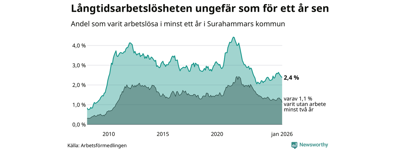 Andelen som varit utan arbete i minst ett år i Surahammar var ungefär lika stor i januari jämfört med samma månad för ett år sedan. Det visar Arbetsfömedlingens senaste månadsstatistik.