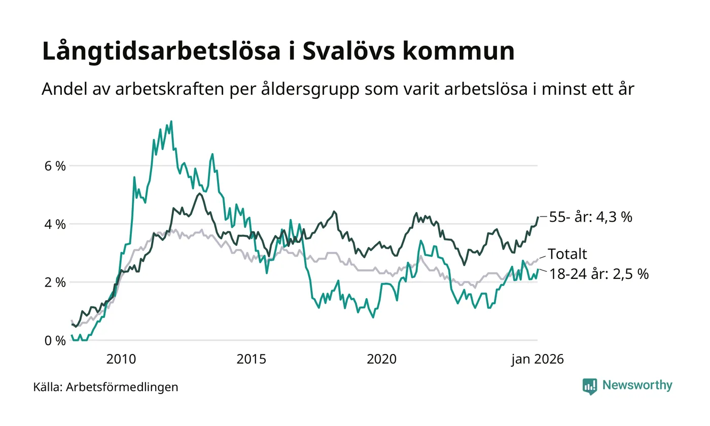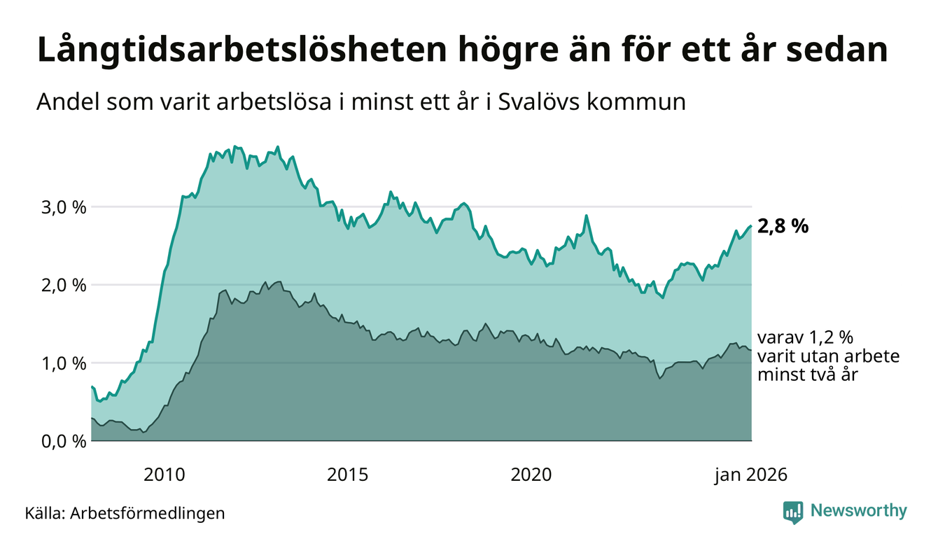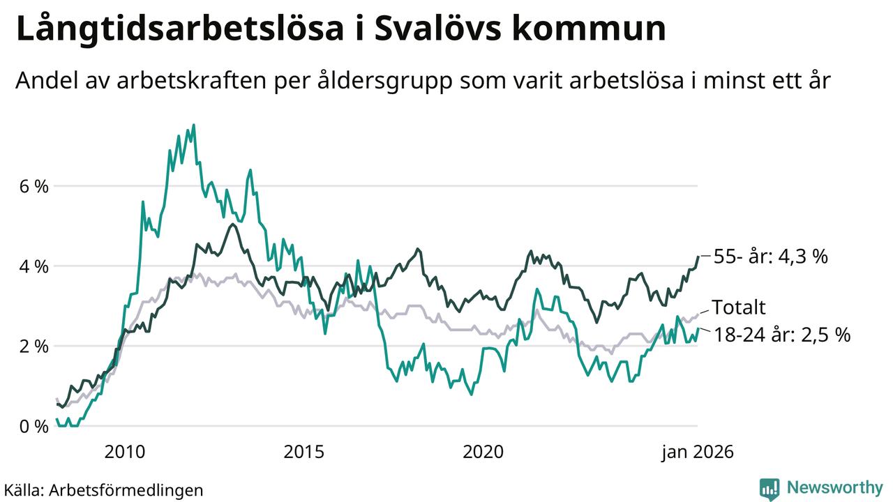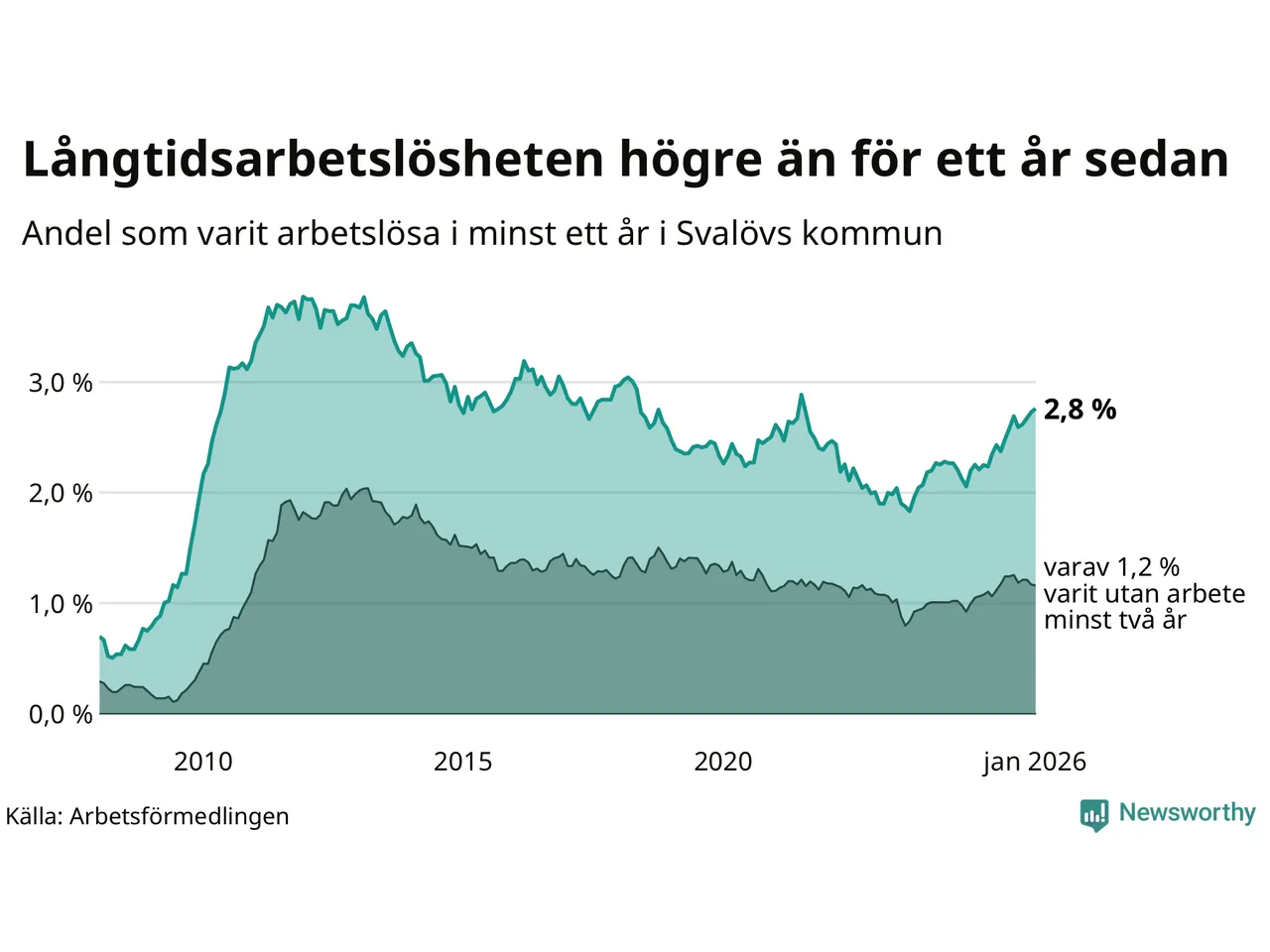 I januari hade 200 Svalövsbor varit arbetslösa i minst ett år, vilket är fyra fler än månaden innan. Det är den fjärde månaden i rad med ökande antal långtidsarbetslösa. 200 personer motsvarar 2,8 procent av arbetskraften i kommunen – andelen långtidsarbetslösa är 0,5 procentenheter högre än samma månad för ett år sedan.