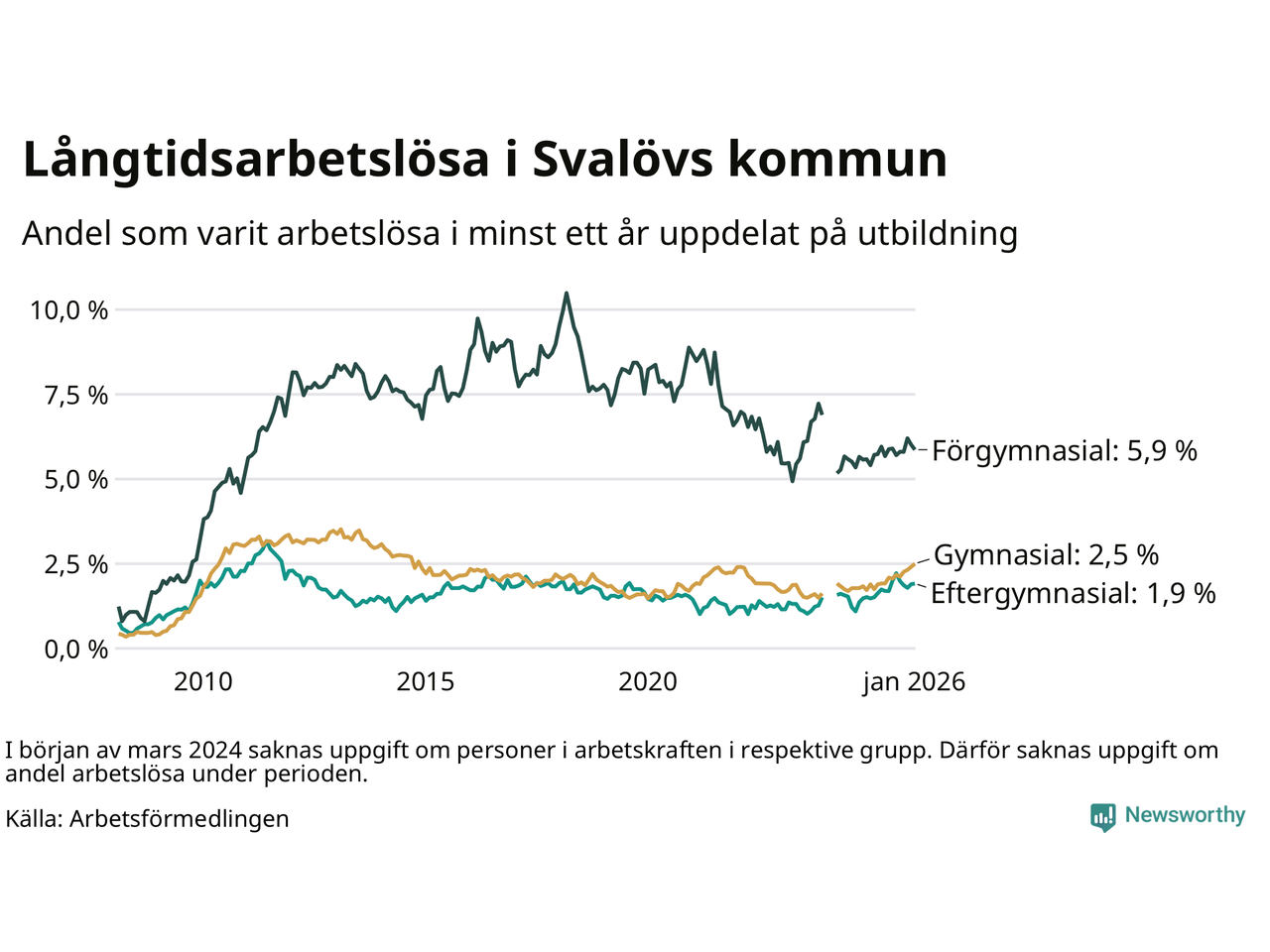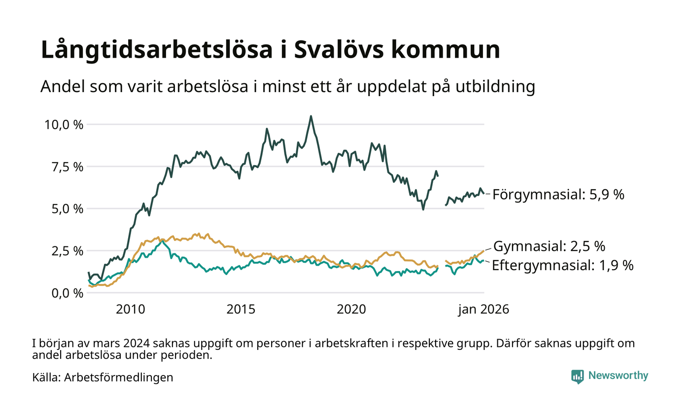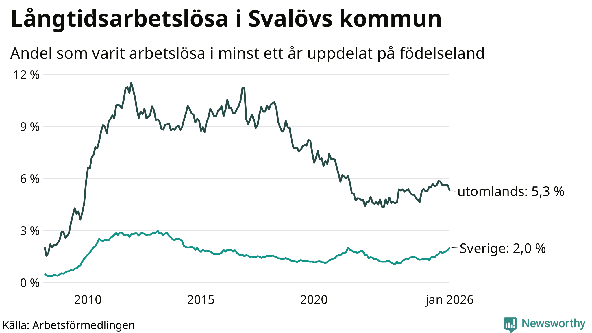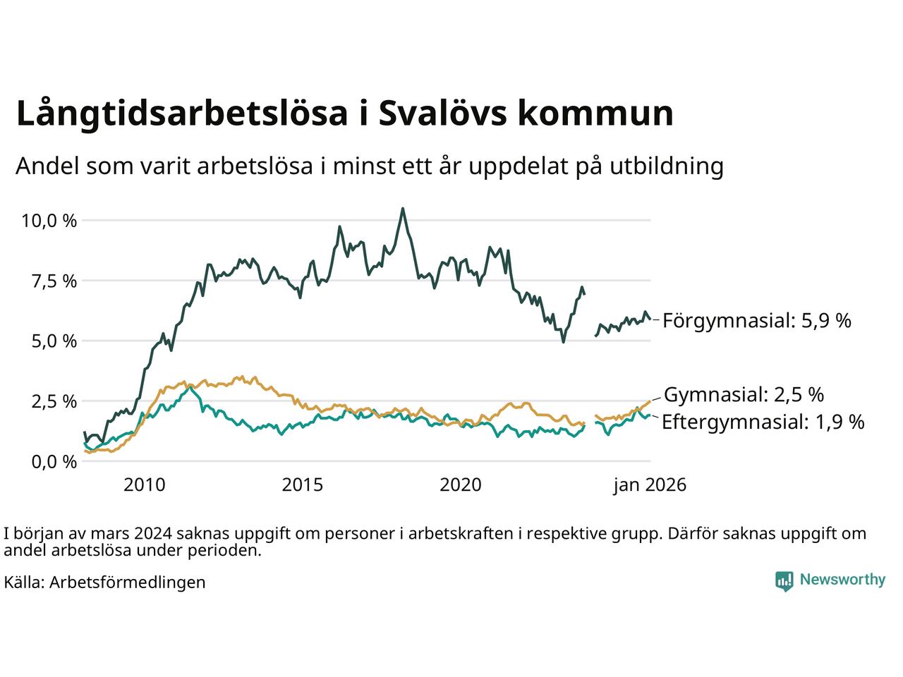 I januari hade 200 Svalövsbor varit arbetslösa i minst ett år, vilket är fyra fler än månaden innan. Det är den fjärde månaden i rad med ökande antal långtidsarbetslösa. 200 personer motsvarar 2,8 procent av arbetskraften i kommunen – andelen långtidsarbetslösa är 0,5 procentenheter högre än samma månad för ett år sedan.