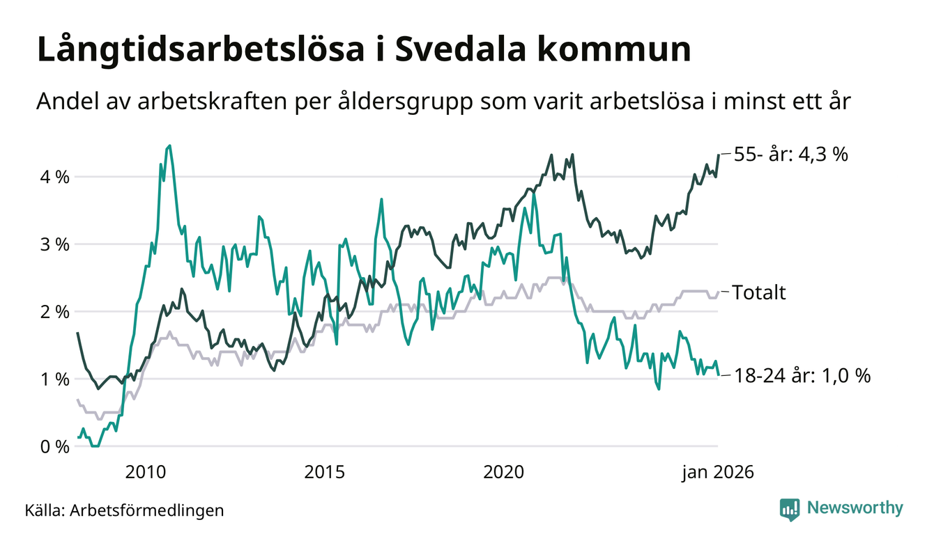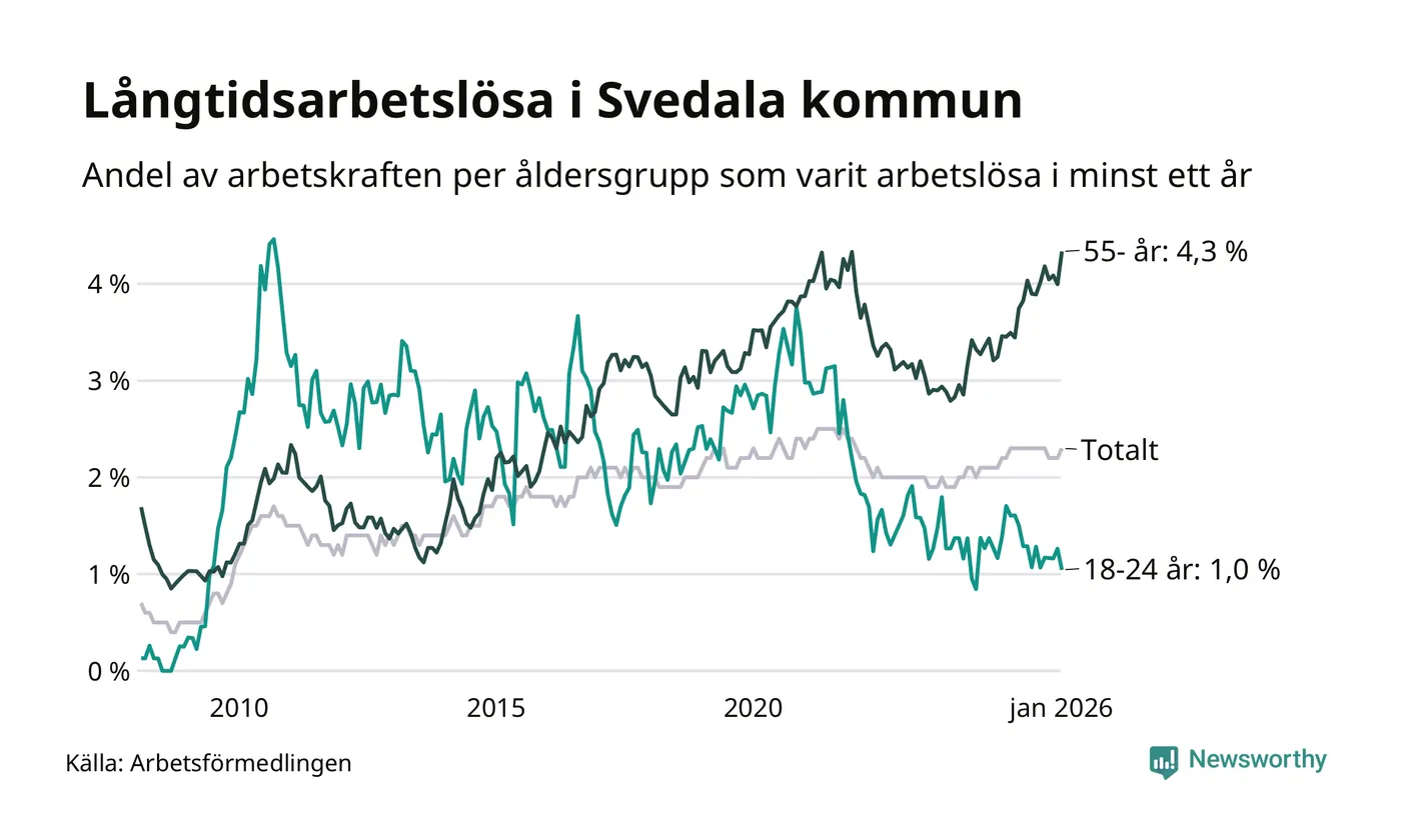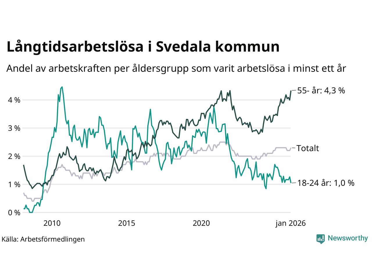 Av de 270 personerna som varit arbetslösa i mer än ett år i Svedala kommun är 101 personer mellan 55 och 661 år och tio är mellan 18 och 24 år. För den äldre gruppen är andelen arbetslösa 4,3 procent medan den i den yngre gruppen är 1,0 procent. Även i riket som helhet är långtidsarbetslösheten högre i gruppen äldre.