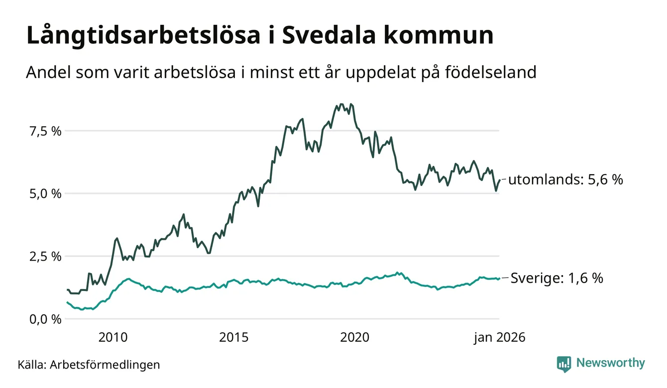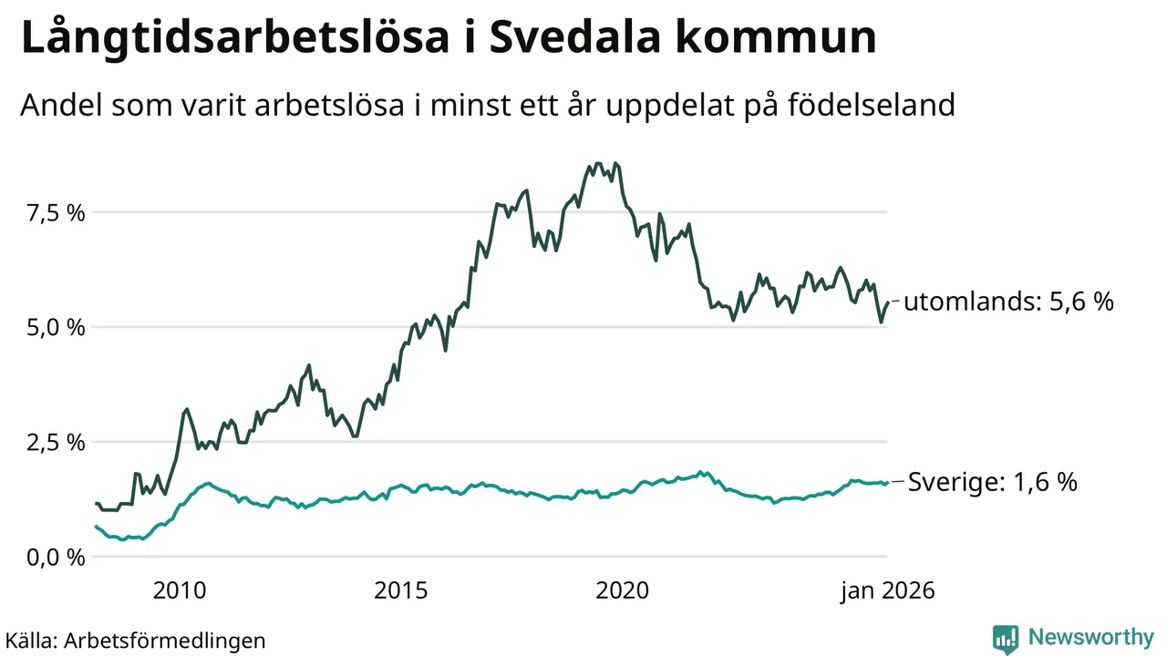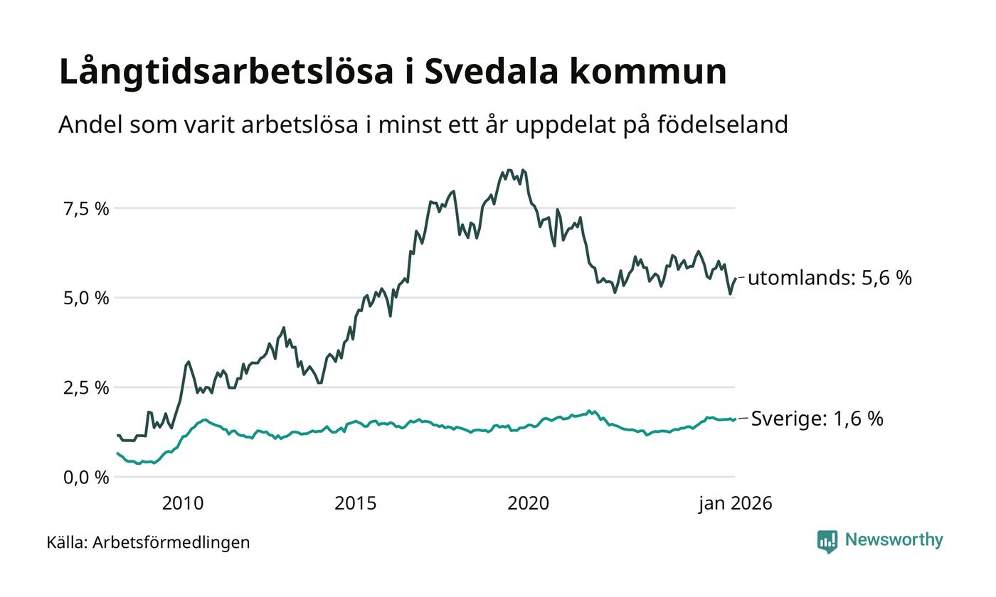 162 av de långtidsarbetslösa i Svedala är födda i Sverige, medan 108 är födda utomlands. Det innebär att långtidsarbetslösheten bland Sverigefödda är 1,6 procent, medan den är fyra gånger så hög – 5,6 procent – bland födda utomlands. Även i riket som helhet är arbetslösheten högre bland utrikesfödda.