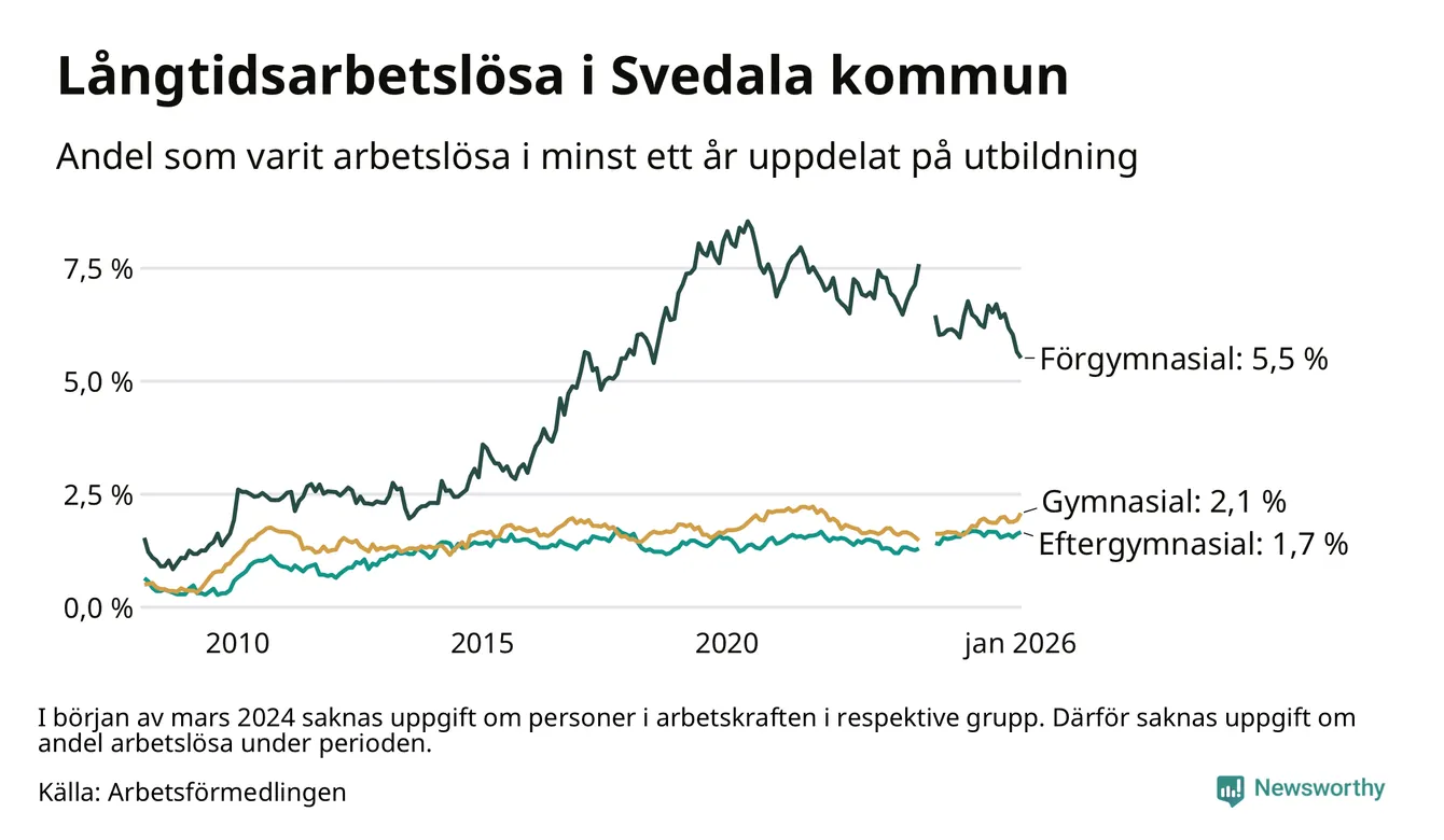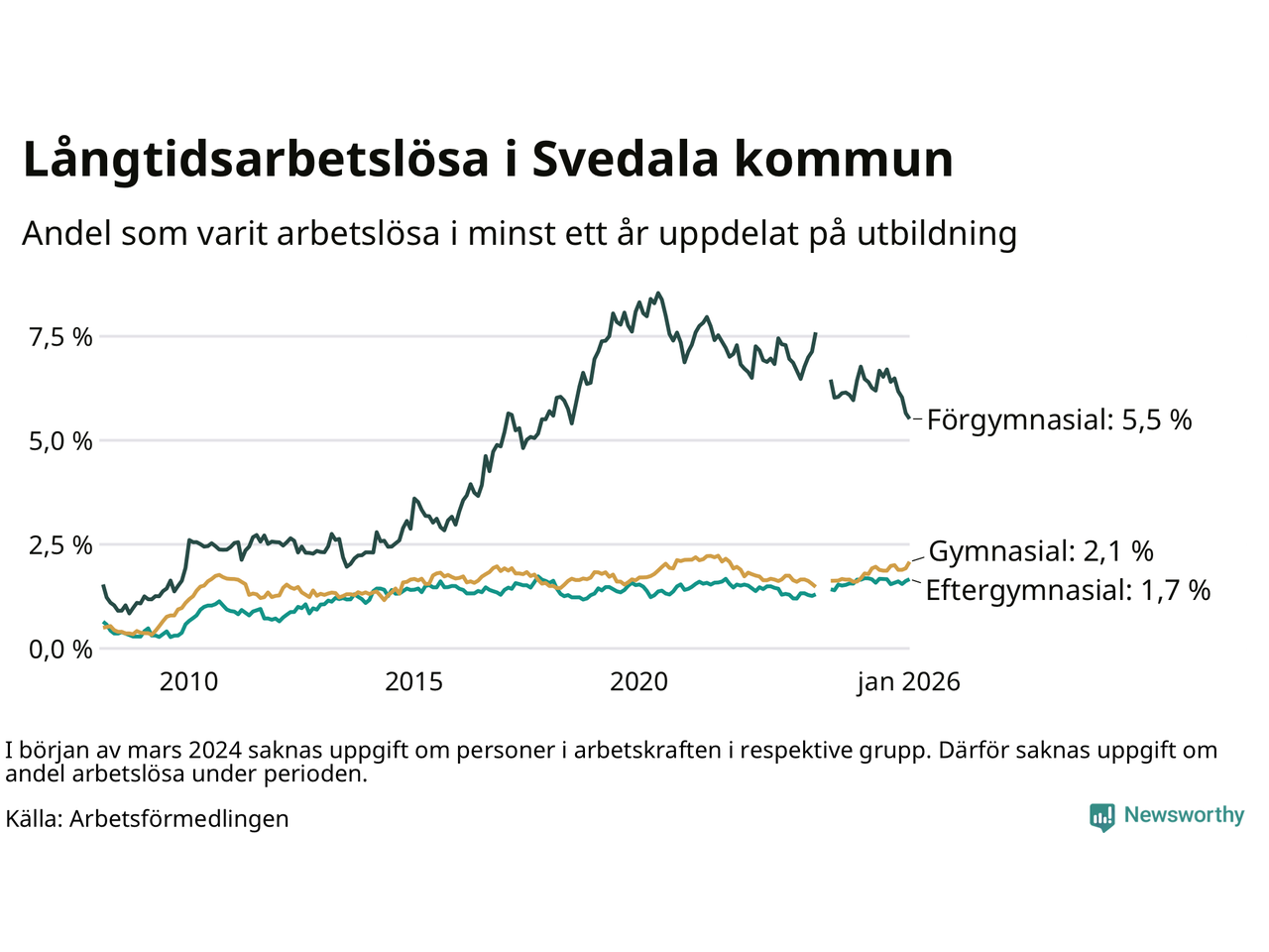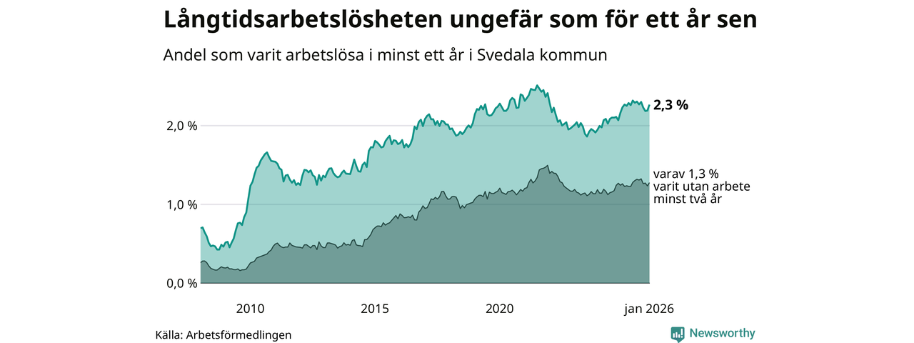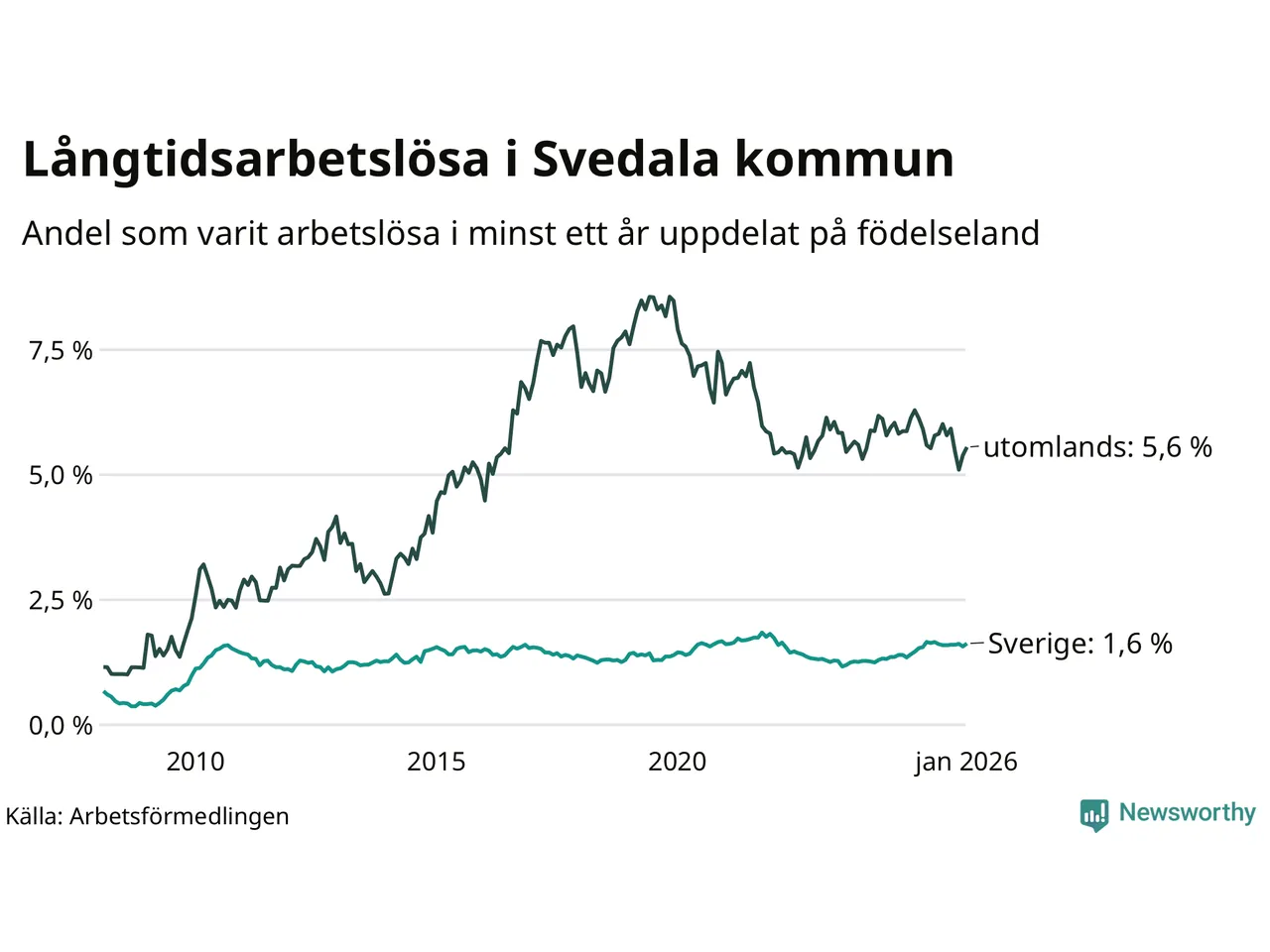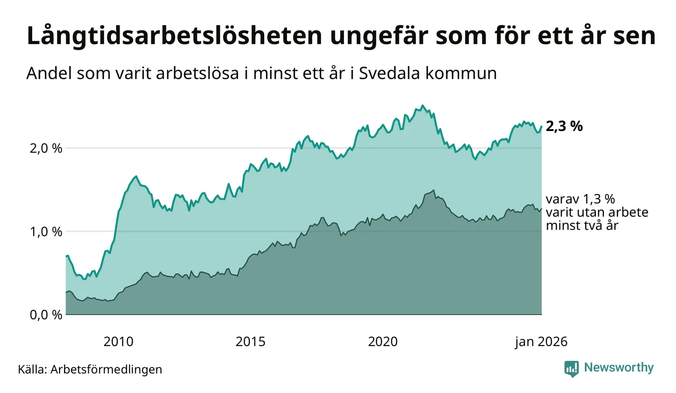 I januari hade 270 Svedalabor varit arbetslösa i minst ett år, vilket är elva fler än månaden innan. 270 personer motsvarar 2,3 procent av arbetskraften i kommunen – andelen långtidsarbetslösa är ungefär på samma nivå som för ett år sedan.