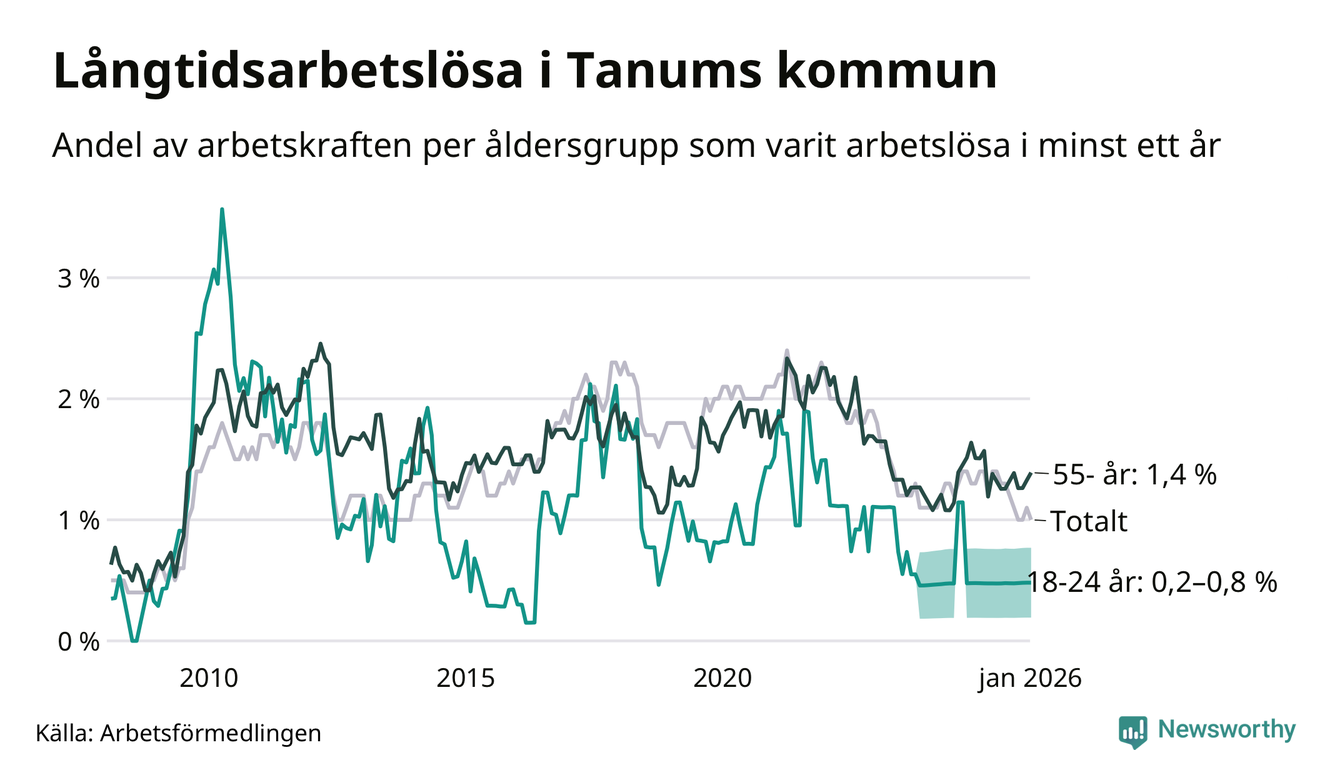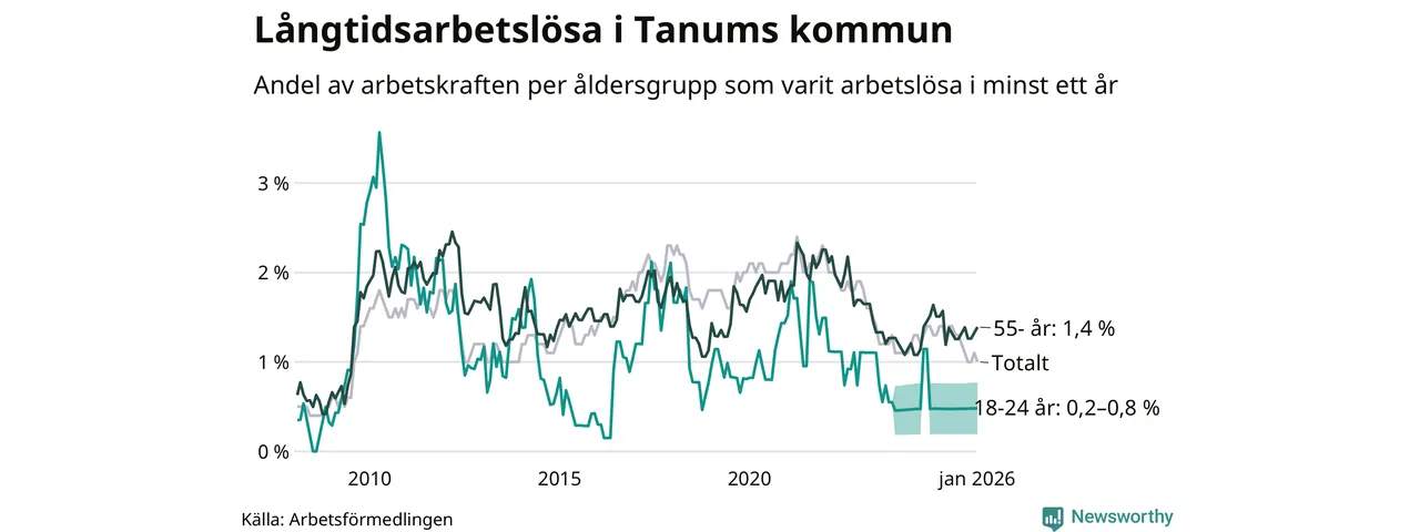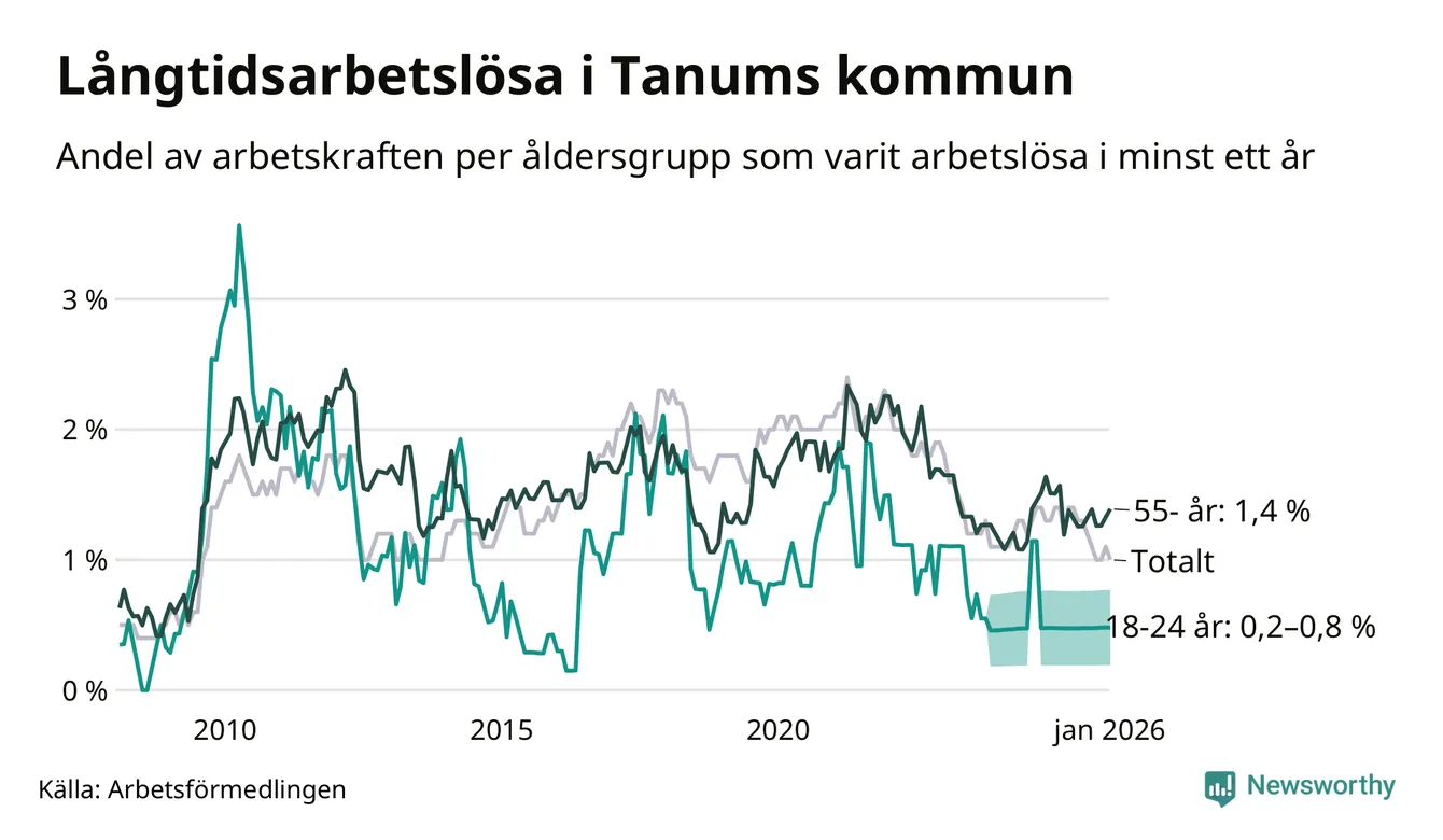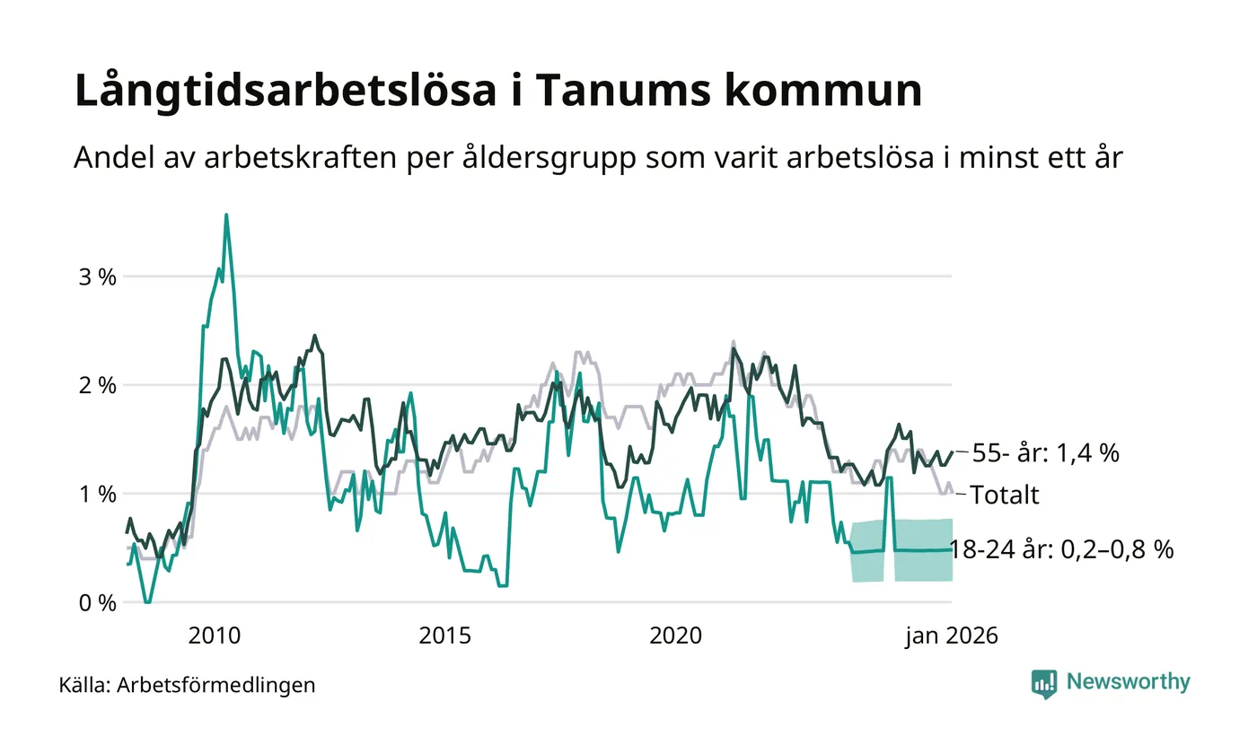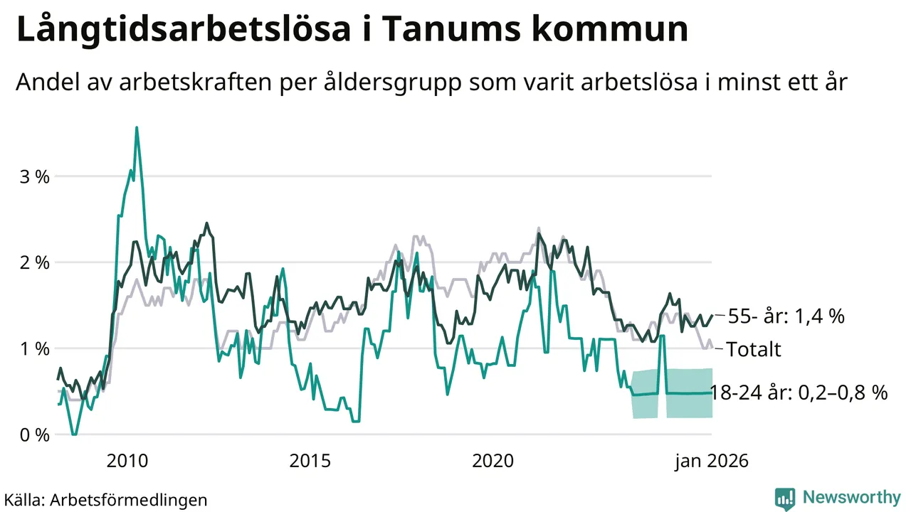 Av de 59 personerna som varit arbetslösa i mer än ett år i Tanums kommun är 22 personer mellan 55 och 661 år och mellan en och fyra är mellan 18 och 24 år. För den äldre gruppen är andelen arbetslösa 1,4 procent medan den i den yngre gruppen är mellan 0,2 och 0,8 procent. Även i riket som helhet är långtidsarbetslösheten högre i gruppen äldre.