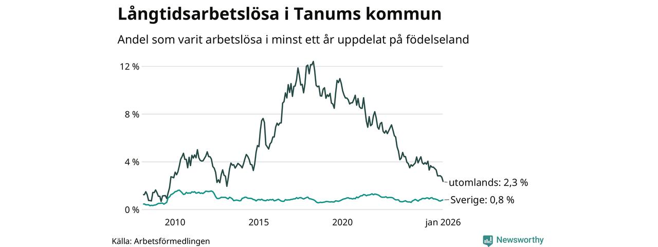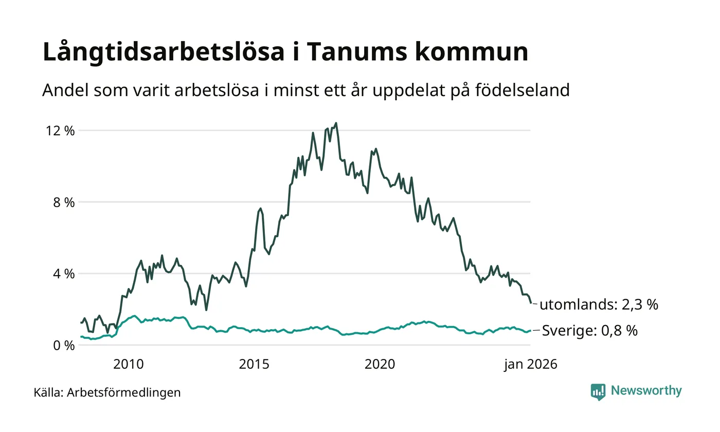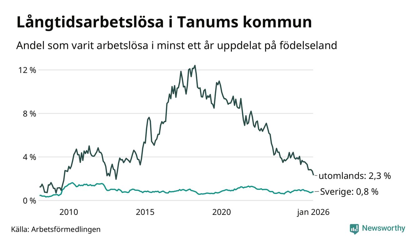40 av de långtidsarbetslösa i Tanum är födda i Sverige, medan 19 är födda utomlands. Det innebär att långtidsarbetslösheten bland Sverigefödda är 0,8 procent, medan den är tre gånger så hög – 2,3 procent – bland födda utomlands. Även i riket som helhet är arbetslösheten högre bland utrikesfödda.