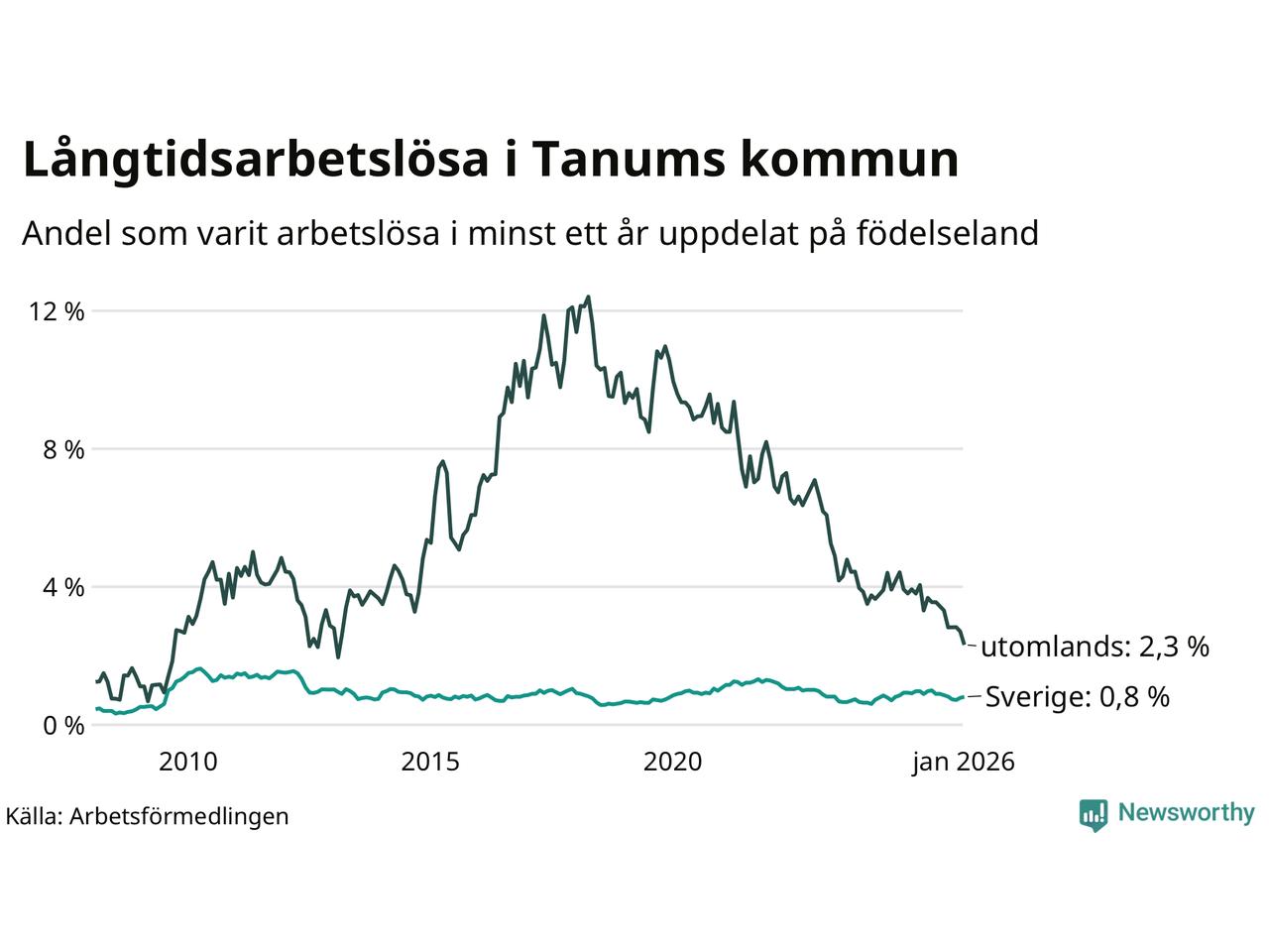 I januari hade 59 Tanumsbor varit arbetslösa i minst ett år, vilket är en färre än månaden innan. 59 personer motsvarar 1,0 procent av arbetskraften i kommunen – andelen långtidsarbetslösa är 0,4 procentenheter lägre än samma månad för ett år sedan. Tanum tillhör de kommuner som har lägst andel långtidsarbetslösa i hela landet just nu.
