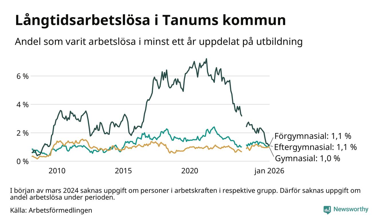 Andelen långtidsarbetslösa i Tanum är den näst lägsta i Västra Götalands län, bara i Öckerö är andelen lägre (0,9 procent). I Gullspång finns länets högsta långtidsarbetslöshet, 4,4 procent. I Västra Götaland som helhet hade 22 905 personer (2,5 procent) varit arbetslösa i minst ett år i januari. Det är 343 personer fler än månaden innan.