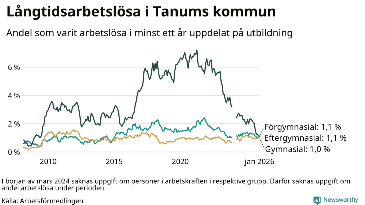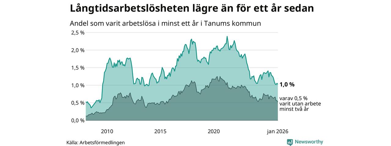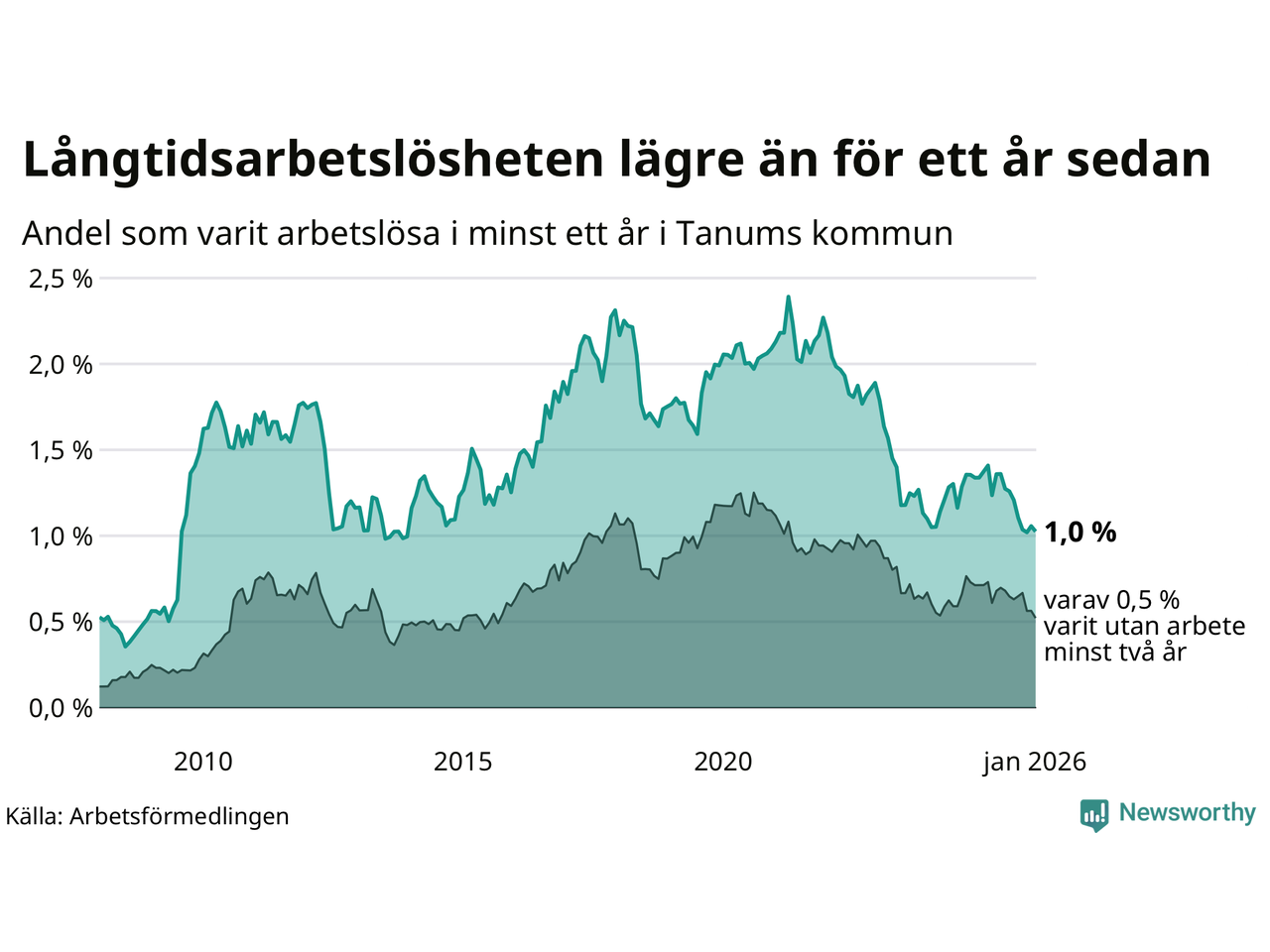 Andelen som varit utan arbete i minst ett år i Tanum var lägre i januari jämfört med samma månad för ett år sedan. Det visar Arbetsfömedlingens senaste månadsstatistik.