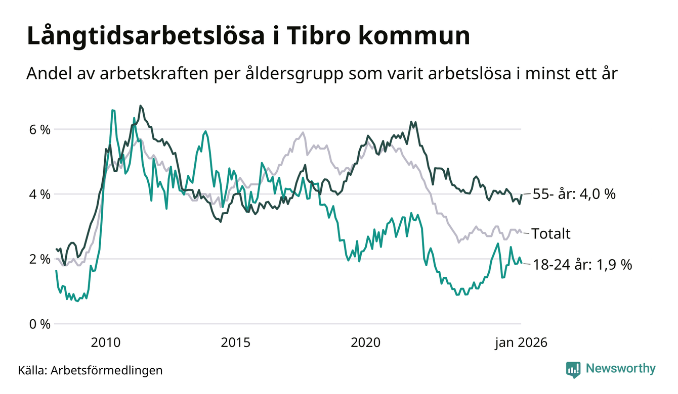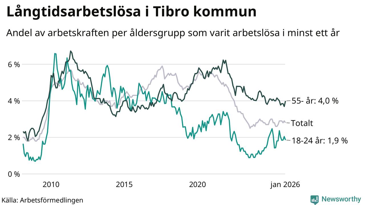 Av de 153 personerna som varit arbetslösa i mer än ett år i Tibro kommun är 52 personer mellan 55 och 661 år och tio är mellan 18 och 24 år. För den äldre gruppen är andelen arbetslösa 4,0 procent medan den i den yngre gruppen är 1,9 procent. Även i riket som helhet är långtidsarbetslösheten högre i gruppen äldre.
