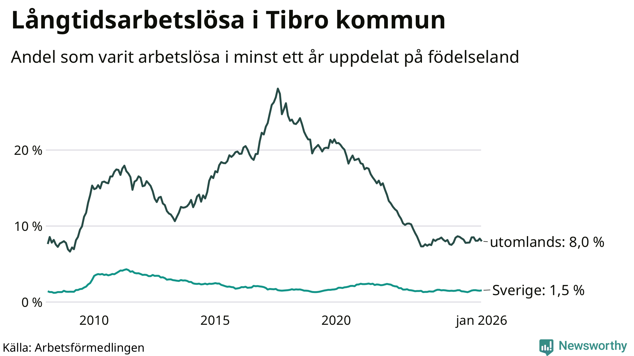 Graf: Andel arbetslösa uppdelat på födelseland i Tibro