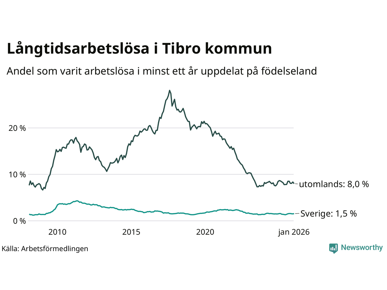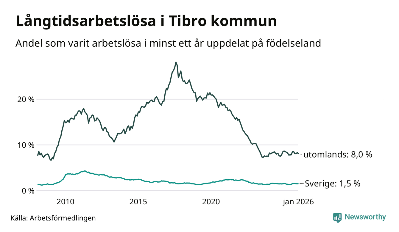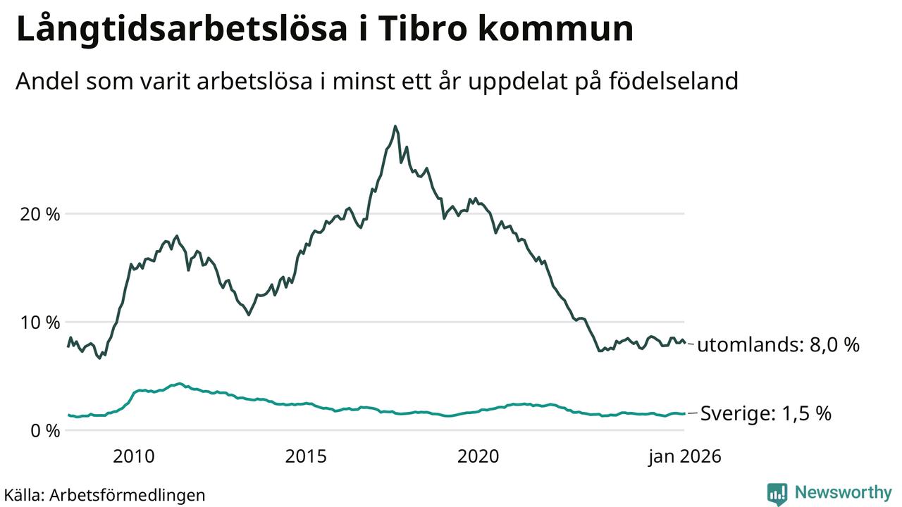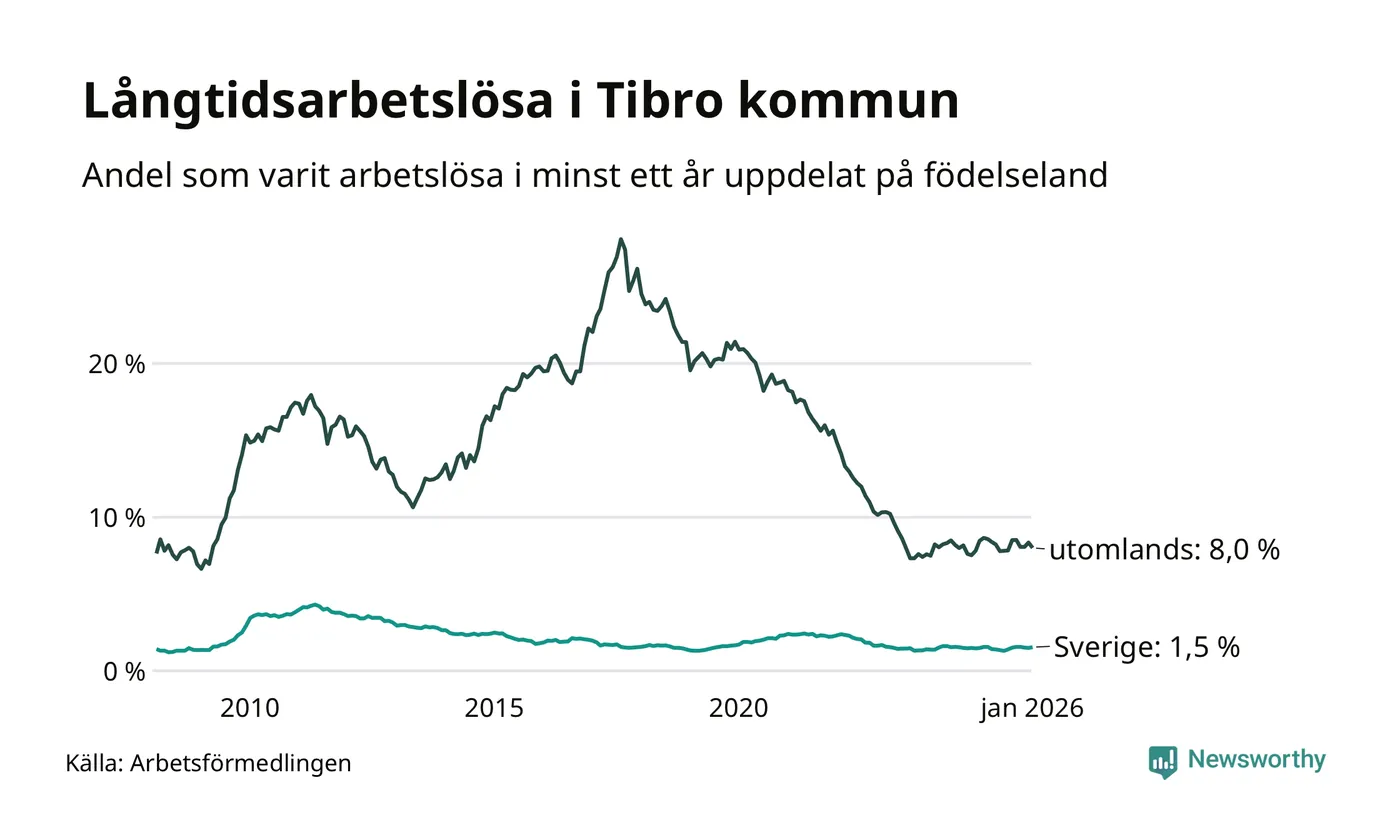 67 av de långtidsarbetslösa i Tibro är födda i Sverige, medan 86 är födda utomlands. Det innebär att långtidsarbetslösheten bland Sverigefödda är 1,5 procent, medan den är fem gånger så hög – 8,0 procent – bland födda utomlands. Även i riket som helhet är arbetslösheten högre bland utrikesfödda.