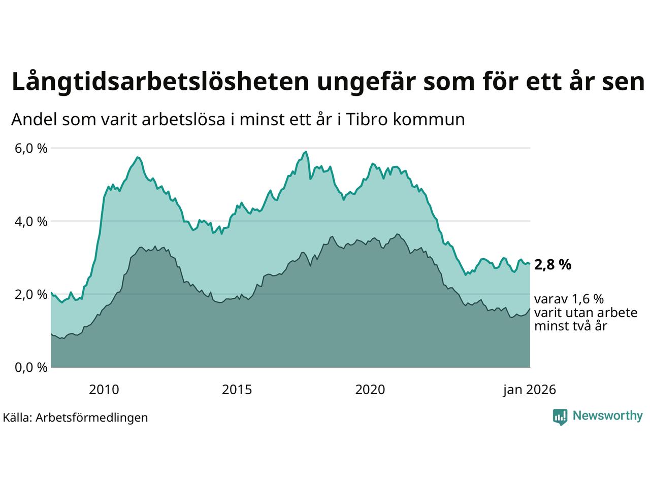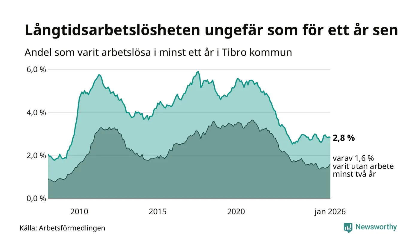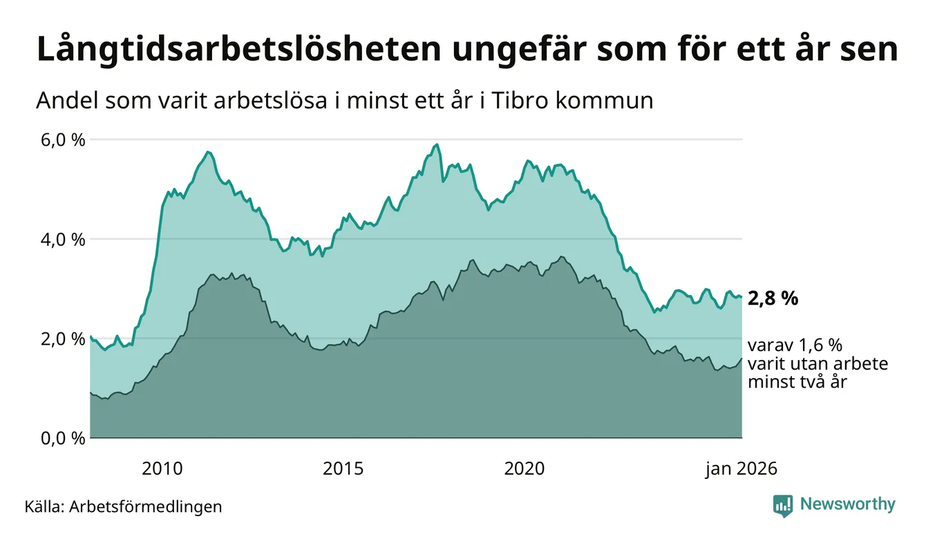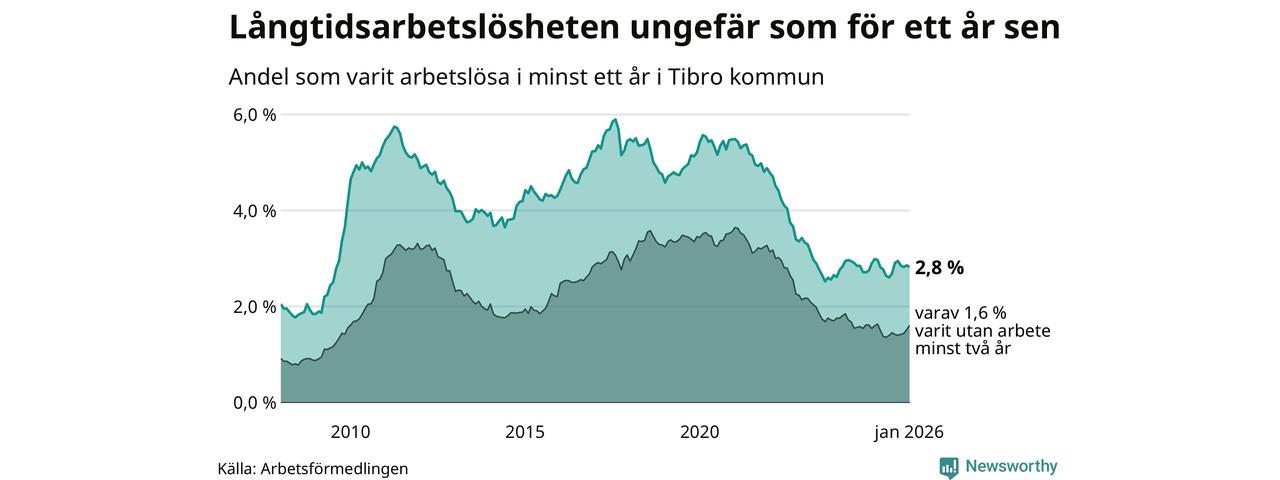 I januari hade 153 Tibrobor varit arbetslösa i minst ett år, vilket är lika många som månaden innan. 153 personer motsvarar 2,8 procent av arbetskraften i kommunen – andelen långtidsarbetslösa är ungefär på samma nivå som för ett år sedan.