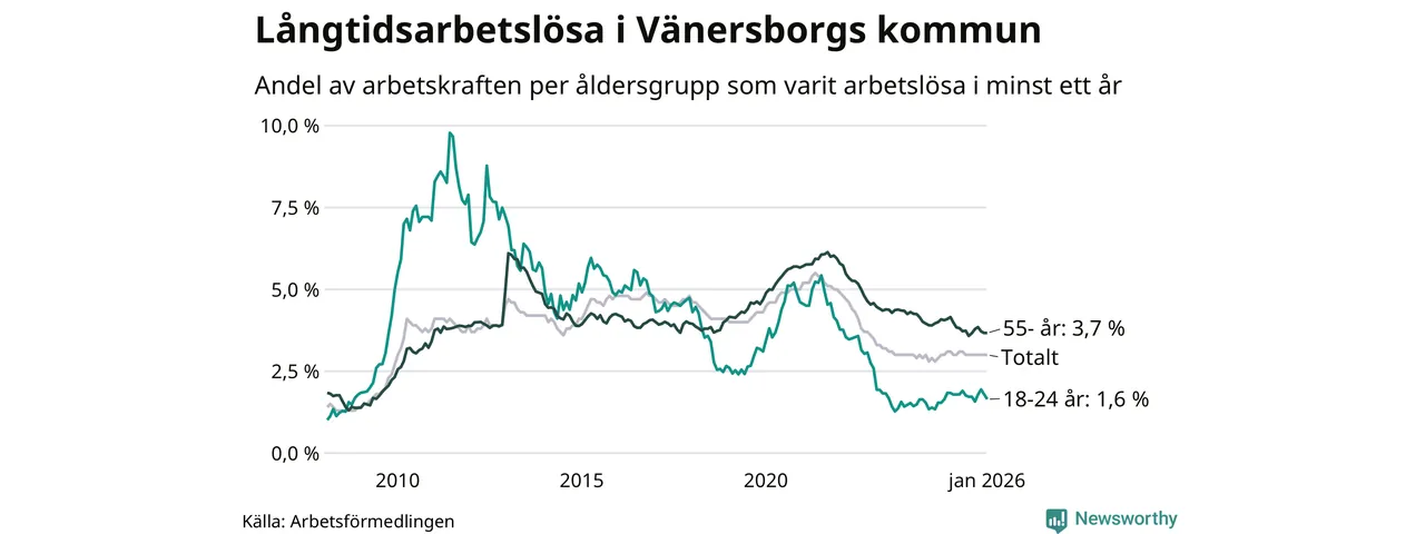 Av de 568 personerna som varit arbetslösa i mer än ett år i Vänersborgs kommun är 170 personer mellan 55 och 661 år och 32 är mellan 18 och 24 år. För den äldre gruppen är andelen arbetslösa 3,7 procent medan den i den yngre gruppen är 1,6 procent. Även i riket som helhet är långtidsarbetslösheten högre i gruppen äldre.