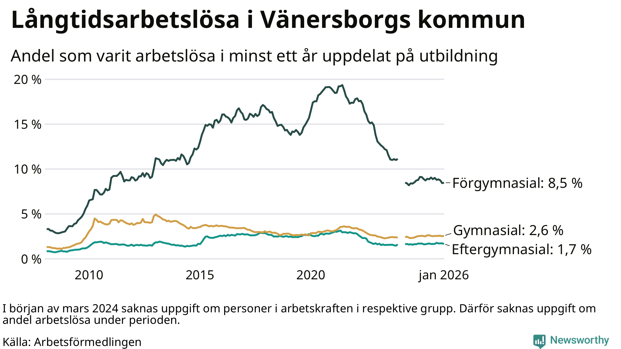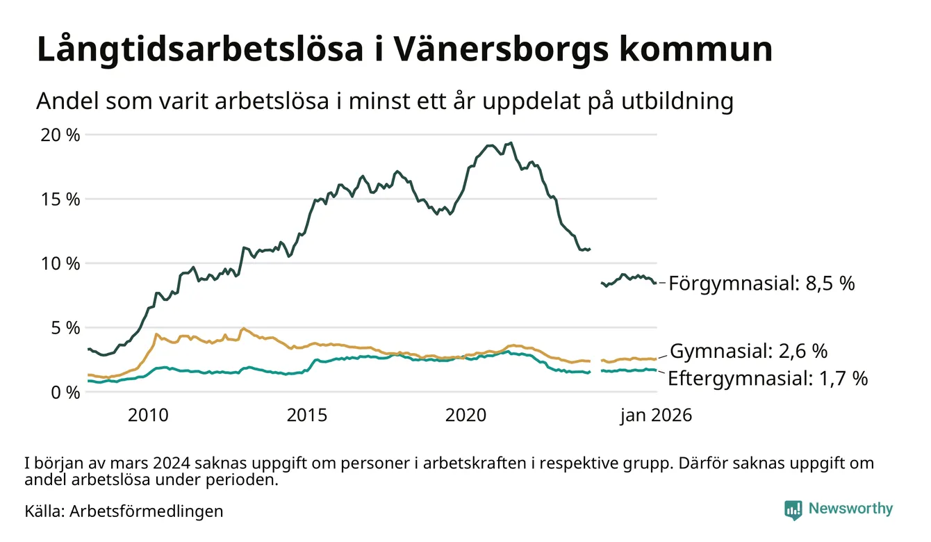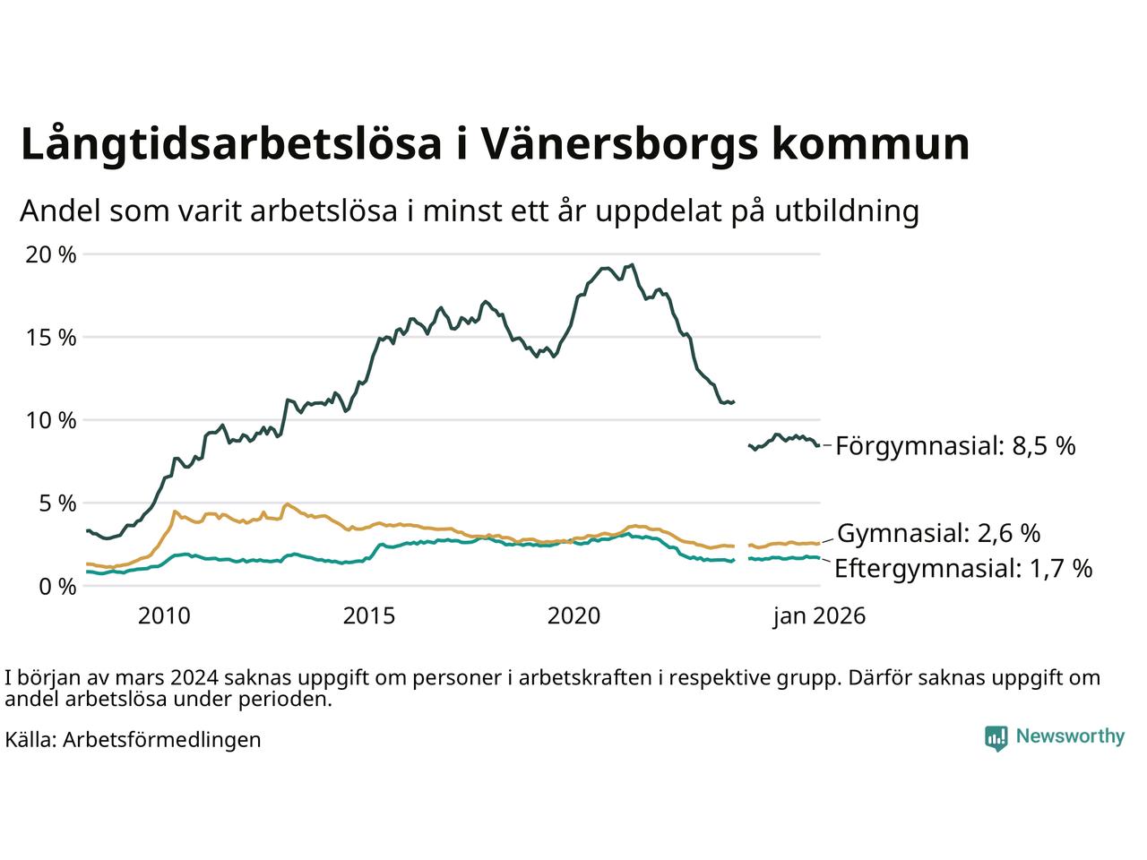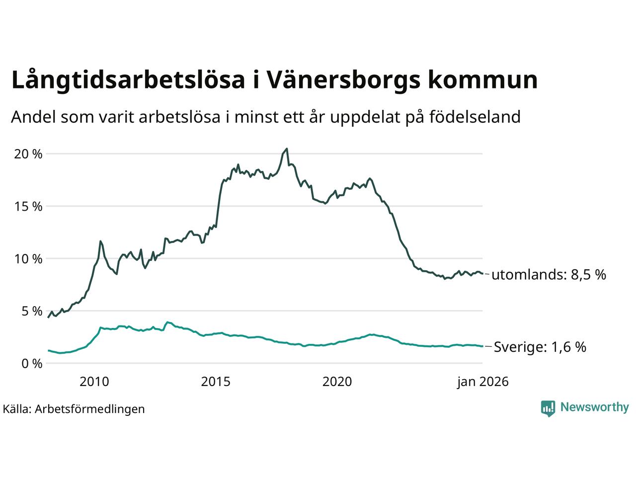 I januari hade 568 Vänersborgsbor varit arbetslösa i minst ett år, vilket är fem fler än månaden innan. 568 personer motsvarar 3,0 procent av arbetskraften i kommunen – andelen långtidsarbetslösa är ungefär på samma nivå som för ett år sedan.