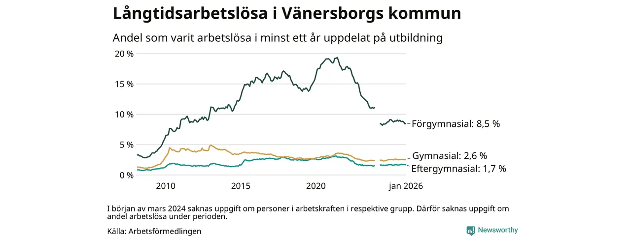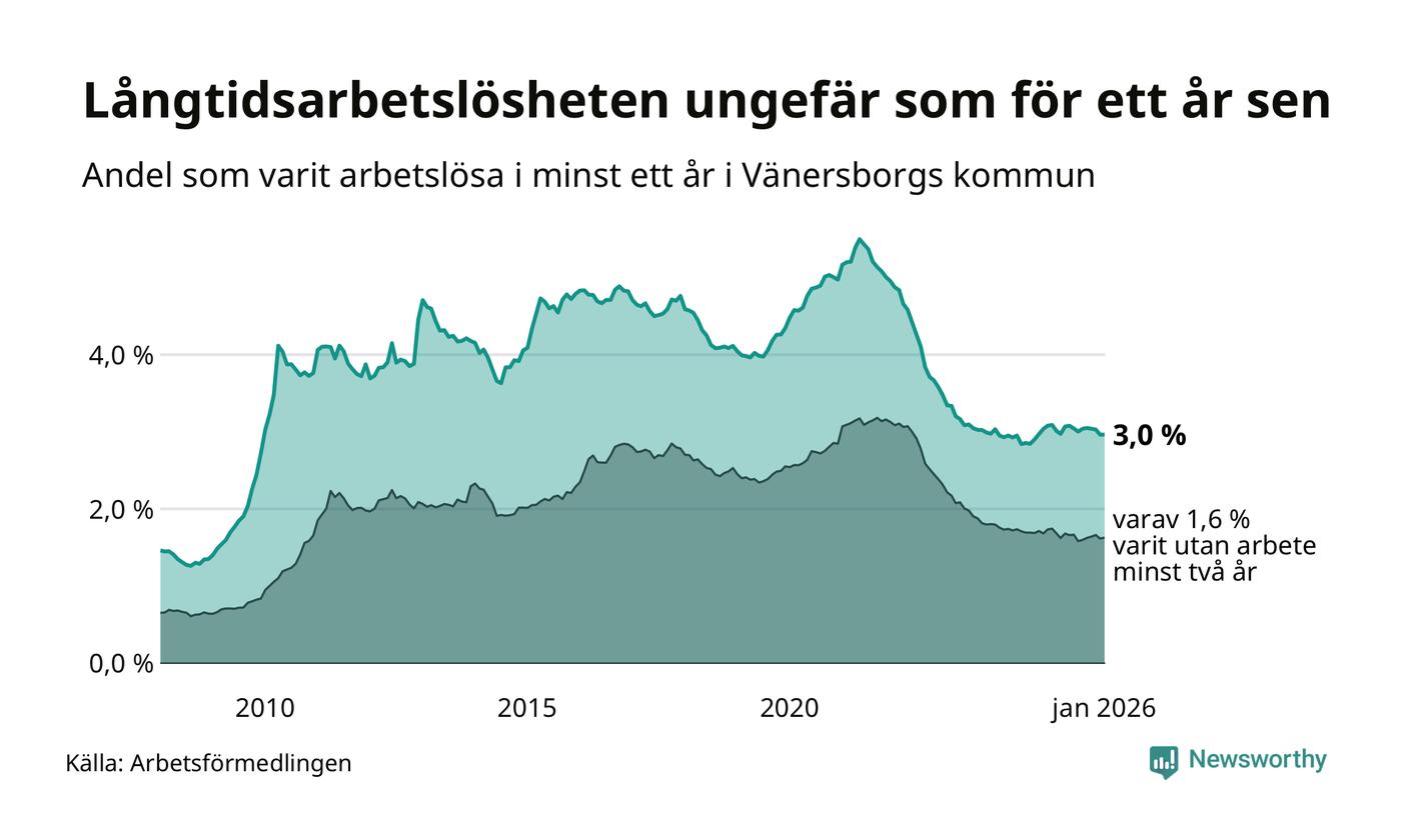Andelen som varit utan arbete i minst ett år i Vänersborg var ungefär lika stor i januari jämfört med samma månad för ett år sedan. Det visar Arbetsfömedlingens senaste månadsstatistik.