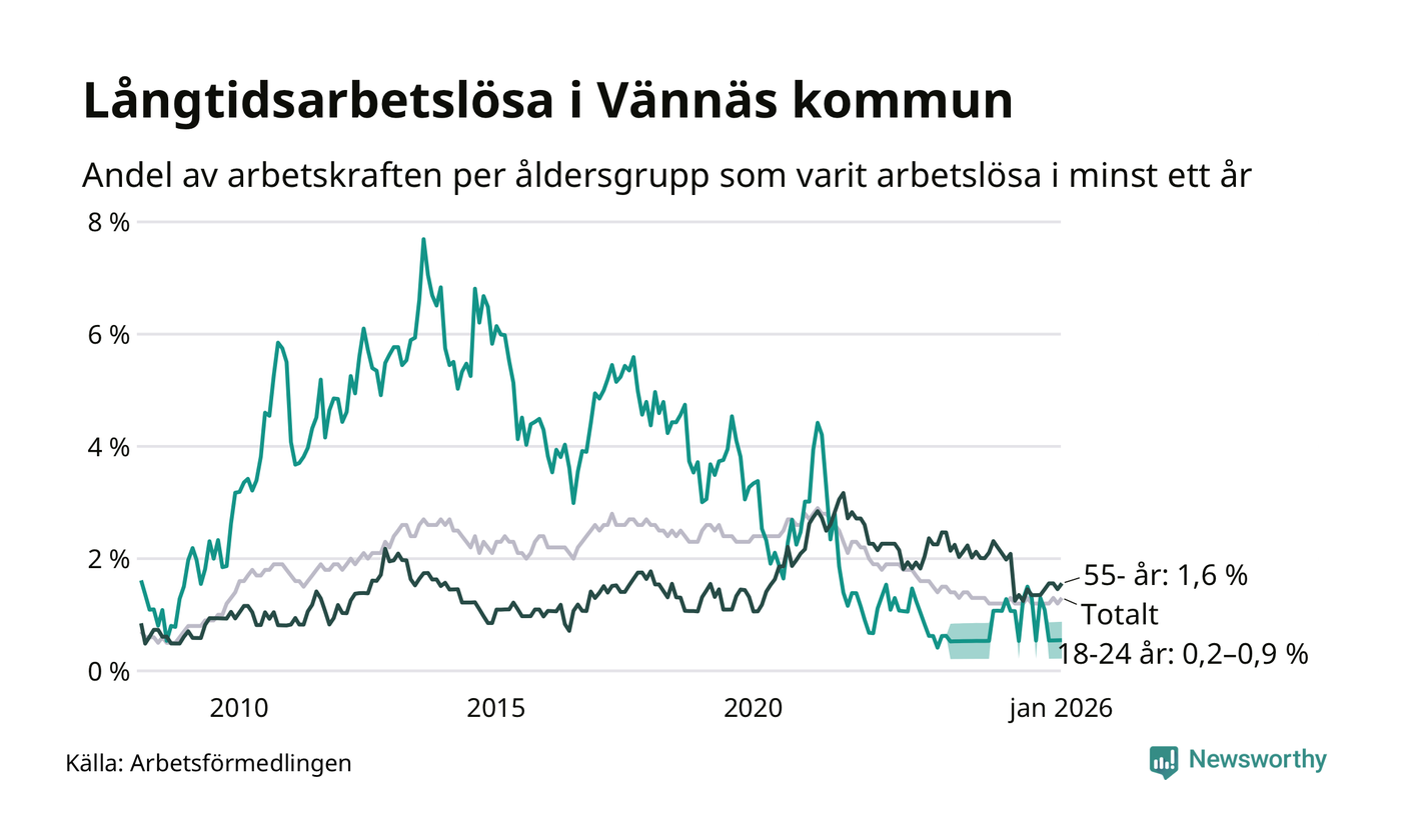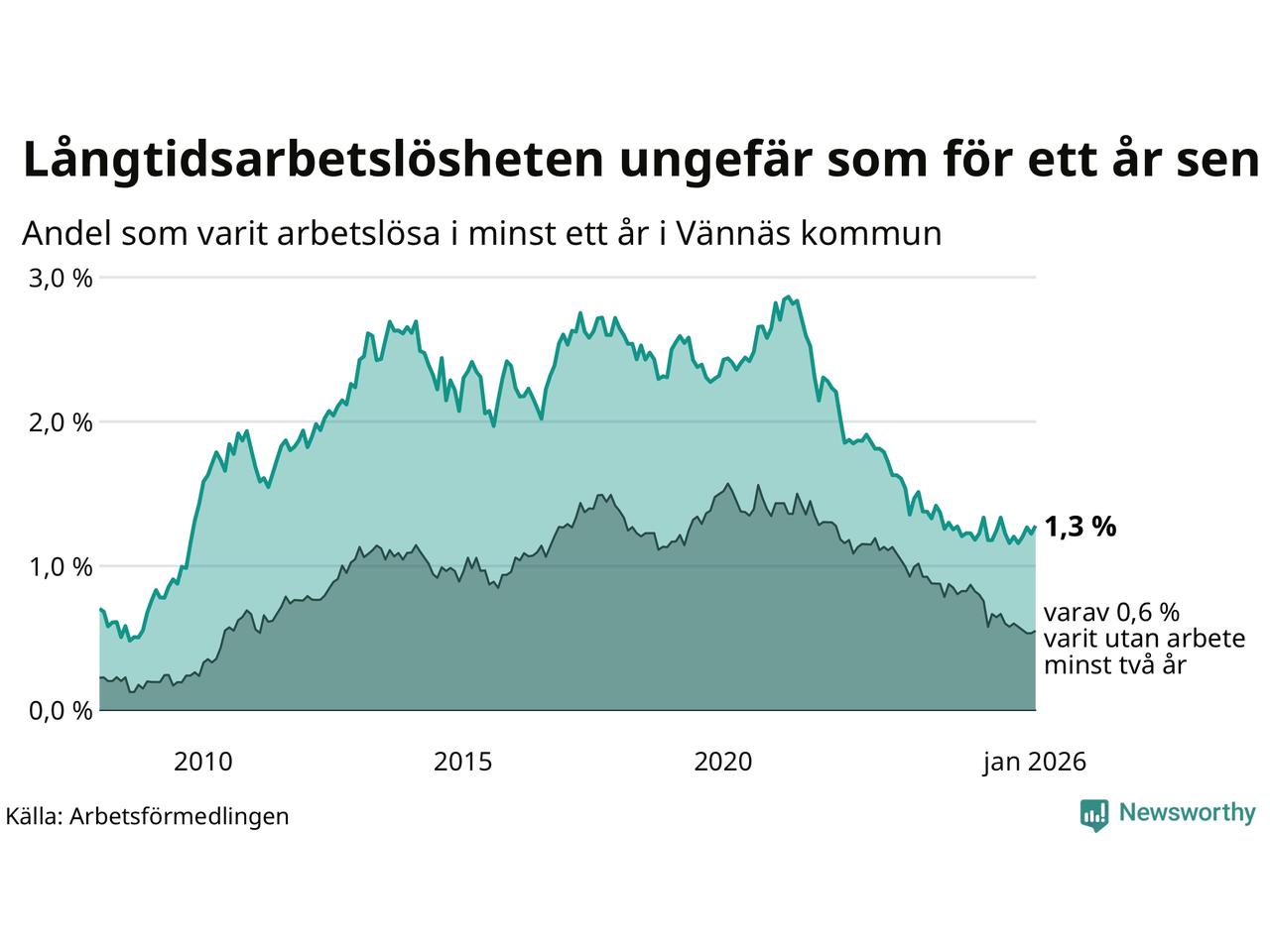 I januari hade 58 Vännäsbor varit arbetslösa i minst ett år, vilket är tre fler än månaden innan. 58 personer motsvarar 1,3 procent av arbetskraften i kommunen – andelen långtidsarbetslösa är ungefär på samma nivå som för ett år sedan.