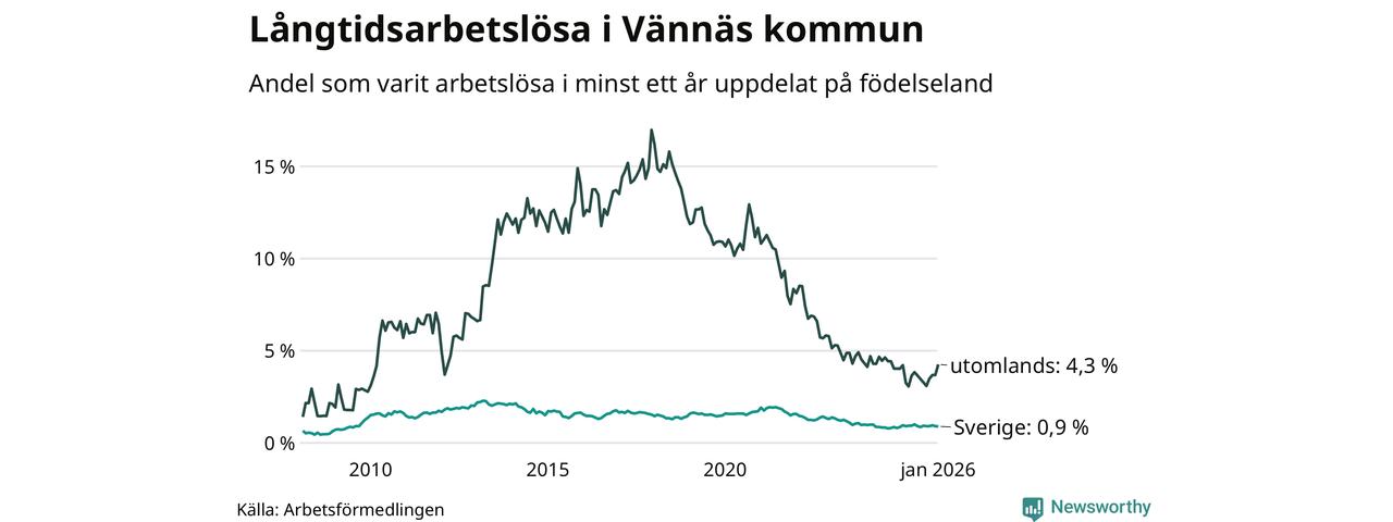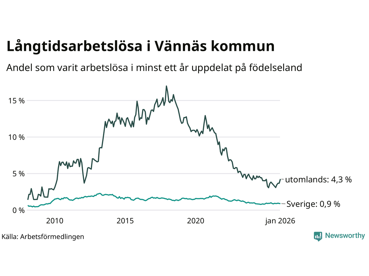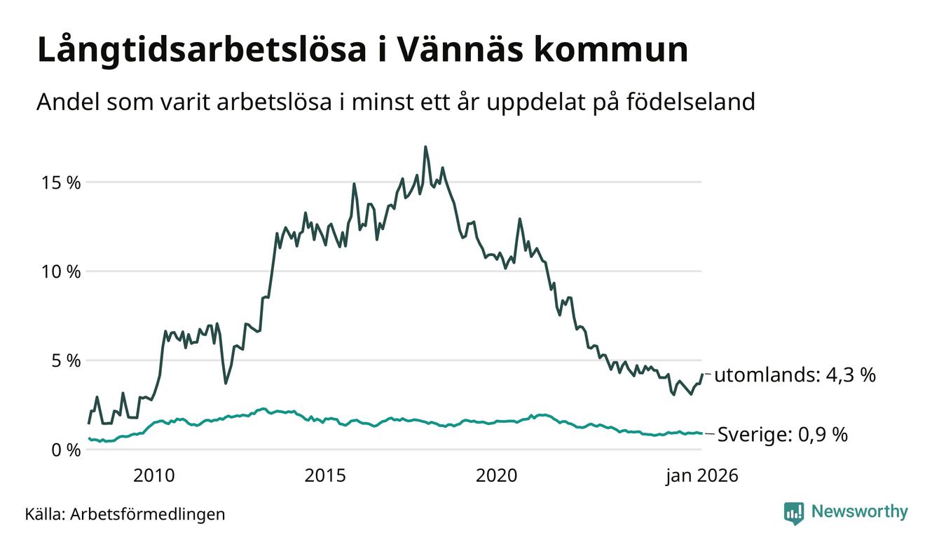 36 av de långtidsarbetslösa i Vännäs är födda i Sverige, medan 22 är födda utomlands. Det innebär att långtidsarbetslösheten bland Sverigefödda är 0,9 procent, medan den är fem gånger så hög – 4,3 procent – bland födda utomlands. Även i riket som helhet är arbetslösheten högre bland utrikesfödda.