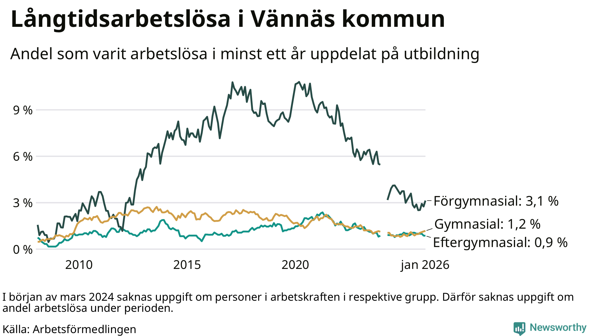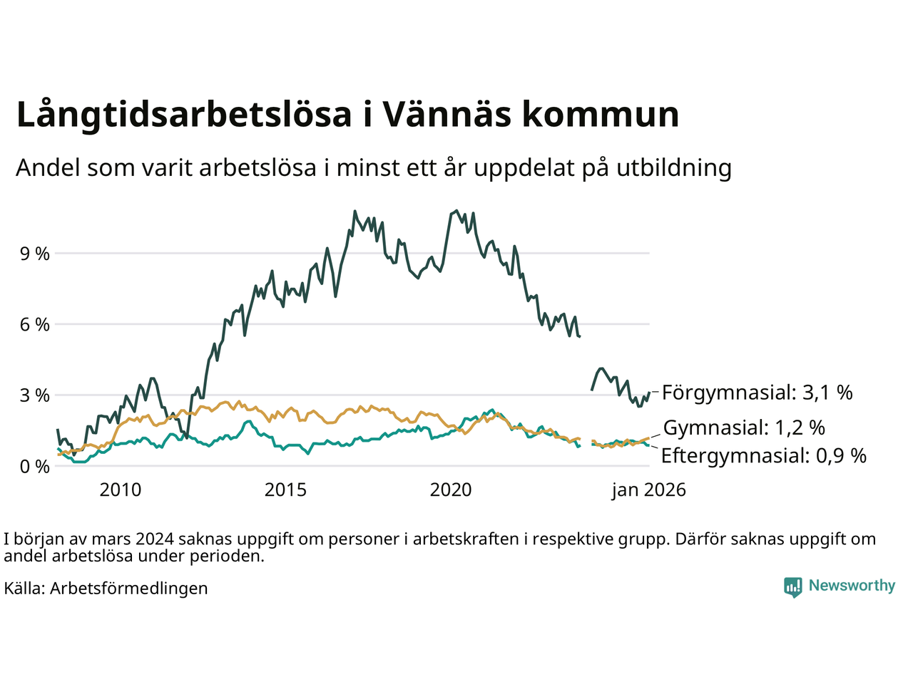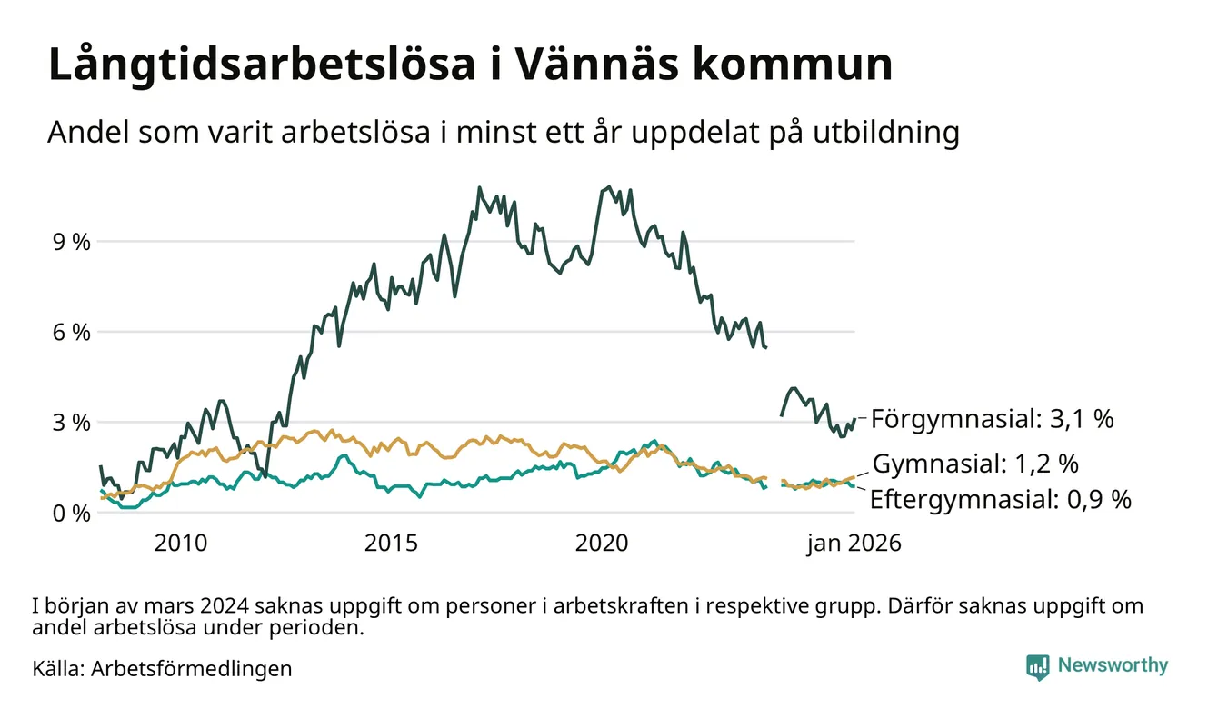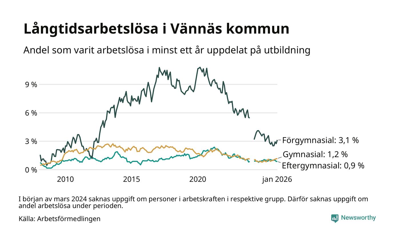 Graf: Andel arbetslösa i Vännäs som varit utan arbete i minst 12 månader